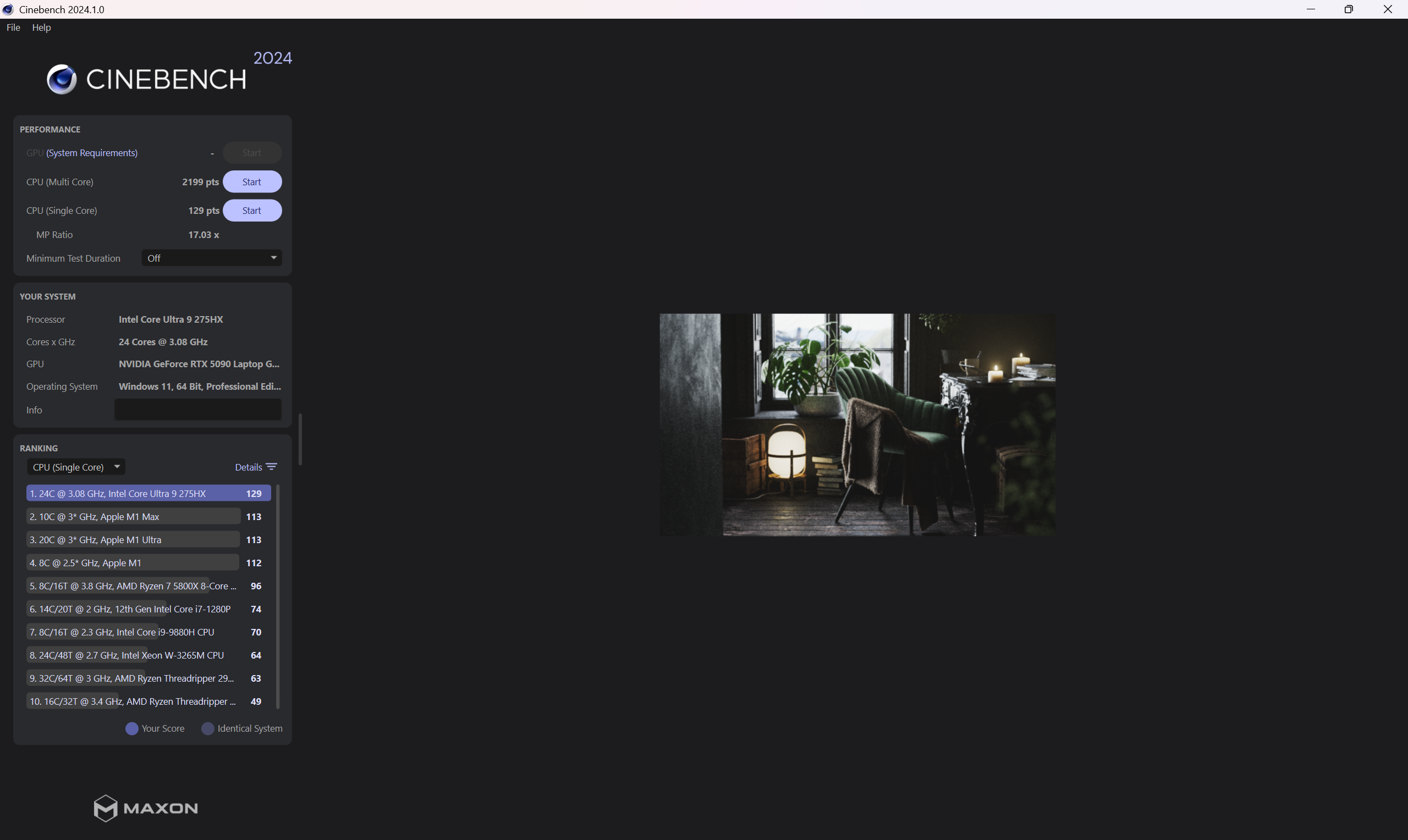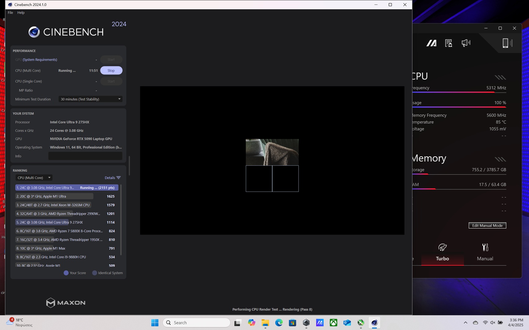 Τρέξαμε το Cinebench 2024 για να δούμε τις επιδόσεις του αλλά και κατά πόσο φτάνει στις μέγιστες συχνότητες και πήραμε 2199/2025/1081 πόντους στο multiscore σε Turbo/Performance/Silent αντίστοιχα. Τρέχοντας το ίδιο τεστ εκτός ρεύματος, στο Performance πήραμε 1114 πόντους, κάτι που δείχνει ότι πρακτικά ο επεξεργαστής χάνεις τις μισές επιδόσεις του όταν είναι με τη μπαταρία. Κάτι που όμως σπάνια θα κάνει κανείς. Το single core σκορ ήταν πάντα 128-129 πόντοι.