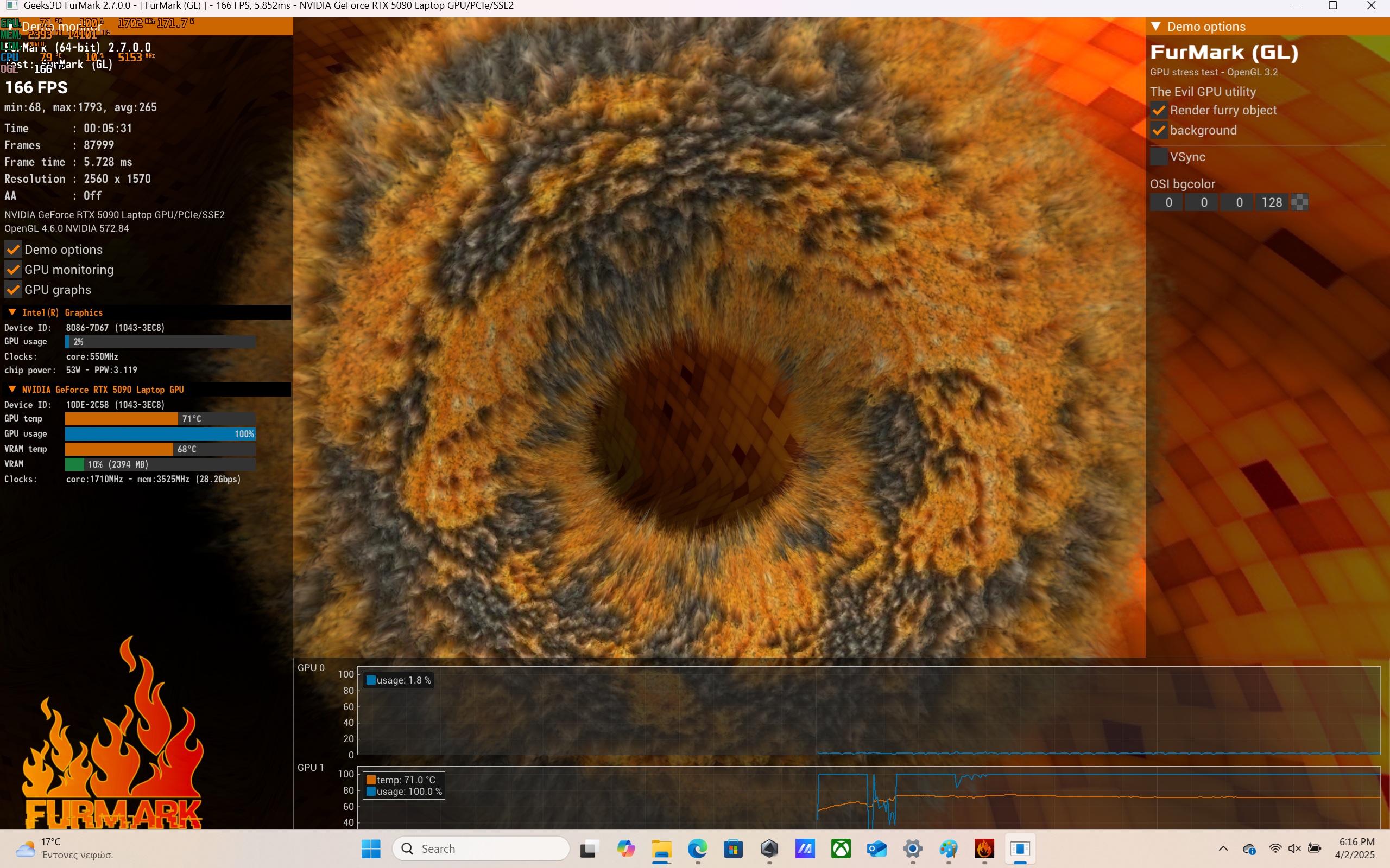 Το ASUS ROG Strix Scar 18 έρχεται με δυο ενσωματωμένα υποσυστήματα γραφικών, το ενσωματωμένο στον επεξεργαστή της Intel που χρησιμοποιείται κατά τη χρήση του λειτουργικού συστήματος και μοιράζεται τη μνήμη του υπολογιστή και μια Nvidia RTX5090 (mobile) με 25GB μνήμης GDDR7 και TDP στα 150Wat (και άλλα 25Watt διαθέσιμα σαν boost). Οι δυο κάρτες συνεργάζονται μεταξύ τους μέσω της τεχνολογίας Optimus με την Asus πάντως να προσφέρει στο χρήστη περισσότερες επιλογές. Υπό κανονικές συνθήκες, το υποσύστημα της Intel χρησιμοποιείται σε περιβάλλον Windows και αυτό της Nvidia αξιοποιείται στα games, με την αλλαγή να γίνεται αυτόματα. Ωστόσο, μέσα από το Armory Core υπάρχει το Ultimate GPU mode (το παλιό γνωστός Mux switch), μέσω του οποίου μπορούμε να απενεργοποιήσουμε πλήρως την Intel GPU και να έχουμε σε χρήση αποκλειστικά την RTX5090, ώστε αυτή να χρησιμοποιείται συνεχώς. Και η αλήθεια είναι πως κάτι τέτοιο είναι προτιμότερο όταν το σύστημα είναι συνδεδεμένο στη πρίζα, προσφέροντας μάλιστα καλύτερες επιδόσεις (6-10%). Σε κάθε περίπτωση, το υποσύστημα γραφικών της nvidia προφανώς και μπορεί να προσφέρει εξαιρετικές επιδόσεις ακόμα και στη native ανάλυση της οθόνης. Να σημειώσουμε πάντως, για το θέμα της ονοματολογίας, πως η RTX5090 των laptop έχει τα ίδια specs με την RTX5080 για desktop, απλά λειτουργεί με περιορισμό στο TDP, κάτι που έχει ως αποτέλεσμα οι πραγματικές επιδόσεις της mobile RTX5090 να είναι αρκετά κάτω από αυτές της RTX5080 για dekstop. Ακόμα και έτσι πάντως, ο συνδυασμός της με το επεξεργαστή της Intel και η εξαιρετική ψύξης της Asus, κάνουν το laptop ένα gaming.. κτηνάκι.