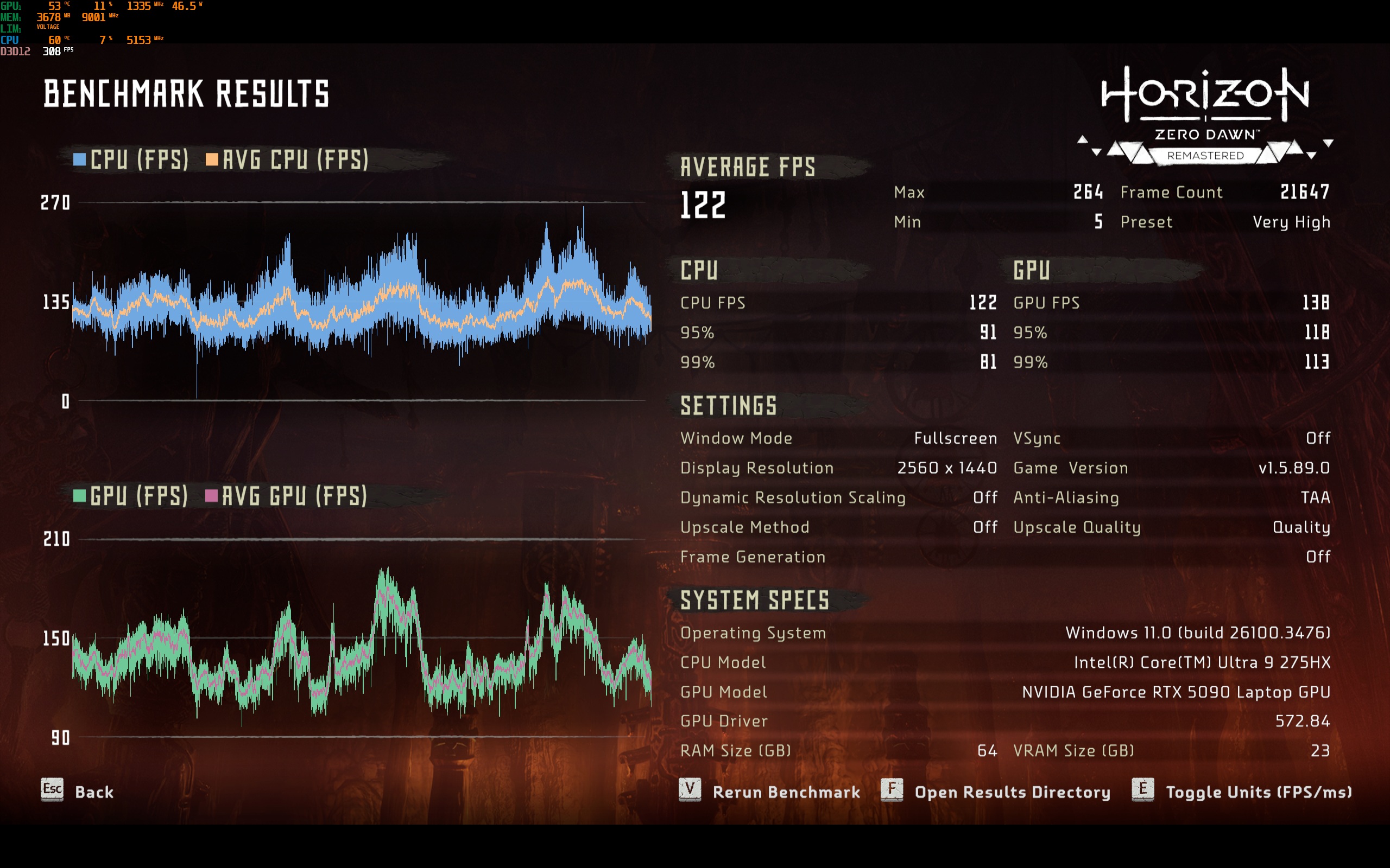 Συνεχίζουμε με το Horizon Zero Dawn Remastered σε Very High, πήραμε 122fps (desktop 135fps).