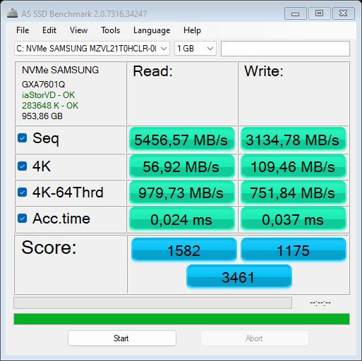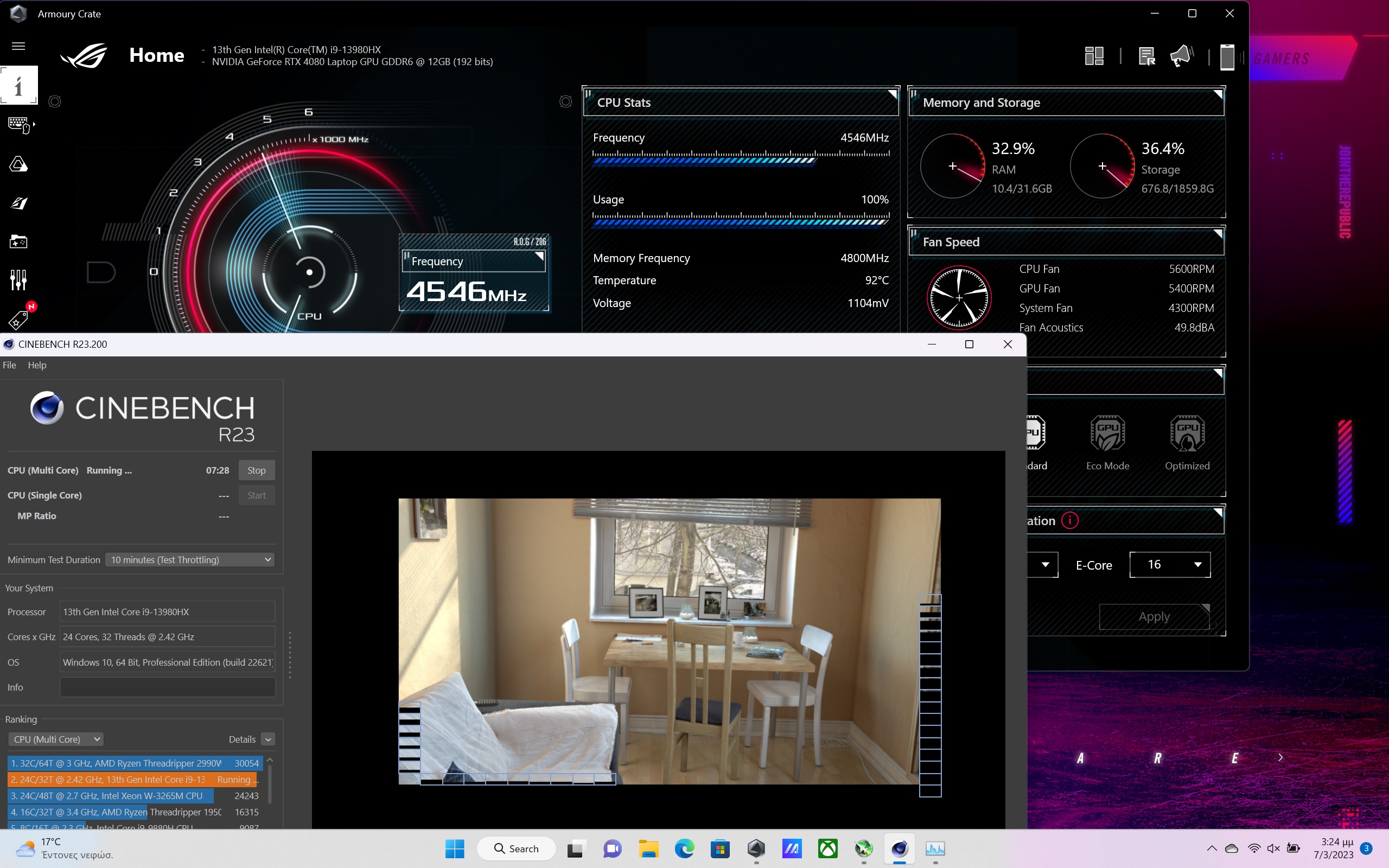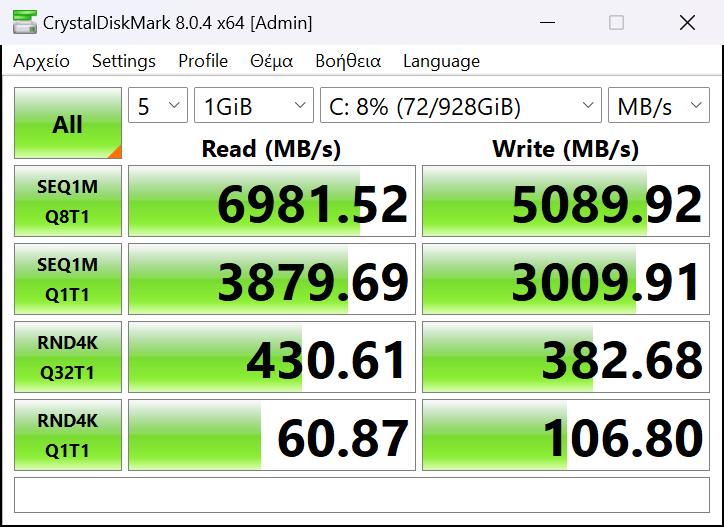 Όσον αφορά στον αποθηκευτικό χώρο τώρα, βρίσκουμε ένα γρήγορο δίσκο NVMe 1TB της Samsung, για τον οποίο μετρήσαμε περίπου 7GB/sec ταχύτητα ανάγνωσης και περίπου 5GB/sec όσον αφορά στην εγγραφή (σύμφωνα με το CrystalDiskMark). Τρέξαμε το Cinebench 23 για να δούμε τις επιδόσεις του αλλά και κατά πόσο φτάνει στις μέγιστες συχνότητες και πήραμε σκορ 28011, αποτέλεσμα που φέρνει το σύστημα να «κοντράρει» τον Threadripper των 64threads που έχει σαν παράδειγμα ηξ εφαρμογή πραγματικά εξαιρετικό αποτέλεσμα που δείχνει την ισχύ του επεξεργαστή σε λειτουργία multithreading. Ξανατρέχοντας το ίδιο τεστ αλλά έχοντας ενεργό το Turbo mode μέσα από το Armory Core, το αποτέλεσμα ανέβηκε στους 31270 πόντους!