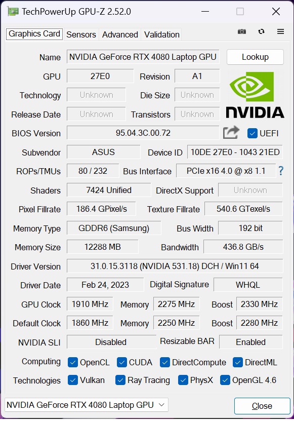 Το ASUS ROG Strix Scar 18 έρχεται με δυο ενσωματωμένα υποσυστήματα γραφικών, το ενσωματωμένο στον επεξεργαστή της Intel που χρησιμοποιείται κατά τη χρήση του λειτουργικού συστήματος και μοιράζεται τη μνήμη του υπολογιστή και μια Nvidia RTX4080 (mobile) με 12GB μνήμης GDDR6 και TDP στα 150Wat (και άλλα 25Watt διαθέσιμα σαν boost). Οι δυο κάρτες συνεργάζονται μεταξύ τους μέσω της τεχνολογίας Optimus με την Asus πάντως να προσφέρει στο χρήστη περισσότερες επιλογές από το συνηθισμένο, ανάλογα με το τι θέλει να κάνει. Υπό κανονικές συνθήκες, το υποσύστημα της Intel χρησιμοποιείται σε περιβάλλον Windows και αυτό της Nvidia αξιοποιείται στα games, με την αλλαγή να γίνεται αυτόματα. Ωστόσο, μέσα από το Armory Core υπάρχει το Ultimate GPU mode (το παλιό γνωστός Mux switch), μέσω του οποίου μπορούμε να απενεργοποιήσουμε πλήρως την Intel GPU και να έχουμε σε χρήση αποκλειστικά την RTX4080, ώστε αυτή να χρησιμοποιείται συνεχώς. Και η αλήθεια είναι πως κάτι τέτοιο είναι προτιμότερο όταν το σύστημα είναι συνδεδεμένο στη πρίζα, προσφέροντας μάλιστα καλύτερες επιδόσεις (6-10%).