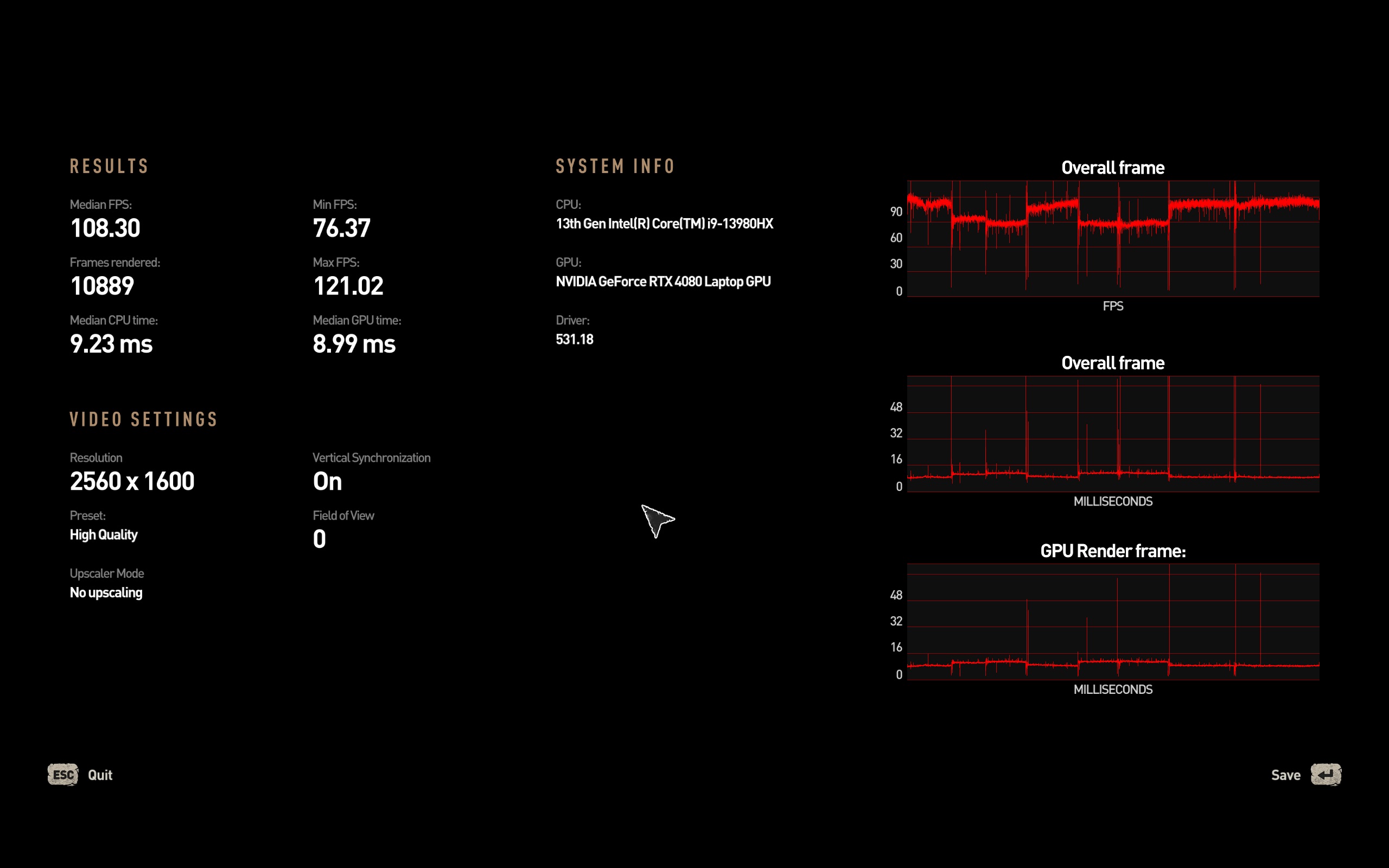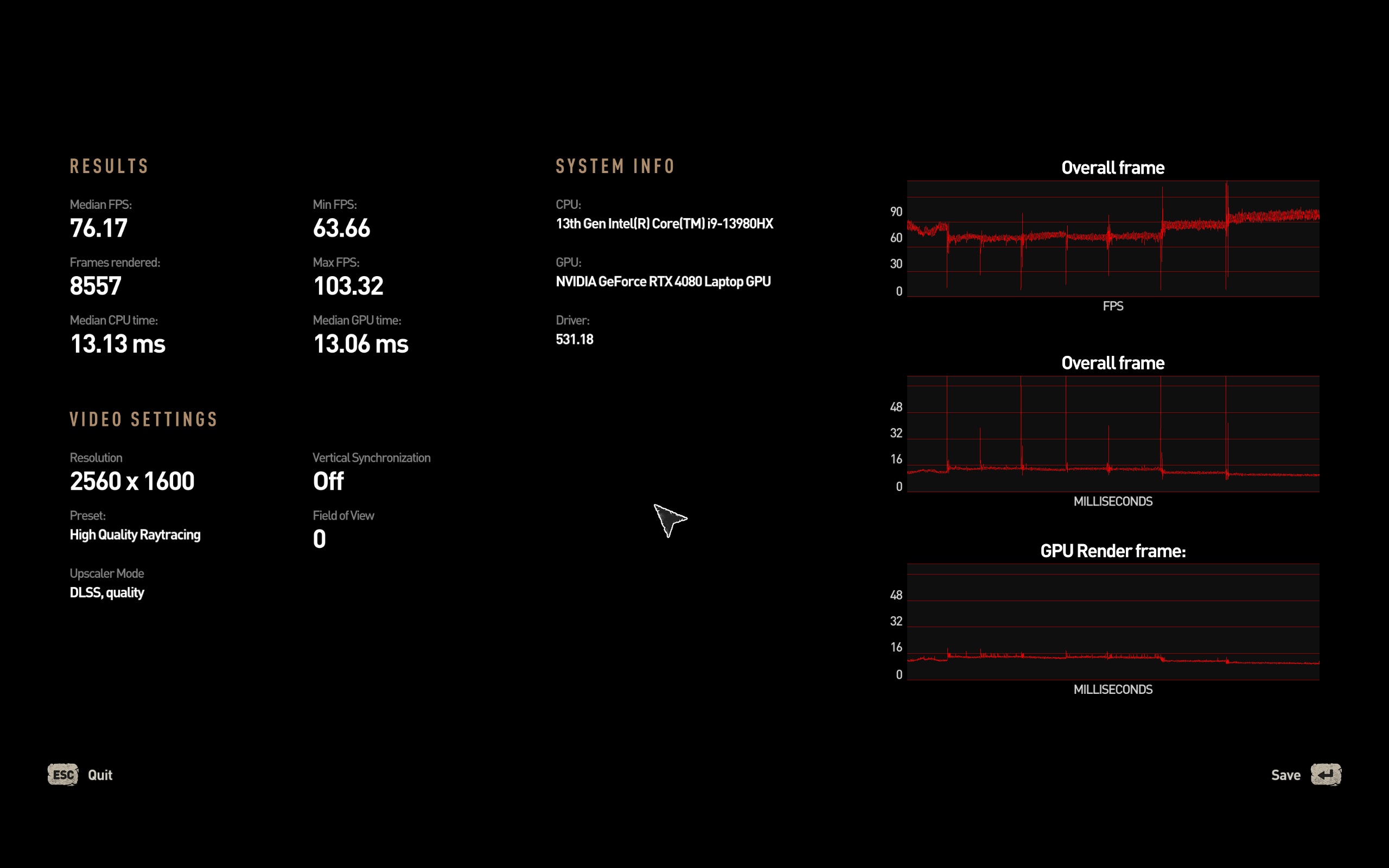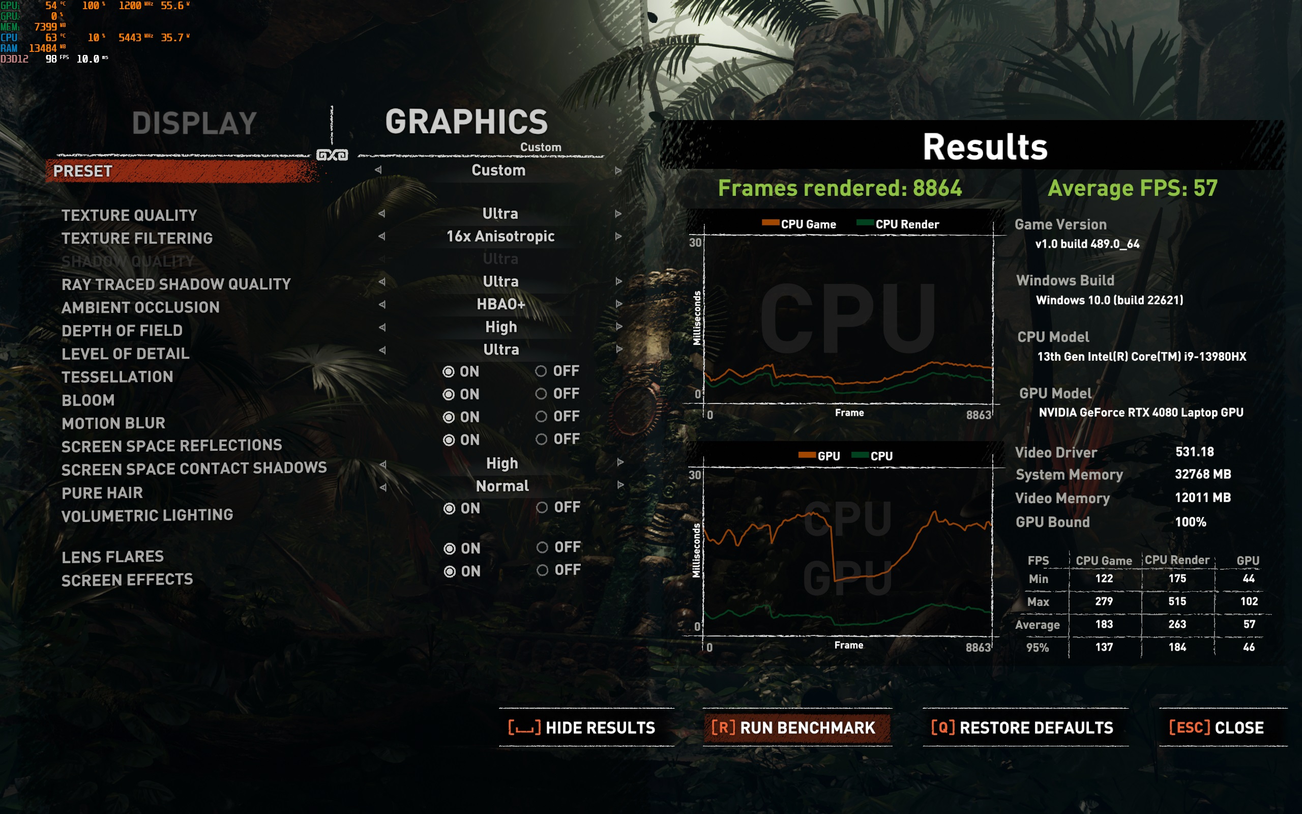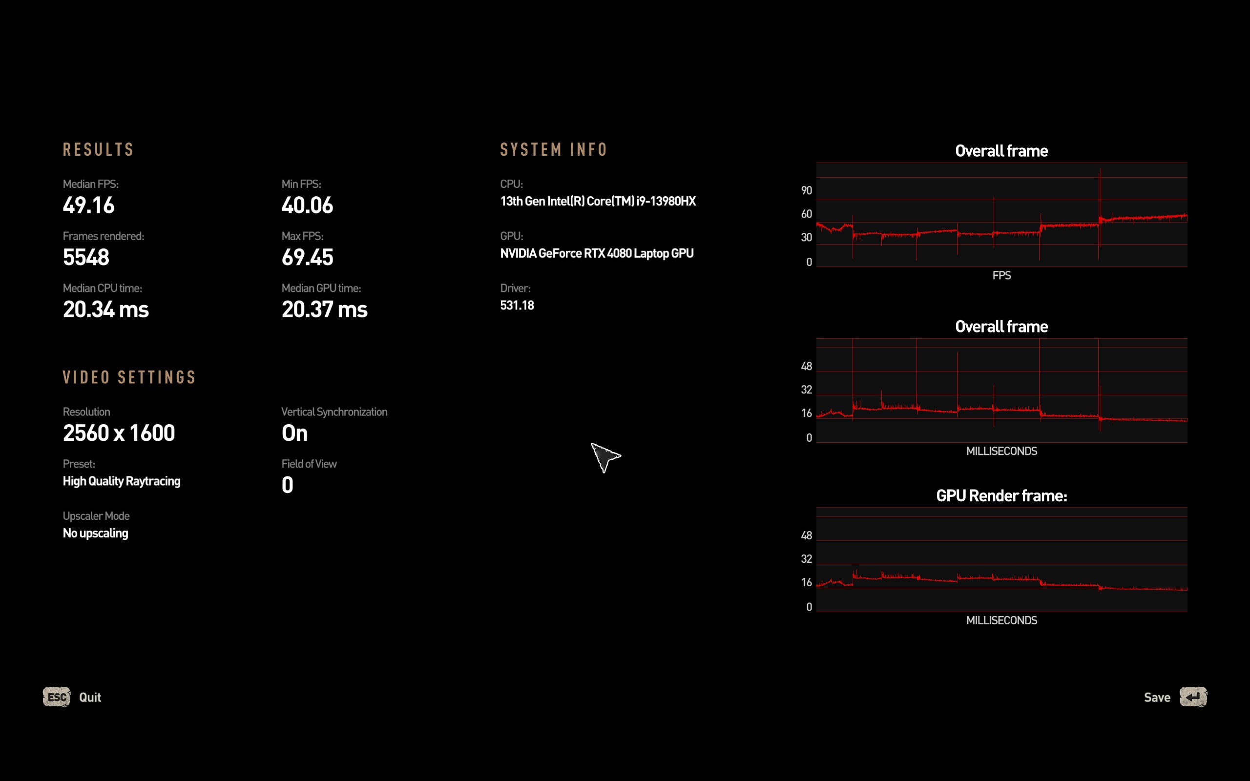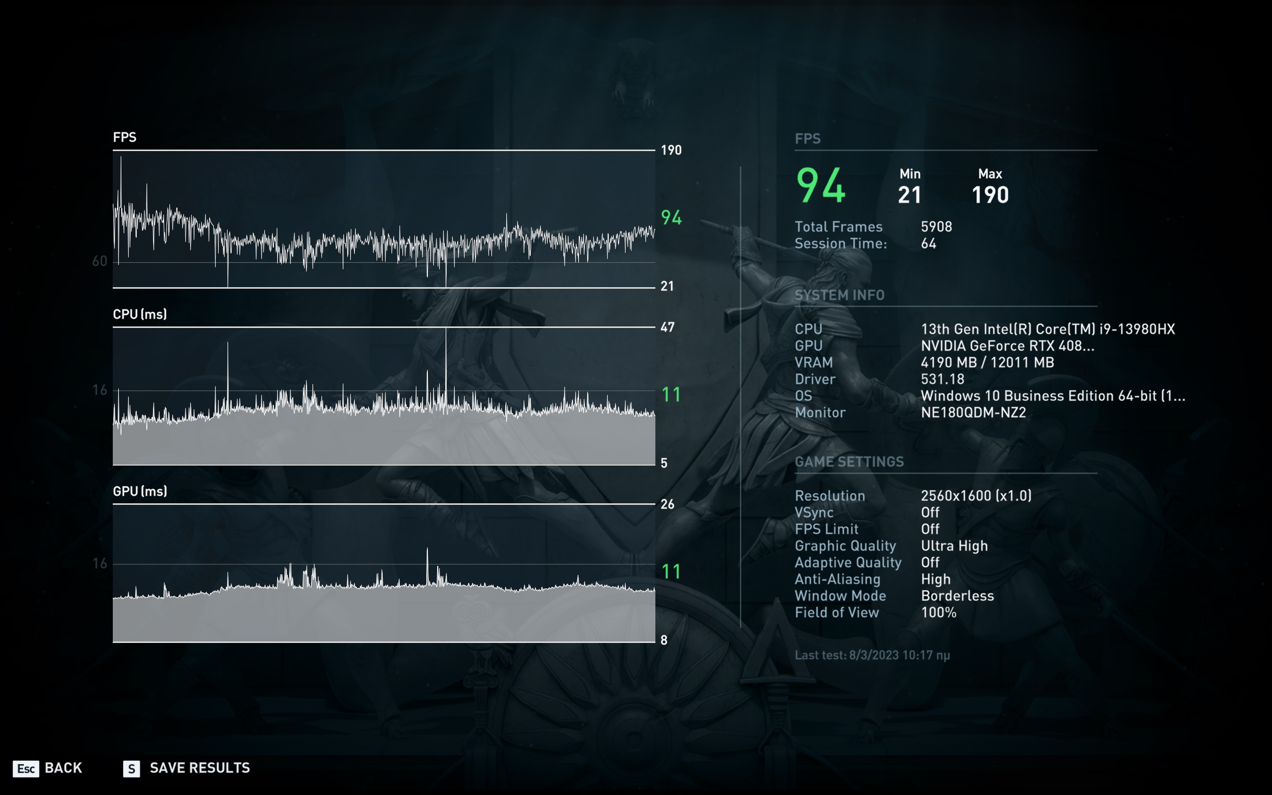 Σε κάθε περίπτωση, το υποσύστημα γραφικών της nvidia προφανώς και μπορεί να προσφέρει εξαιρετικές επιδόσεις ακόμα και στη native ανάλυση της οθόνης. Να σημειώσουμε πάντως, για το θέμα της ονοματολογίας, πως η RTX4080 των laptop έχει τα ίδια specs με την RTX4070Ti για desktop, απλά λειτουργεί με περιορισμό στο TDP. Ακόμα και έτσι πάντως, ο συνδυασμός της με το επεξεργαστή της Intel και η εξαιρετική ψύξης της Asus, κάνουν το laptop ένα gaming.. κτηνάκι. Για του λόγου το αληθές, τρέξαμε τα παρακάτω benchmark και στο desktop PC του υπογράφοντας (Ryzen 9 3900X, RTX3080 10GB, 32GB DDR4), με το Asus ROG Strix 18 να προσφέρει τουλάχιστον ίδιες επιδόσεις και σε κάποια παιχνίδια υψηλότερες. Όλα τα benchmark τα τρέξαμε στη native ανάλυση της οθόνης (2560x1600) και στο Performance mode του Armory Core, καθώς δοκιμάζοντας το Turbo Mode, δεν είδαμε πρακτικά μετρήσιμη αύξηση στο frame rate.