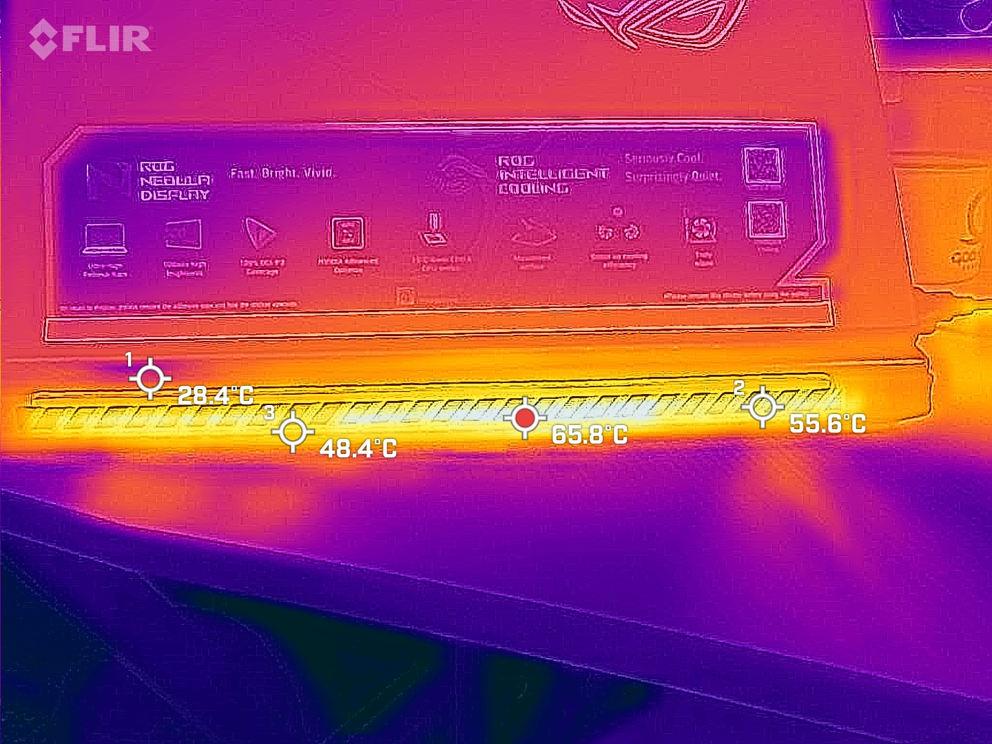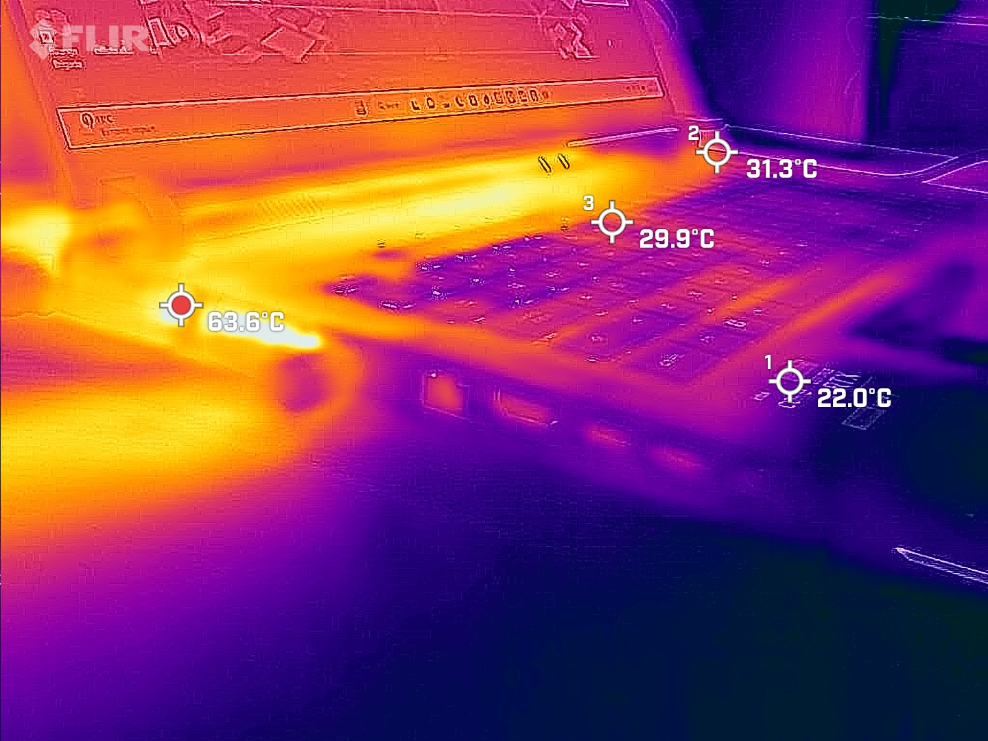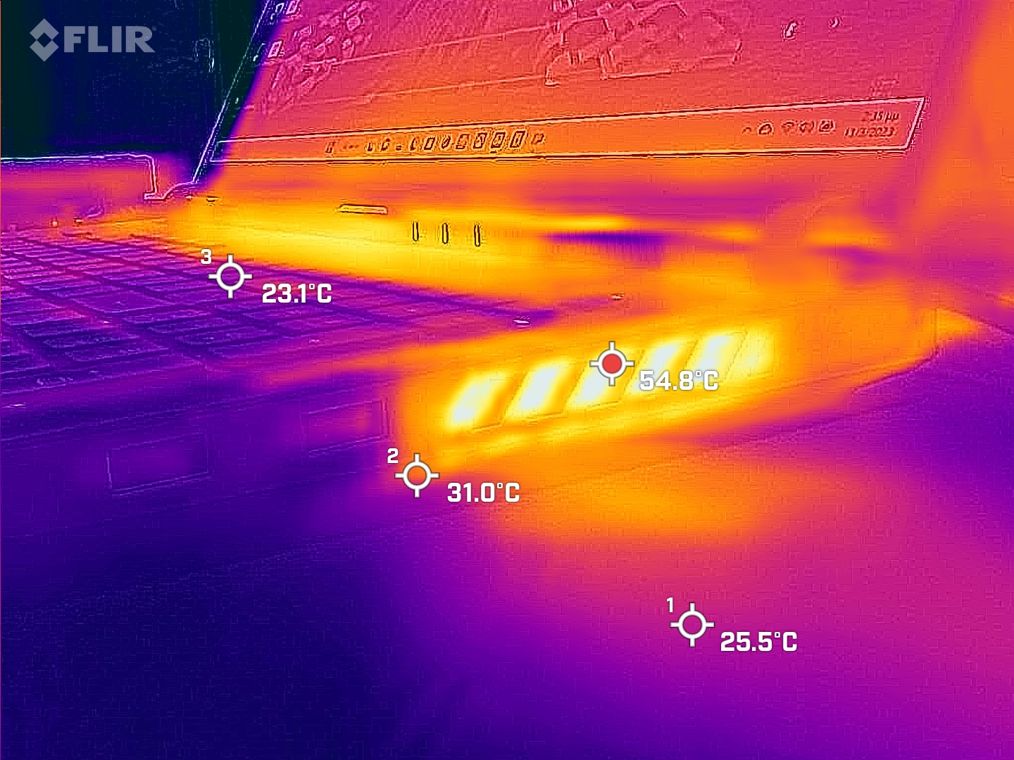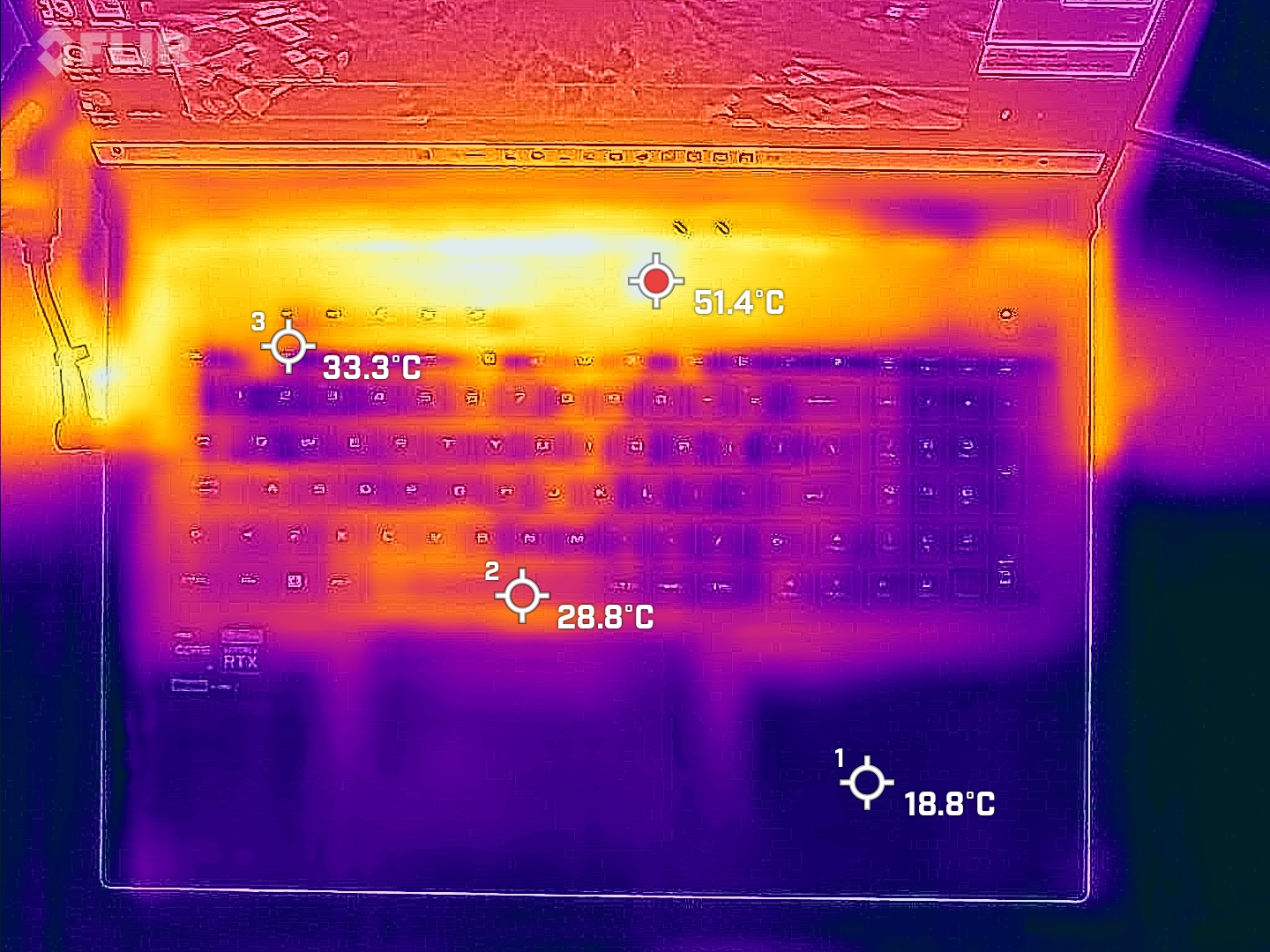 Θερμοκρασίες πάνω στο laptop που πήραμε με τη συσκευή της Flir έχοντας το laptop να τρέχει stress test σε CPU και GPU ταυτόχρονα (Furmark + Aida64). Στη πράξη, στις εξόδους του αέρα έχουμε υψηλές θερμοκρασίες (λογικό).