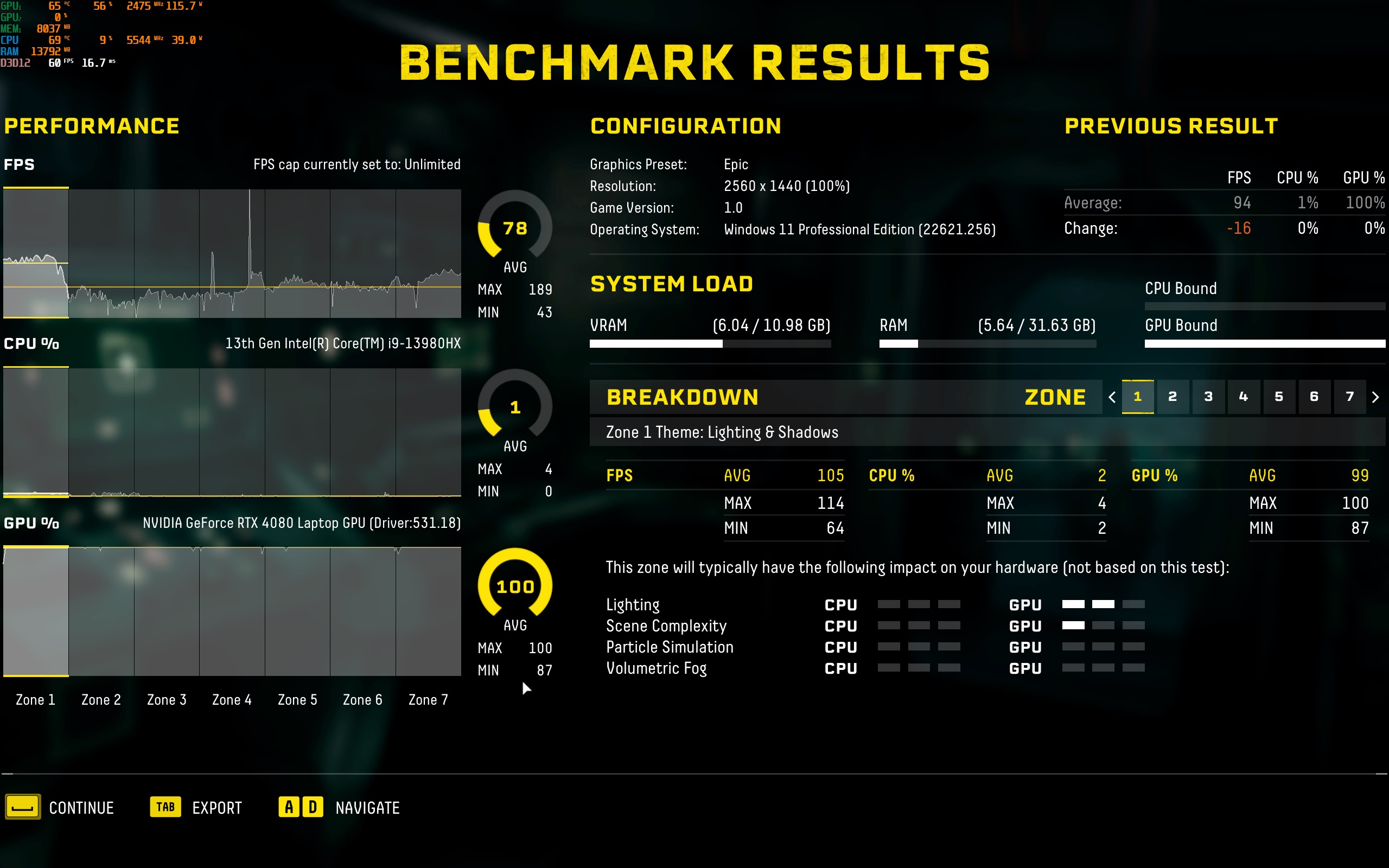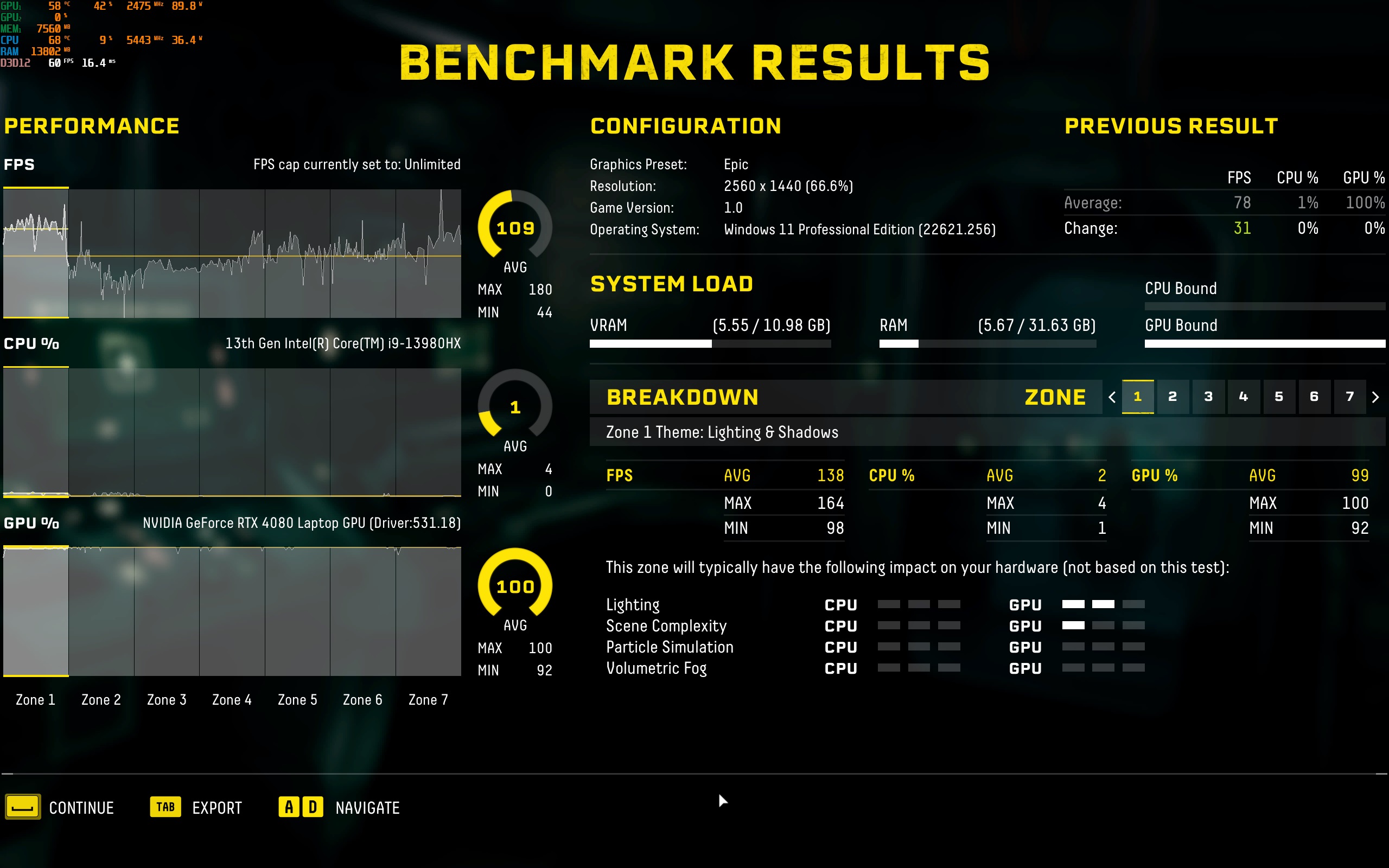 Το σχετικά παλιό FarCry5 (max setttings) τρέχει επίσης πολύ άνετα και είναι το παιχνίδι που πραγματικά... έσκισε το desktop με το αποτέλεσμα που έδωσε, προφανώς λόγω την νέας αρχιτεκτονικής του επεξεργαστή! Πήραμε λοιπόν 152fps, όταν τo desktop περιορίστηκε μόλις στα 98fps! Να σημειώσουμε ότι δοκιμάσαμε και αυτό το παιχνίδι έχοντας το φορτιστή των 100Watt αντί για το κανονικό φορτιστή με το σύστημα να δίνει 96fps και τη GPU –και εδώ- να περιορίζεται στα 50-55Watt κατανάλωσης.