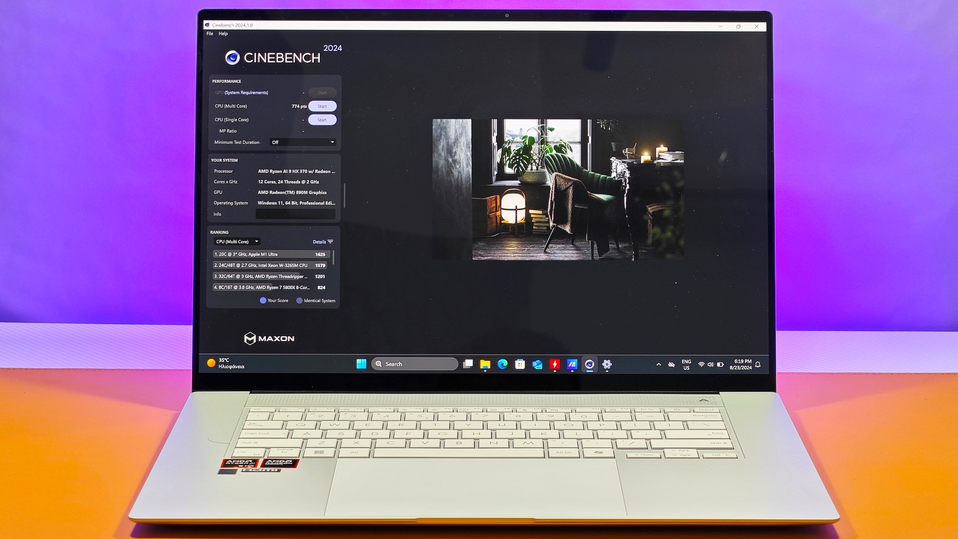 Σε επίπεδο hardware τώρα, το σύστημα έρχεται όπως είπαμε με τον AMD Ryzen AI 9 HX 370 με 12 πυρήνες και 24 threads, ακολουθώντας αρχιτεκτονική Big.Little, με 4 Zen 5 πυρήνες έως τα 5,1Ghz και 8 Zen 5c έως τα 3,3Ghz, ο οποίος συνοδεύεται από 32GB μνήμης LPDDR5X στα 7500Mhz. Ο δίσκος είναι ένας γρήγορος NVMe 2TB. Ο επεξεργαστής όπως είπαμε είναι αρχιτεκτονικής x86 και προφανώς δεν έχουμε θέματα συμβατότητας με εφαρμογές. Από εκεί και πέρα τώρα, η ASUS διαθέτει 4 προφίλ όσον αφορά στις επιδόσεις του CPU: Full Speed, Performance, Standard και Whisper, με καθένα από αυτά να αποδίδει διαφορετικά καθώς το TDP είναι διαφορετικό. Τρέχοντας το Cinebench 2024 (multicore) και στα τέσσερα πήραμε κατά σειρά 974/971/868/798 πόντους,. Όμως το πρώτο είναι κάπως θορυβώδες με τους ανεμιστήρες να ακούγονται αρκετά (πάντα στο Cinebench βέβαια), ενώ το Whisper είναι πρακτικά αθόρυβο. Στη πράξη, οι περισσότεροι χρήστες θα έχουν το σύστημα στο Standard, αλλά ακόμα και στο Full Speed, οι ανεμιστήρες δε πρόκειται να ακούγονται εφόσον η CPU δεν λειτουργεί στο 100% συνεχώς. Οι παραπάνω μετρήσεις έγιναν με το laptop στο ρεύμα. Τι συμβαίνει όμως αν το βγάλουμε από τη πρίζα? Οι επιδόσεις διαφοροποιούνται ανάλογα με το power προφίλ που επιλέγουμε στα Windows, αλλά ακόμα και στο Performance, είναι χαμηλότερες . Για παράδειγμα στο Standard mode του MyASUS πήραμε 677 και 775 πόντους με Efficiency και Performance αντίστοιχα, αλλά αντίστοιχα νούμερα πήραμε και στο Silent και στο Performance! Βέβαια οι μετρήσεις είναι το ένα θέμα, γιατί στη πράξη το σύστημα είναι εξαιρετικά γρήγορο στη καθημερινή χρήση. Δε παρατηρήσαμε κολλήματα, καθυστερήσεις κτλ και όλα λειτουργούν μια χαρά.