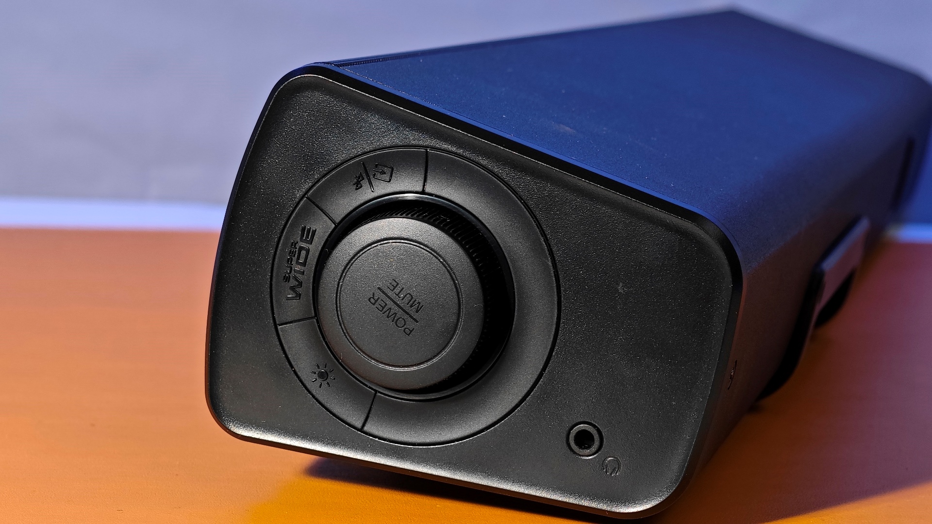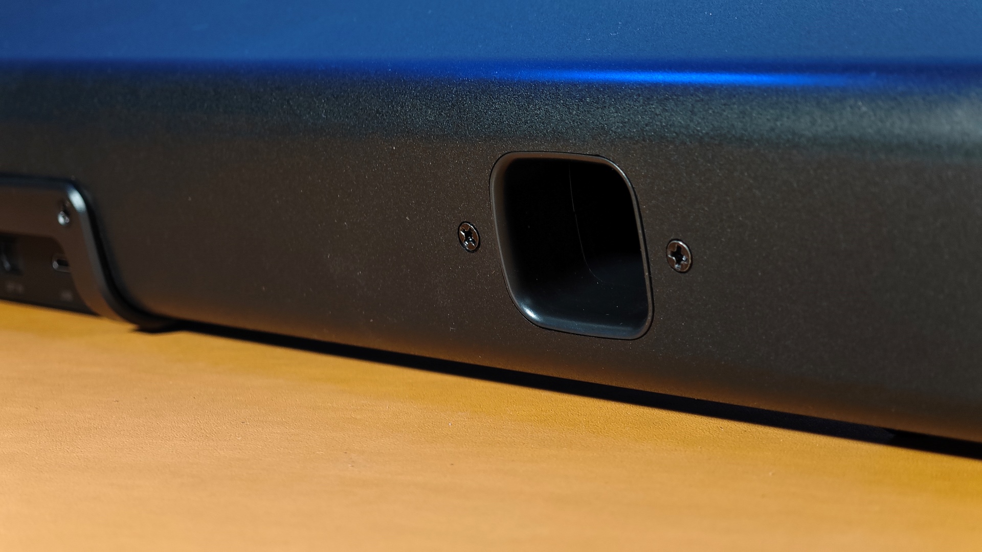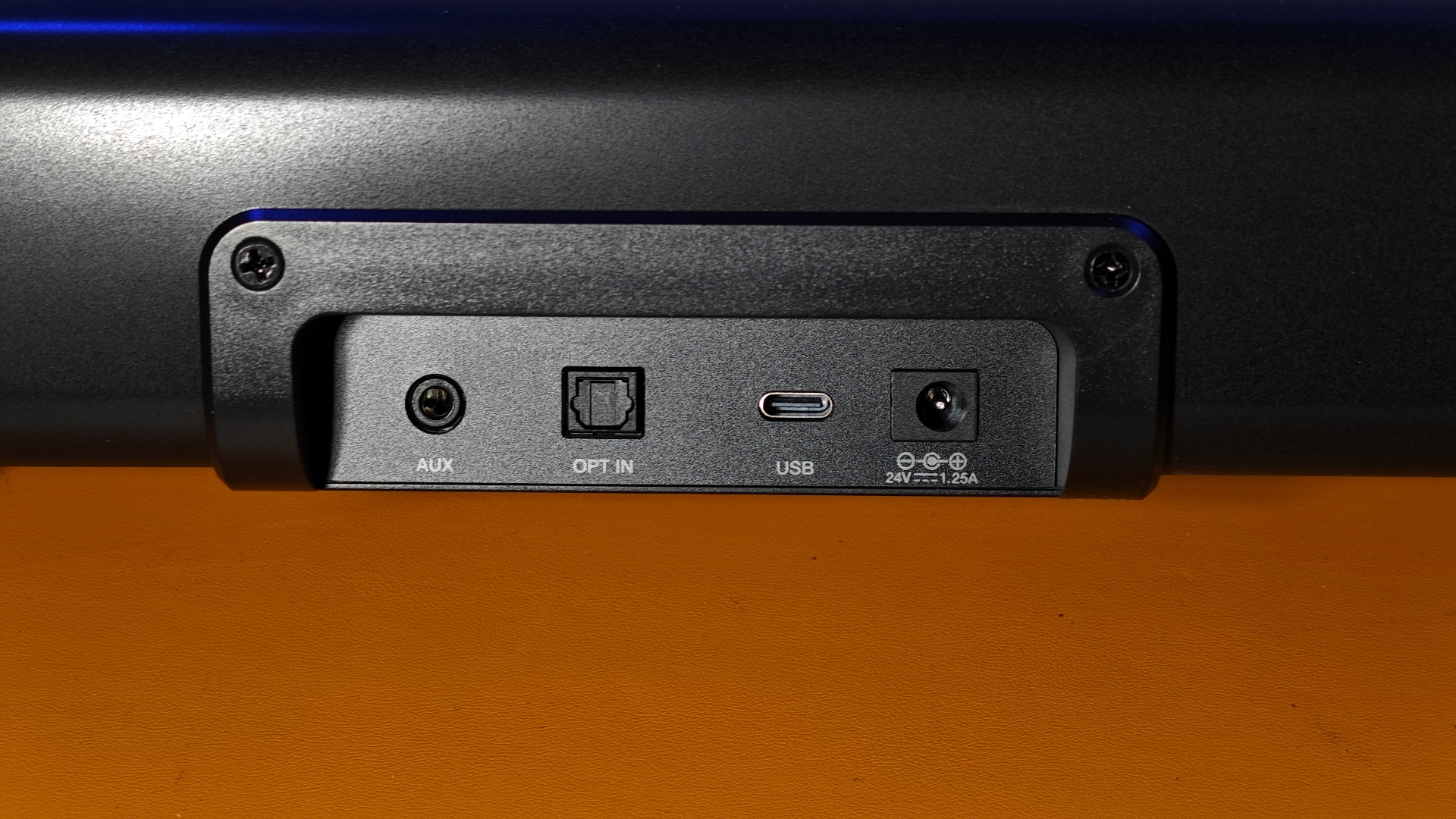 Στο πίσω μέρος έχουμε και όλες τις διαθέσιμες θύρες. Συγκεκριμένα βρίσκουμε το βύσμα για τη τροφοδοσία, τρεις εισόδους (οπτική, αναλογική σε μορφή mini jack, USB Type-C) ενώ μια έξοδος για σύνδεση με ακουστικά βρίσκεται στη δεξιά πλευρά, παρέα με κάποια πλήκτρα ελέγχου (αλλαγή εισόδους ήχου, αλλαγή του φωτισμού RGB, ενεργοποίηση της λειτουργίας SuperWide) καθώς και το μεγάλο ποτεσνιόμετρο για αυξομείωση της έντασης ήχου.