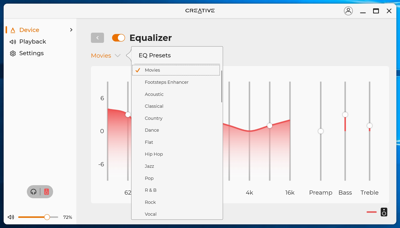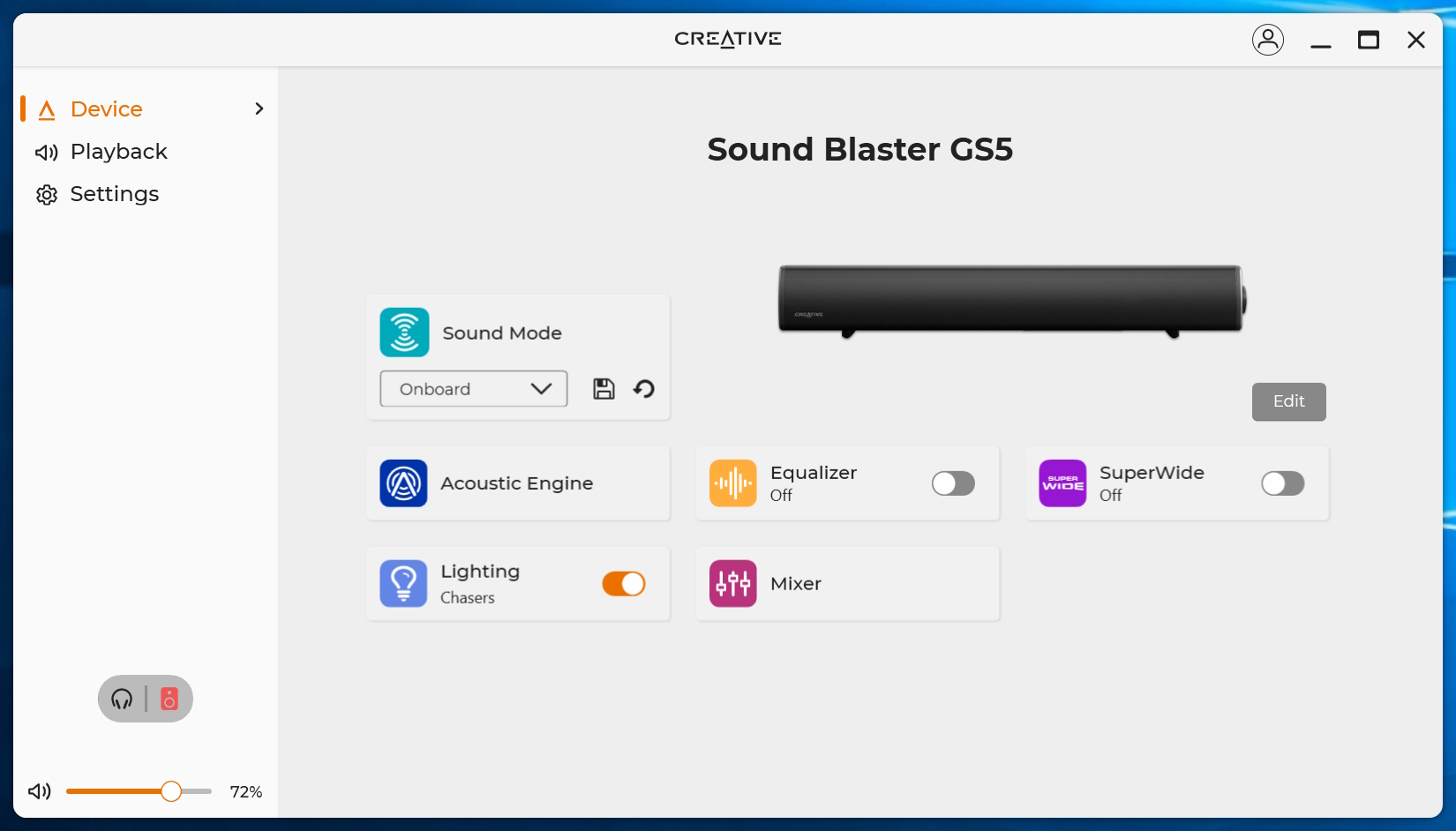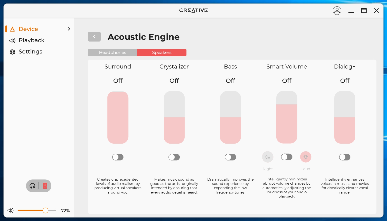 Αν και η εγκατάσταση του Creative App δεν είναι απαραίτητη, ακόμα και όταν η GS5 RGB συνδέεται σε υπολογιστή, εντούτοις οι επιλογές που προσφέρει είναι πραγματικά πολλές. Κατ’ αρχάς έχουμε επιλογές όπως να ενεργοποιήσουμε την Acoustic Engine ή να ρυθμίσουμε το Equalizer. Η Acoustic Engine διαθέτει πέντε επιλογές με μπάρα ρύθμισης έντασης όπως τη δημιουργία Virtual Surround, το Crystalizer που κάνει τη μουσική να ακούγεται όπως την είχαν φανταστεί οι δημιουργοί της, το Smart Volume που προσπαθεί να κρατήσει την ένταση του ήχου ίδια καθόλη τη διάρκεια αναπαραγωγής και το Dialog+ που προσπαθεί να κάνει τις φωνές καθαρότερες.