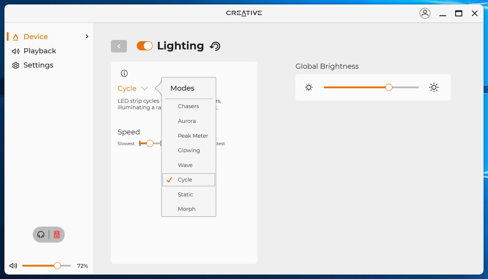 Στο κάτω μέρος της ηχομπάρας έχουμε φωτισμό RGB από τη μια άκρη της ηχομπάρας στην άλλη, ο οποίος μπορεί να φωτίσει με διάφορους τρόπους. Από το τηλεχειριστήριο αλλάζουμε μεταξύ των προ-επιλεγμένων προφίλ και τη φωτεινότητα, αλλά από το Creative app μπορούμε να επιλέξουμε διαφορετικά mode κίνησης μεταξύ 8 επιλογών, καθώς επίσης και ταχύτητες, χρώματα που χρησιμοποιούνται και ο φωτισμός θα αντιδρά στον ήχο που παίζει η ηχομπάρα.