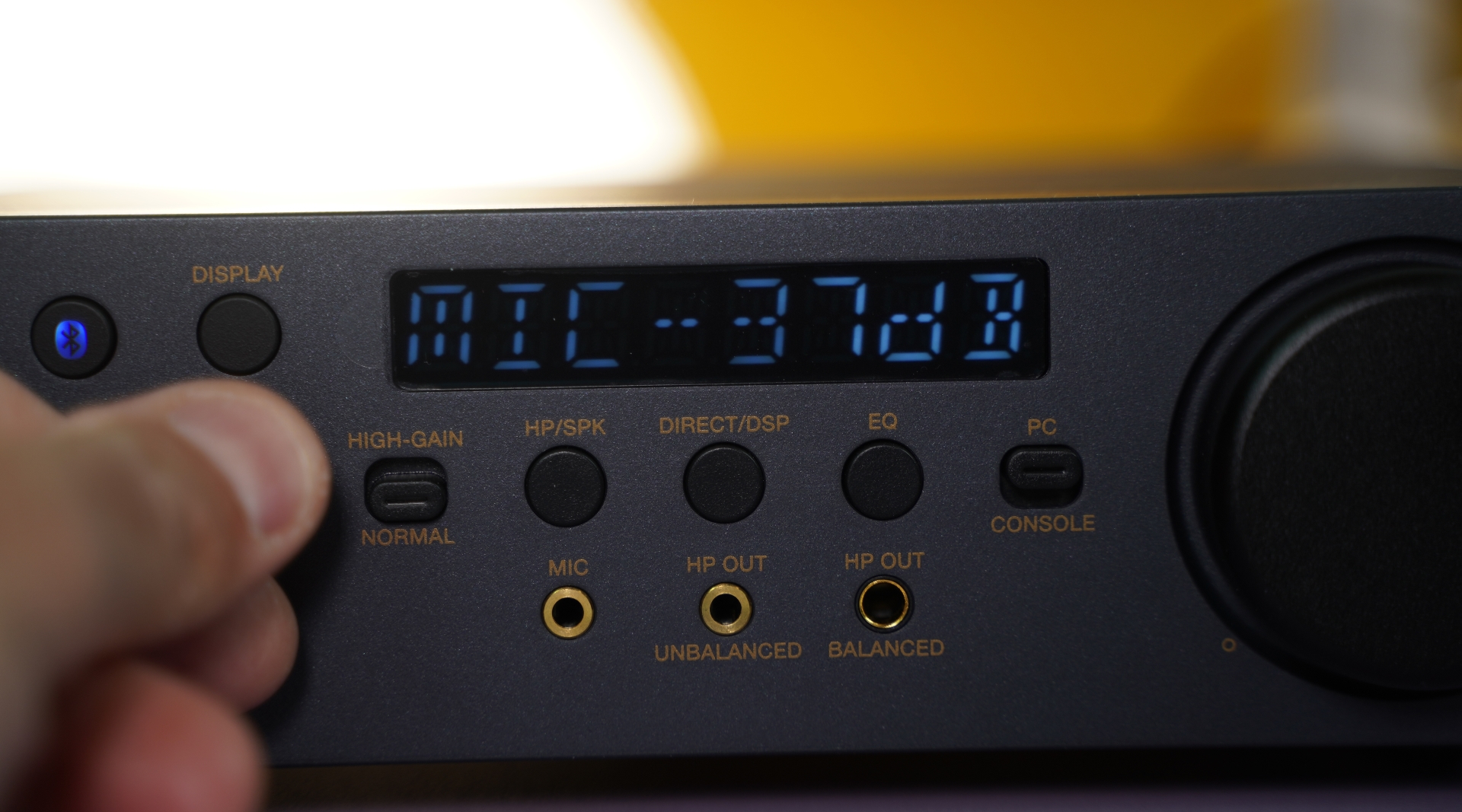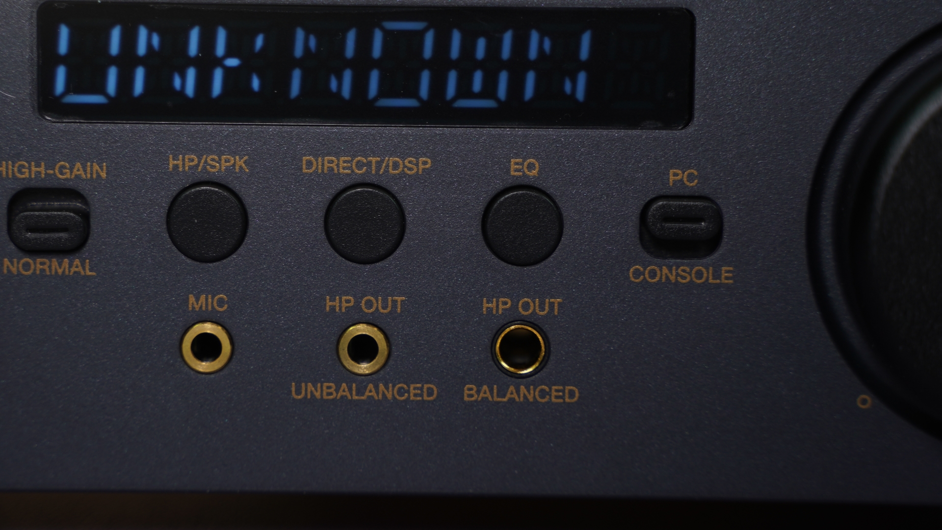 Στη πρόσοψη έχει μια είσοδο μικροφώνου 3,5mm, μια έξοδο ακουστικών επίσης 3,5mm και μια ακόμα έξοδο ακουστικών 4,4mm η ο οποία προορίζεται για χρήση με balanced ακουστικά (τα οποία συνήθως κοστίζουν πολλά-πολλά χρήματα). Όσον αφορά στα πλήκτρα ελέγχου, έχουμε στη δεξιά πλευρά ένα τεράστιο volume nob με ενδεικτικό led και μια σειρά από επιπλέον πλήκτρα και διακόπτες. Από αριστερά προς τα δεξιά έχουμε το power button και μετά δυο σειρές. Στη πάνω σειρά βρίσκουμε το πλήκτρο Bluetooth για να κάνουμε pair το κινητό μας με τη συσκευή και δεξιά του τη μεγάλη ενημερωτική οθόνη στην οποία εμφανίζονται οι πληροφορίες που έχουν να κάνουν με την επιλογή μας.