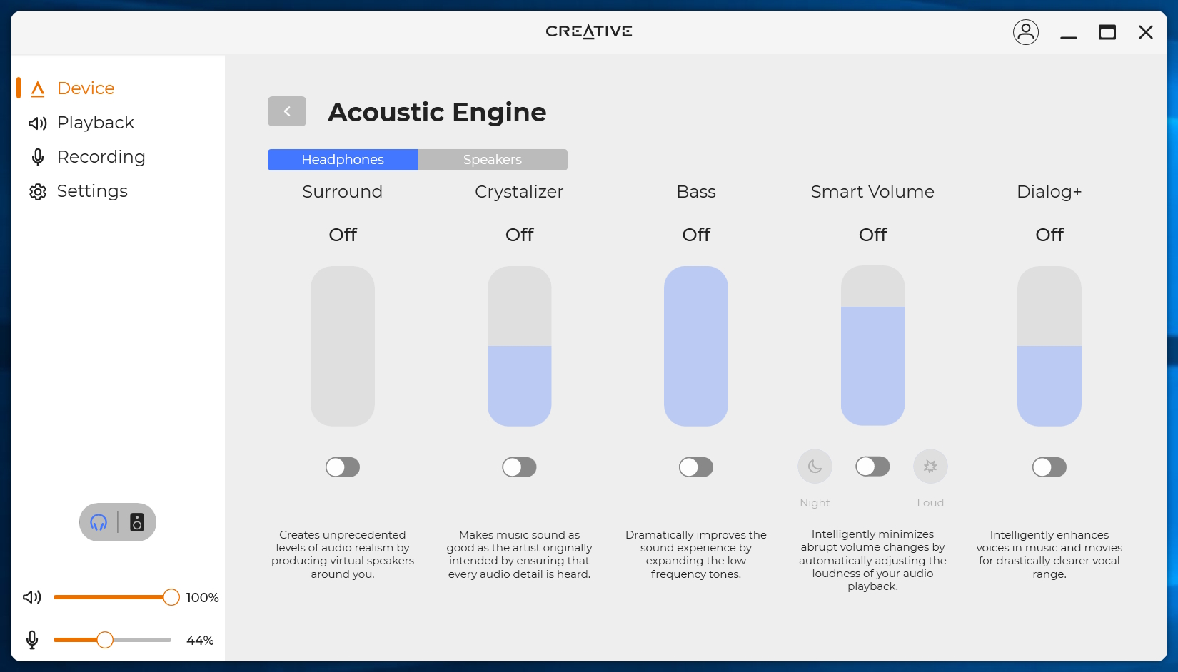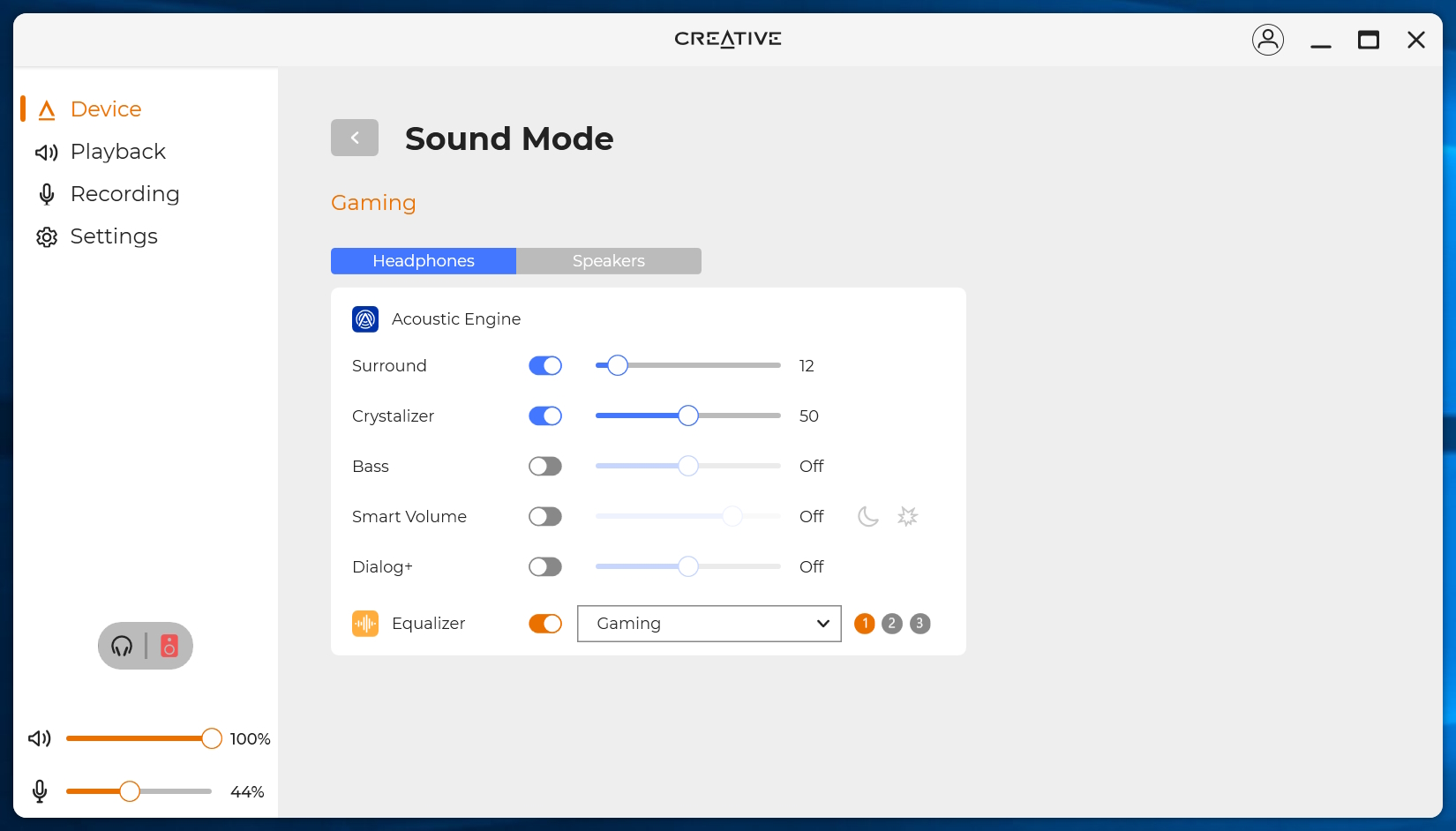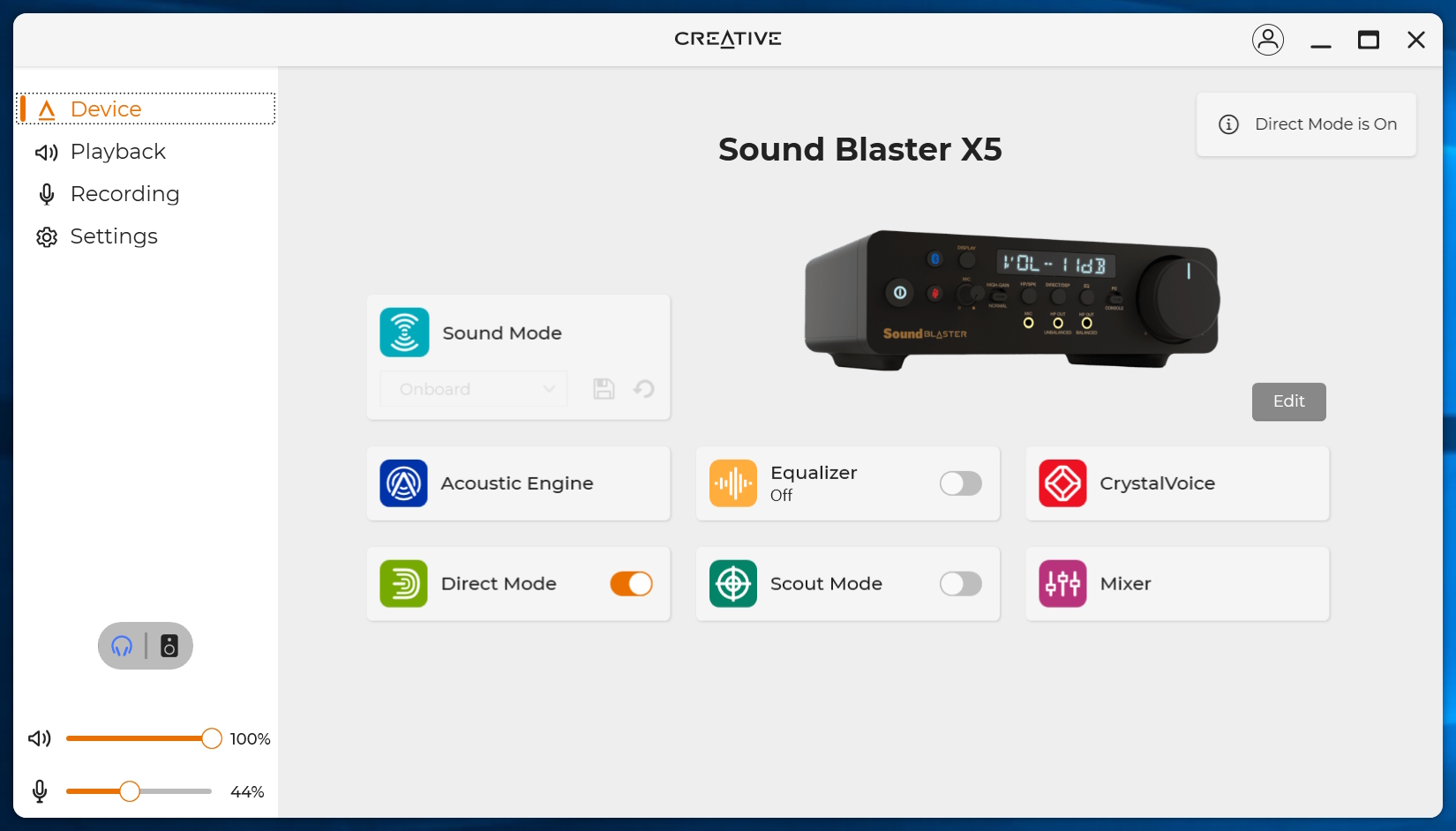 Αν και η εγκατάσταση του Creative App δεν είναι απαραίτητη, ακόμα και όταν η Soundblaster X5 συνδέεται σε υπολογιστή, εντούτοις οι επιλογές που προσφέρει είναι πραγματικά πολλές. Κατ’αρχάς το firmware update που κάναμε μέσω αυτής, διόρθωσε πάρα προβλήματα. Από εκεί και πέρα, έχουμε περισσότερες επιλογές μέσω της εφαρμογής, όπως να ενεργοποιήσουμε την Acoustic Engine, το Scout Mode και το CrystalVoice, περισσότερες επιλογές Equalizer αλλά και χρήση του mixer ώστε να ελέγχουμε καλύτερα την ένταση και το balance των καναλιών κατά την αναπαραγωγή ή εγγραφή ήχου.