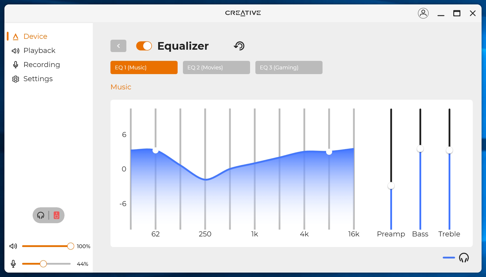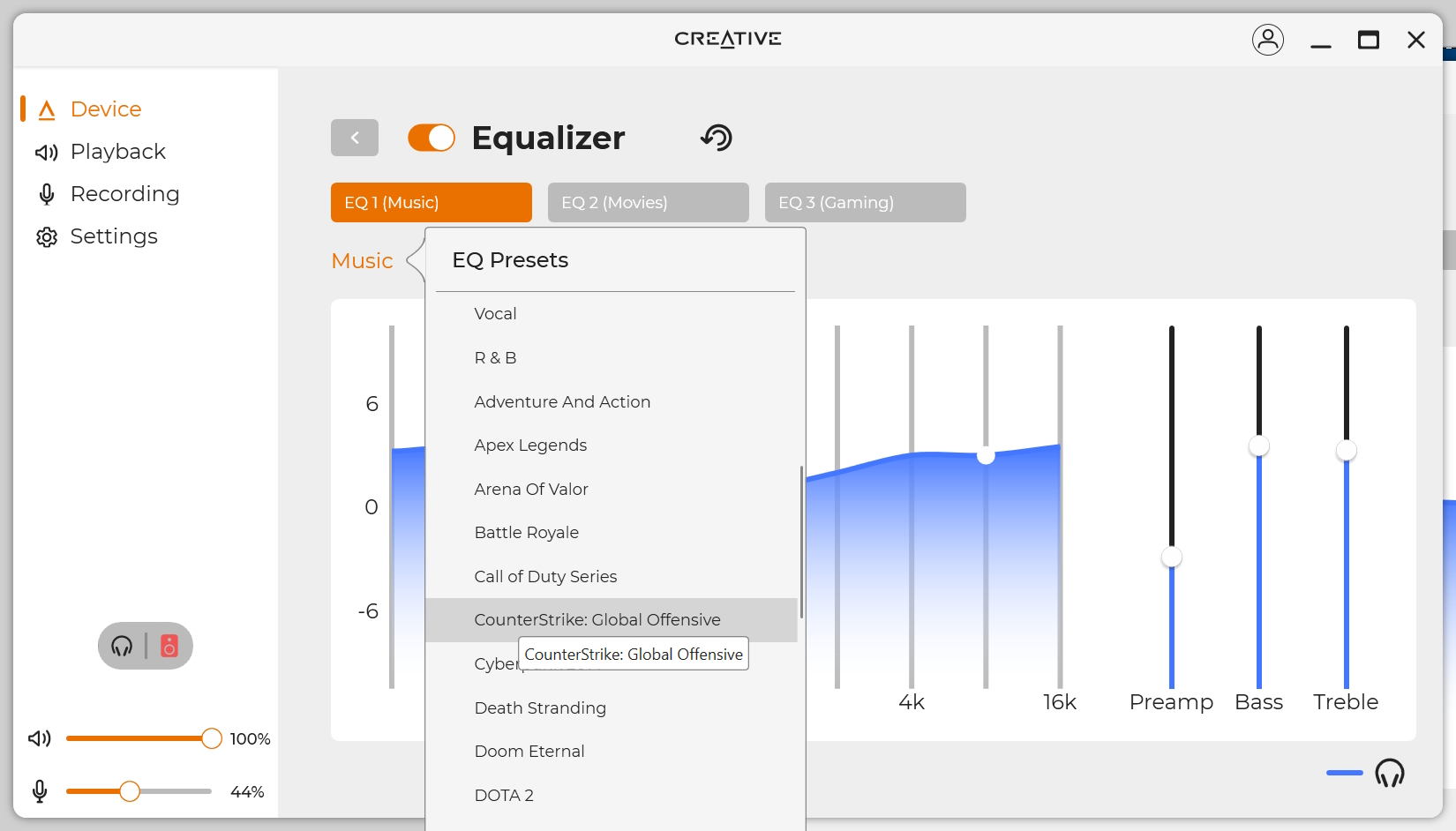 Στο Equalizer έχουμε 10 μπάρες EQ και επιπλέον δυνατότητες ρύθμισης της έντασης της προενίσχυσης αλλά και ξεχωριστά του Bass και του Treble (τα οποία βέβαια αλλάζουν τη κυματομορφή των συχνοτήτων). Ωστόσο, υπάρχουν πολύ περισσότερα έτοιμα preset EQ, πέρα από τα 3 που έχουμε σαν επιλογή με το πλήκτρο EQ πάνω στη Soundblaster X5. Είτε αφορούν συγκεκριμένα ήδη μουσικής, είτε κατηγορίες παιχνιδιών είτε και συγκεκριμένα παιχνίδια όπως Call of Duty, CounterStike, DOTA, LoL, Overwatch, Fortnite και άλλα.