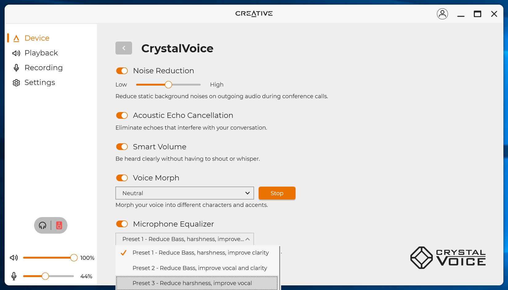 Όσον αφορά στο Crystal Voice, πρόκειται για μια σειρά ρυθμίσεων που αφορούν στο μικρόφωνο, περιλαμβάνοντας επιλογές όπως μείωση του θορύβου ή και της ηχού, προφίλ equalizer, το Voice Morph το οποίο έχει τη πλάκα του καθώς επιτρέπει στο χρήστη να αλλάξει εντελώς τη φωνή του και να τη κάνει να ακούγεται κάτι άλλο πχ παιδική, γερασμένη, δαιμονική, ρομποτική και άλλα.