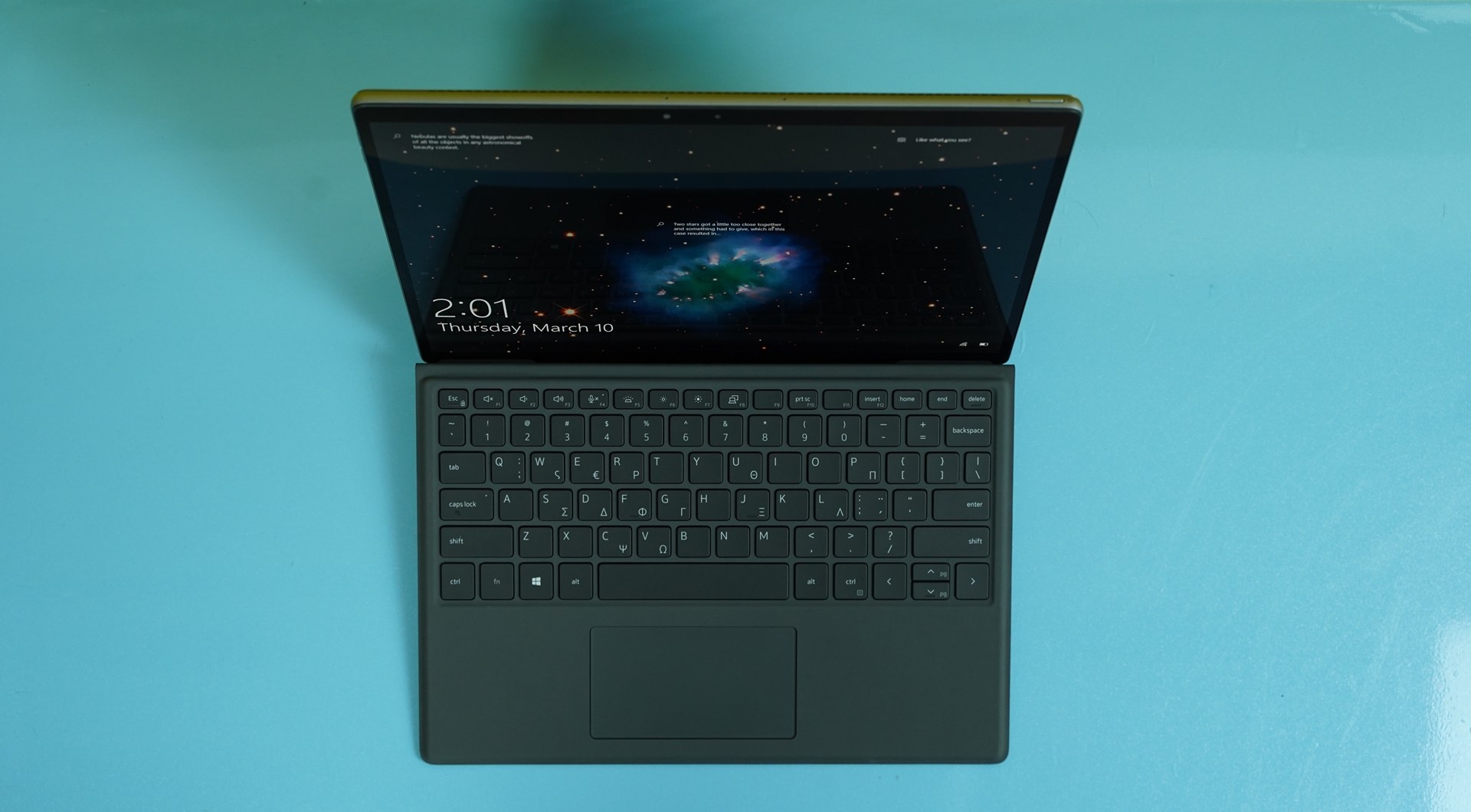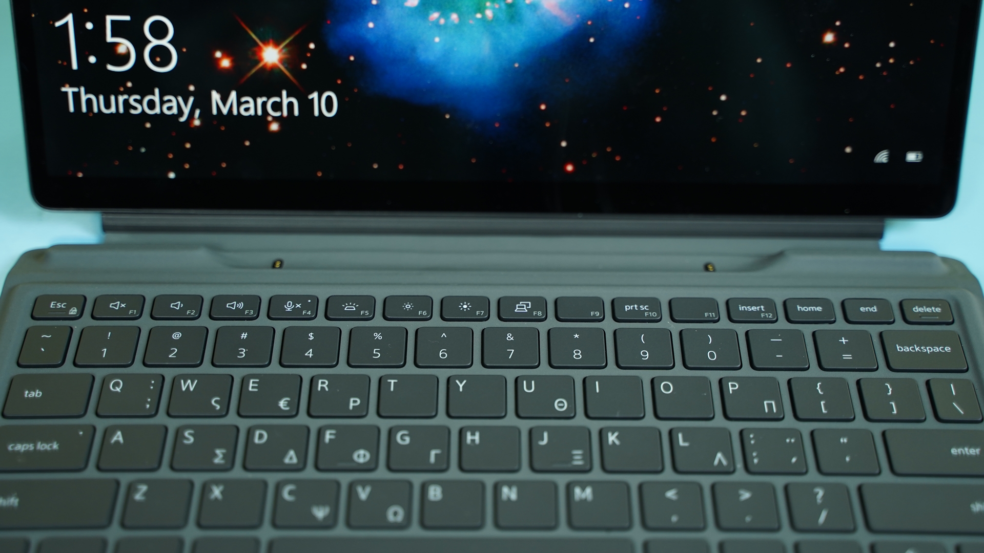 Το πληκτρολόγιο ακολουθεί κλασσική chicklet σχεδίασης, με τα F keys να είναι μικρότερα από τα υπόλοιπα και να είναι αυτά που ενσωματώνουν διπλές λειτουργίες όπως η αυξομείωση της έντασης του ήχου, της φωτεινότητας της οθόνης, της φωτεινότητας του πληκτρολογίου (2 επίπεδα) κτλ. Το σχετικά μικρό touchpad πάλι έχει καλή ποιότητα κύλισης του δαχτύλου. Επίσης, στη πάνω μεριά του, υπάρχει και ειδική θέση στην οποία τοποθετείται το stylus που βρίσκουμε στη συσκευασία, θέση που όμως κρύβεται (μαζί και το stylus) όταν ανασηκώνουμε το keyboard για να το τοποθετήσουμε υπό γωνία.