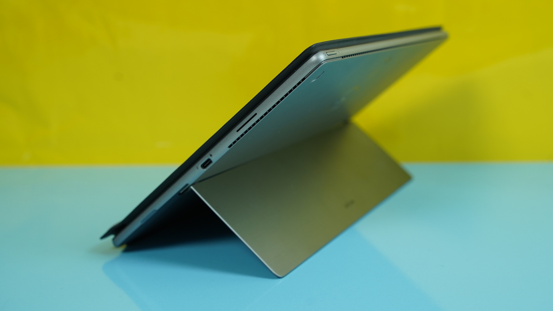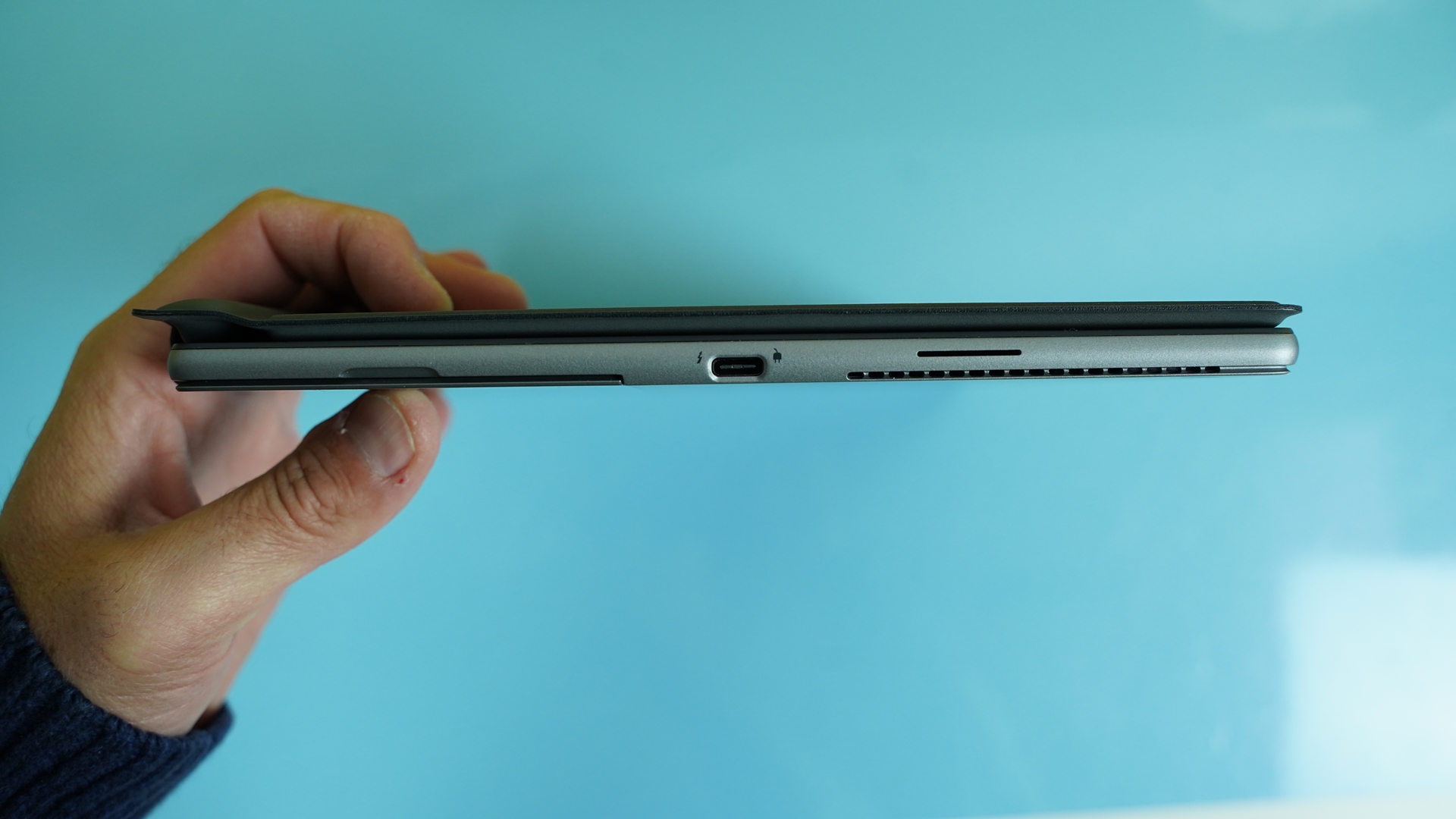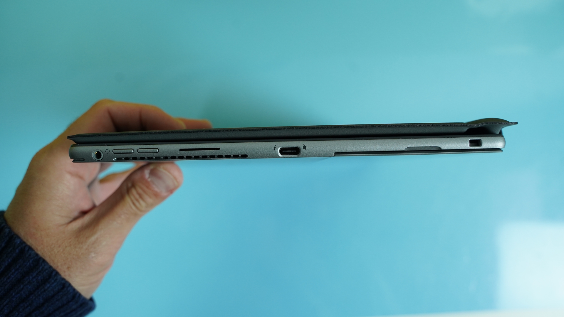 Πηγαίνοντας τώρα στο ίδιο το tablet, έχουμε μια ποιοτική κατασκευή, βάρους περίπου 800 γραμμαρίων (χωρίς το πληκτρολόγιο) και προφανώς με μαζεμένες διαστάσεις, έχοντας πάχος περίπου 8,5mm. Οι γωνίες είναι στρογγυλεμένες, με τη πρόσοψη να καλύπτεται στο μεγαλύτερο κομμάτι της από την οθόνη διαγωνίου 13’’ με αναλογίες 3:2 (ανάλυσης 1920x1280) και τα bezel να είναι αρκετά μικρά στις δυο, μικρότερες, πλευρές και ελαφρώς μεγαλύτερα στις άλλες 2 πλευρές. Από πλευράς θυρών, το Dell Latitude 7320 Detachable είναι μάλλον λιτό, καθώς έχουμε δυο Type-C (μια σε κάθε πλευρά) που υποστηρίζουν και Thunderbolt 4 καθώς και μια έξοδο ακουστικών στην αριστερή πλευρά. Σε κάθε πλευρά βρίσκουμε από μια χαραμάδα για την έξοδο του ήχου, με τα ενσωματωμένα ηχεία να παίζουν πραγματικά καλά. Δυστυχώς δεν υπάρχει κάποιος card reader για κάρτες SD.