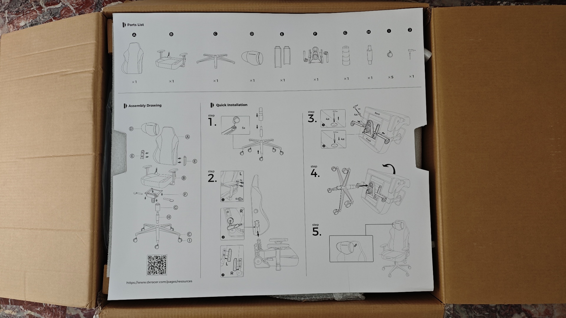 Το πρώτο πράγμα που συναντά κανείς ανοίγοντας το κουτί είναι οι οδηγίες συναρμολόγησης, τυπωμένες σε ένα τεράστιο χαρτόνι. Είναι απλές αλλά κατανοητές. Η συναρμολόγηση είναι σχετικά εύκολη αλλά απαιτεί εργαλείο (το οποίο είναι μέσα στη συσκευασία) για τις βίδες, οι οποίες βρίσκονται ήδη πάνω στα σημεία που πρέπει να βιδωθούν και πρέπει πρώτα να τις αφαιρέσουμε, να ενώσουμε τα διάφορα parts (πχ τη πλάτη στο κάθισμα, το κάθισμα στο μηχανισμό στήριξης).