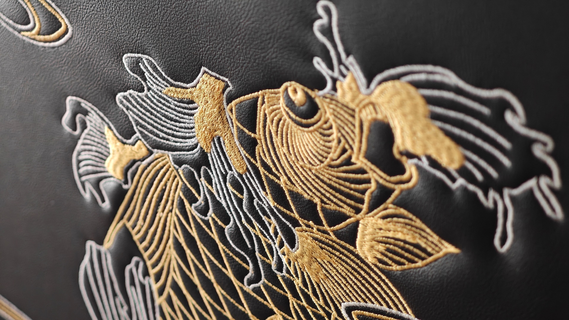 Είτε τα γράμματα στο σημείο που στηρίζεται η πλάτη μας, είτε το εντυπωσιακό τμήμα στο πίσω μέρος της πλάτης που δείχνει αυτό το χρωματιστό ψάρι (κυπρίνος) που εκτρέφεται στην Ιαπωνία και είναι σύμβολο τύχης, ευημερίας, δύναμης και αντοχής. Κάθε μοτίβο της Έκδοσης KOI απαιτεί εντυπωσιακές 260.000 ραφές για να ζωντανέψουν αυτά τα περίπλοκα σχέδια.