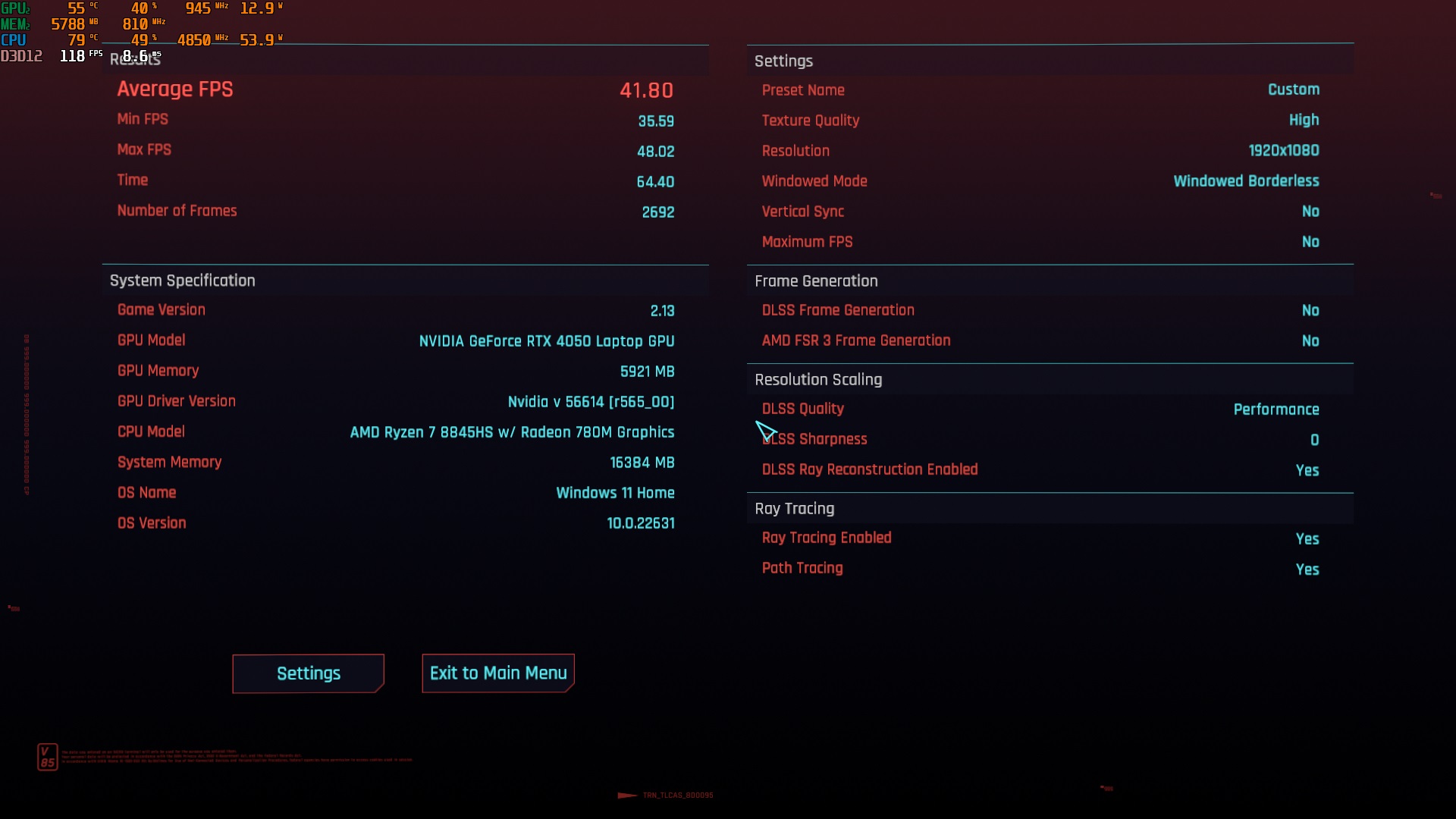 Εξαιρετικά άνετα παίζεται το Cyberpunk 2077 σε ρύθμιση High καθώς πήραμε 73 fps. Για να δούμε βέβαια πως αποδίδει το σύστημα στα όριά του, τρέξαμε το benchmark σε ρύθμιση RT Overdrive (με DLSS performace όμως εδώ) με τα 48 fps να μην είναι ιδανικά για gameplay, αλλά να δείχνουν τι μπορεί να πετύχει κανείς.
