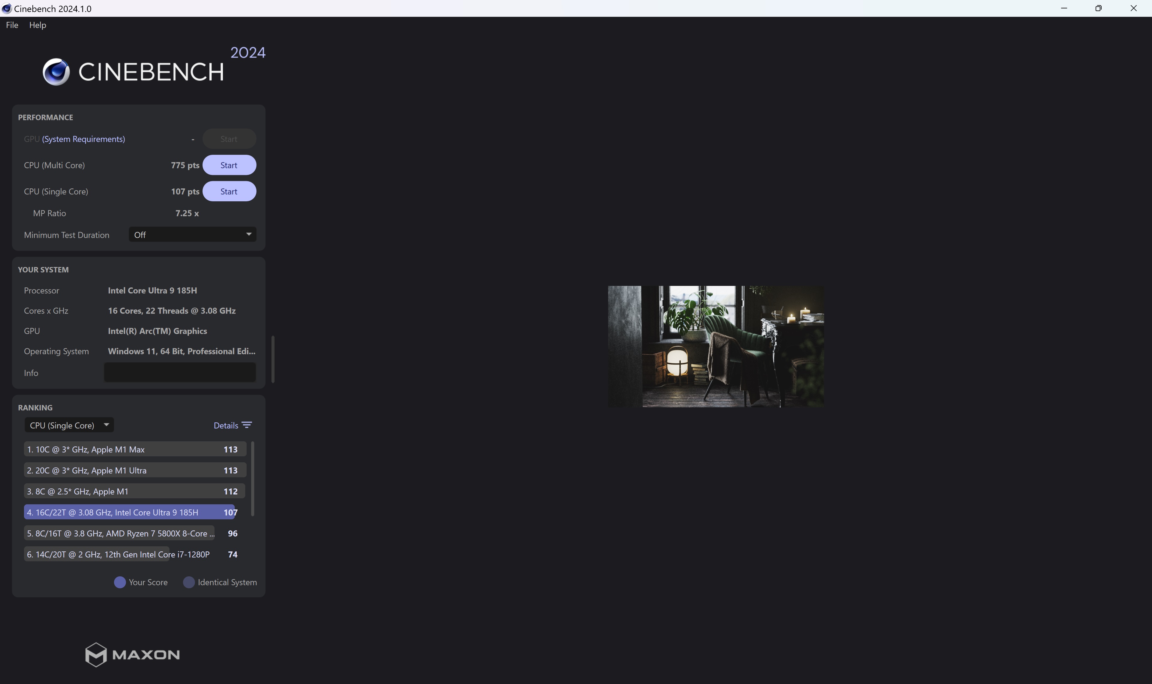 Πηγαίνοντας στα ενδότερα του, το μοντέλο της δοκιμής μας όπως είπαμε είναι εφοδιασμένο με ένα Core Ultra 9 185H ( 1ης γενιάς) με 12 πυρήνες και 22 threads, ο οποίος συνοδεύεται από 32GB μνήμης. Ο συνδυασμός προσφέρει καλές επιδόσεις για τη κατηγορία, τόσο σε single (Cinebench 2024: 107 πόντοι) όσο και σε multithreaded (Cinebench 2024: 775 πόντοι) καταστάσεις.