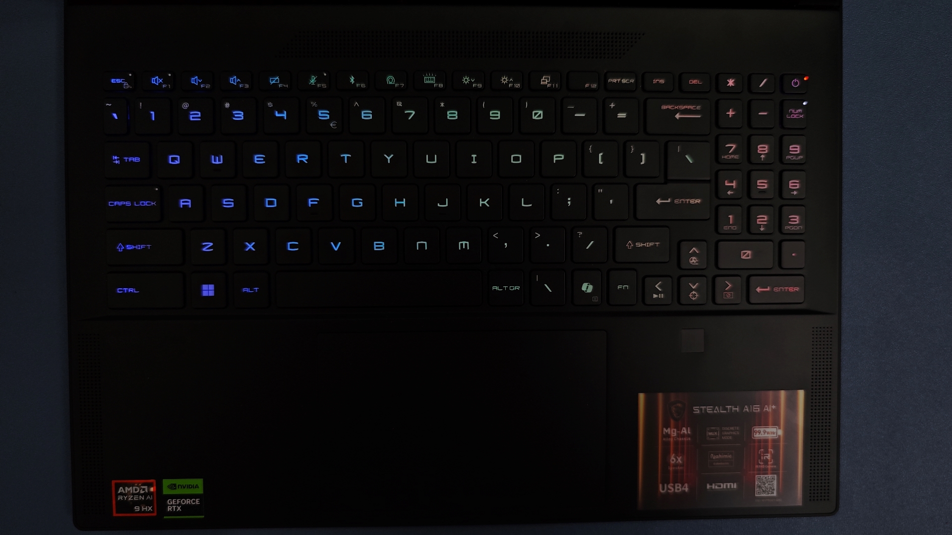Υπάρχουν αρκετά shortcuts για διάφορες λειτουργίες ενώ φυσικά συναντάμε και το γνωστό πλέον CoPilot πλήκτρο, καθώς το σύστημα έρχεται με Windows 11 Pro και CoPilot+ λειτουργίες. Κάποια από τα ξεχωριστά shortcuts είναι αυτό που ενεργοποιεί τη μέγιστη ταχύτητας περιστροφής των δυο ανεμιστήρων και αυτό που εμφανίζει στο κέντρο της οθόνης ένα στόχο για χρήση σε FPS shooters. Φυσικά υπάρχουν και όλα τα γνωστά όπως αυτά που αφορούν την αυξομείωσης της φωτεινότητας της οθόνης, της φωτεινότητας του πληκτρολογίου και της έντασης του ήχου. Συνολικά, η αίσθηση που αφήνει το πληκτρολόγιο είναι άριστη, με το βύθισμα των πλήκτρων να είναι απόλυτα ικανοποιητικό. Εντυπωσιακές είναι και οι δυνατότητες φωτισμού που παρέχει το πληκτρολόγιο, ο οποίος μπορεί να ρυθμιστεί ανά πλήκτρο.