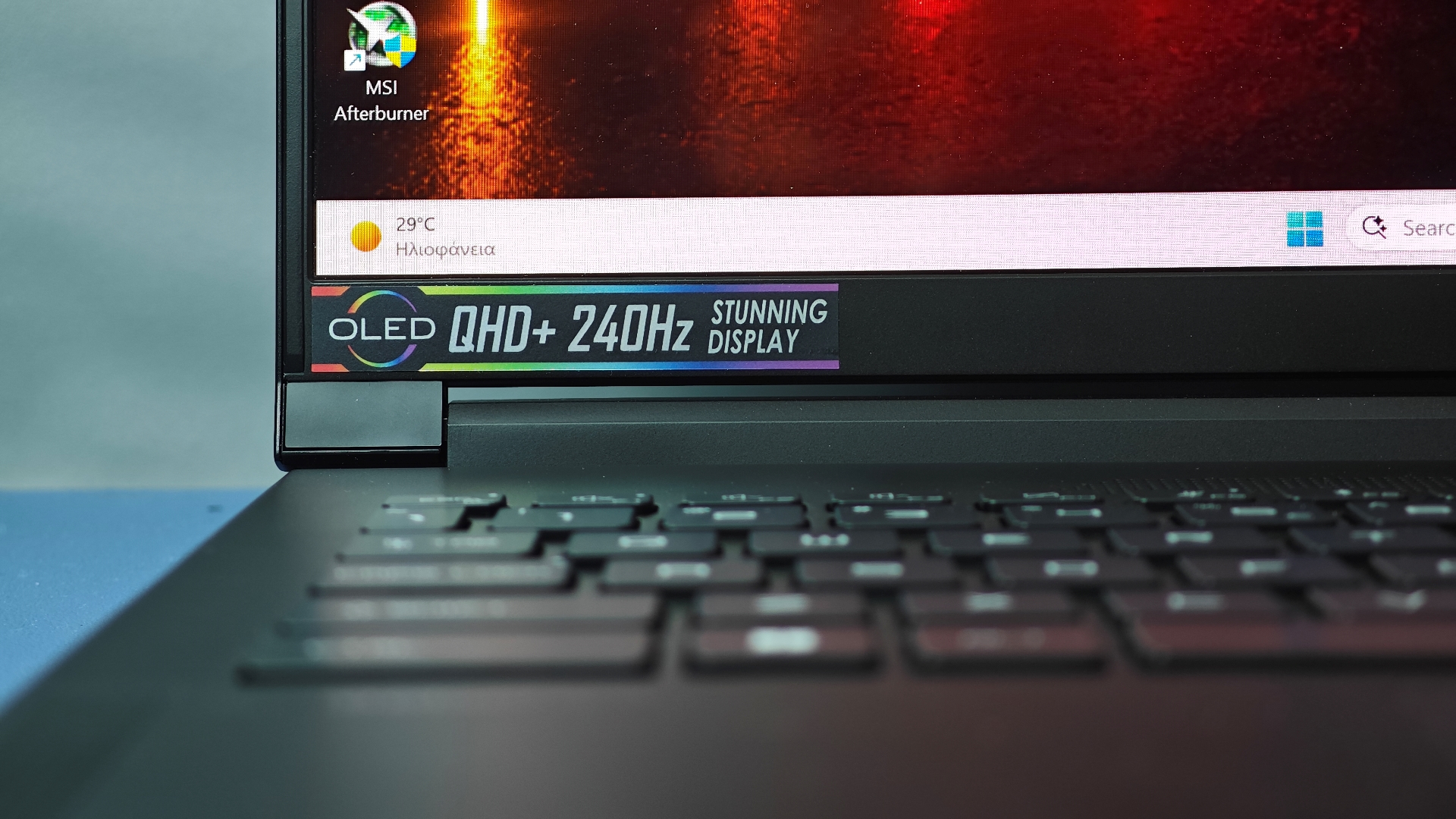 Επιστρέφοντας τώρα στην οθόνη, έχουμε να κάνουμε με ένα OLED panel διαγωνίου 16’’με αναλογίες πλευρών 16:10 που λειτουργεί σε ανάλυση 2560x1600 pixel (QHD), ενώ ταυτόχρονα υποστηρίζει και refresh rate στα 240Hz (!) χωρίς όμως υποστήριξη μάλιστα G-Sync. Πέρα από τα 240Hz, μπορούμε να τη ρυθμίσουμε να λειτουργεί και στα 60Hz. Τα bezel γύρω από το panel είναι εξαιρετικά μικρά ενώ το ίδιο το panel έχει antiglare επίστρωση μειώνοντας σημαντικά τις αντανακλάσεις από εστίες φωτός γύρω μας. Η οθόνη πραγματικά είναι εξαιρετική! Τρομερά χρώματα με 100% κάλυψη του DCI-P3.