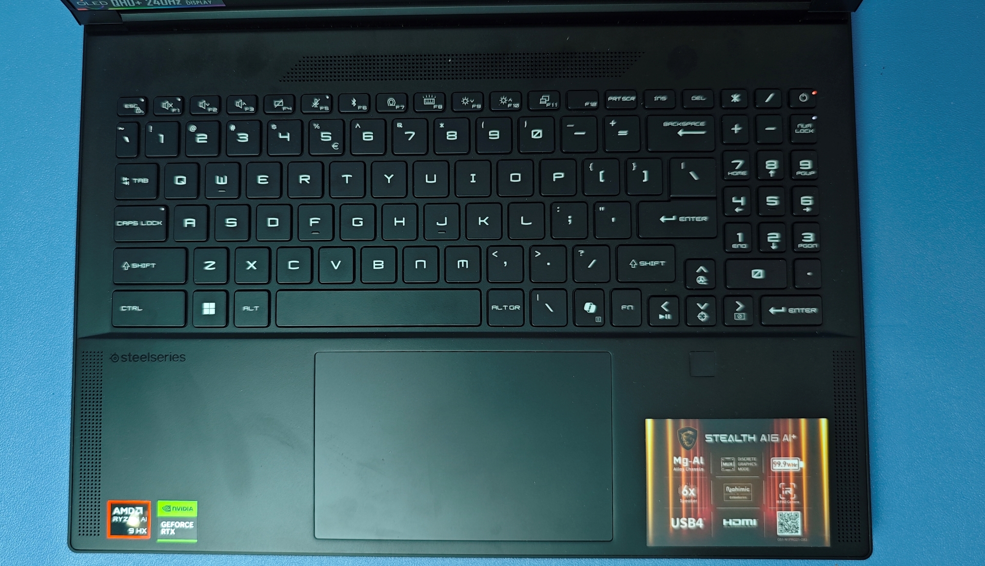 Στο θέμα των θυρών, το MSI Stealth A16 AI+ είναι σχεδόν πλήρες καθώς το μόνο που θα ζητούσαμε είναι ένας αναγνώστης καρτών μνήμης. Στη δεξιά πλευρά έχουμε μια Type-A USB 3.2 Gen 2 στα 10Gbs, έξοδο ακουστικών/είσοδο μικροφώνου, τη θύρα για τη χρήση του τροφοδοτικού και μια Type-C USB 4.0. Η τελευταία μπορεί να χρησιμοποιηθεί και σαν έξοδος εικόνας ενώ ταυτόχρονα μπορεί να χρησιμοποιηθεί και σαν θύρα φόρτισης Power Delivery με συμβατό φορτιστή 100 Watt. Βέβαια, σε αυτή τη περίπτωση το σύστημα δε μπορεί να φτάσει στη μέγιστη ισχύ του. Ακόμα και έτσι πάντως, είναι πολύ βολική αυτή η δυνατότητα γιατί κάποιος που θα αποφασίσει να μεταφέρει αλλού το σύστημα, δε χρειάζεται να πάρει και το τροφοδοτικό που τον συνοδεύει. Στην αριστερή πλευρά έχουμε έξοδο HDMI 2.1, μια ακόμα Type-A USB 3.2 Gen 2 στα 10Gbs και θύρα LAN 2.5G. Επιπλέον διαθέτει ασύρματη δικτύωση Wi-Fi 7 και Bluetooth 5.4, οπότε είμαστε καλυμμένοι.