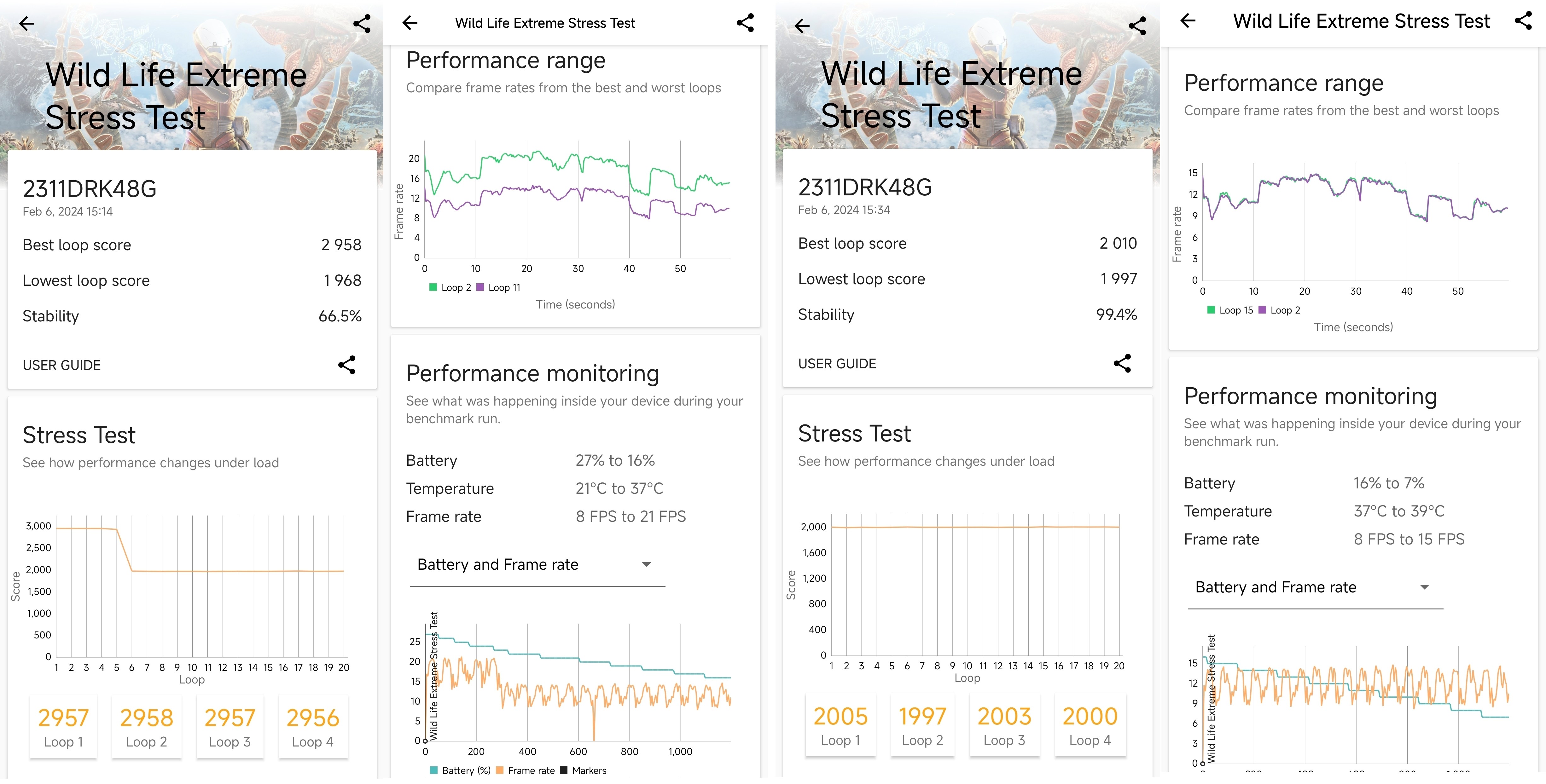 Για του λόγου το αληθές, δοκιμάσαμε και το Stress Test του 3D Mark Wild Life Extreme. Στη παρακάτω εικόνα βλέπετε το αποτέλεσμα δυο απανωτών runs του Stress Test. Αρχικά έχουμε ένα throttling της τάξης του 33,5%, με το σκορ να πέφτει από τους σχεδόν 3000 πόντους στους σχεδόν 2000, και τρέχοντας ξανά το ίδιο τεστ, οι επιδόσεις παραμένουν ίδιες για τα επόμενα 20 λεπτά (γύρω στους 2000 πόντους). Στη πράξη, το SoC μπορεί να διατηρεί επ' άπειρον υψηλές επιδόσεις, με τη Poco προφανώς να έχει ρυθμίσει έτσι το SoC ώστε να μην ανεβάζει ψηλά θερμοκρασίες (μέγιστη τιμή 39 βαθμοί μετά από 40 λεπτά συνεχούς benchmarking στα όρια). Αυτό που πιστεύουμε είναι πως το τηλέφωνο τρέχει σε μέγιστες επιδόσεις για λίγο μόνο στο 3D Mark, με τις πραγματικές του επιδόσεις στα παιχνίδια να είναι αντιστοιχούν στους περίπου 2000 πόντους, κάτι που άλλωστε παρατηρήσαμε και στο God of War 2 με τον AetherSX2 emulator του PS2.