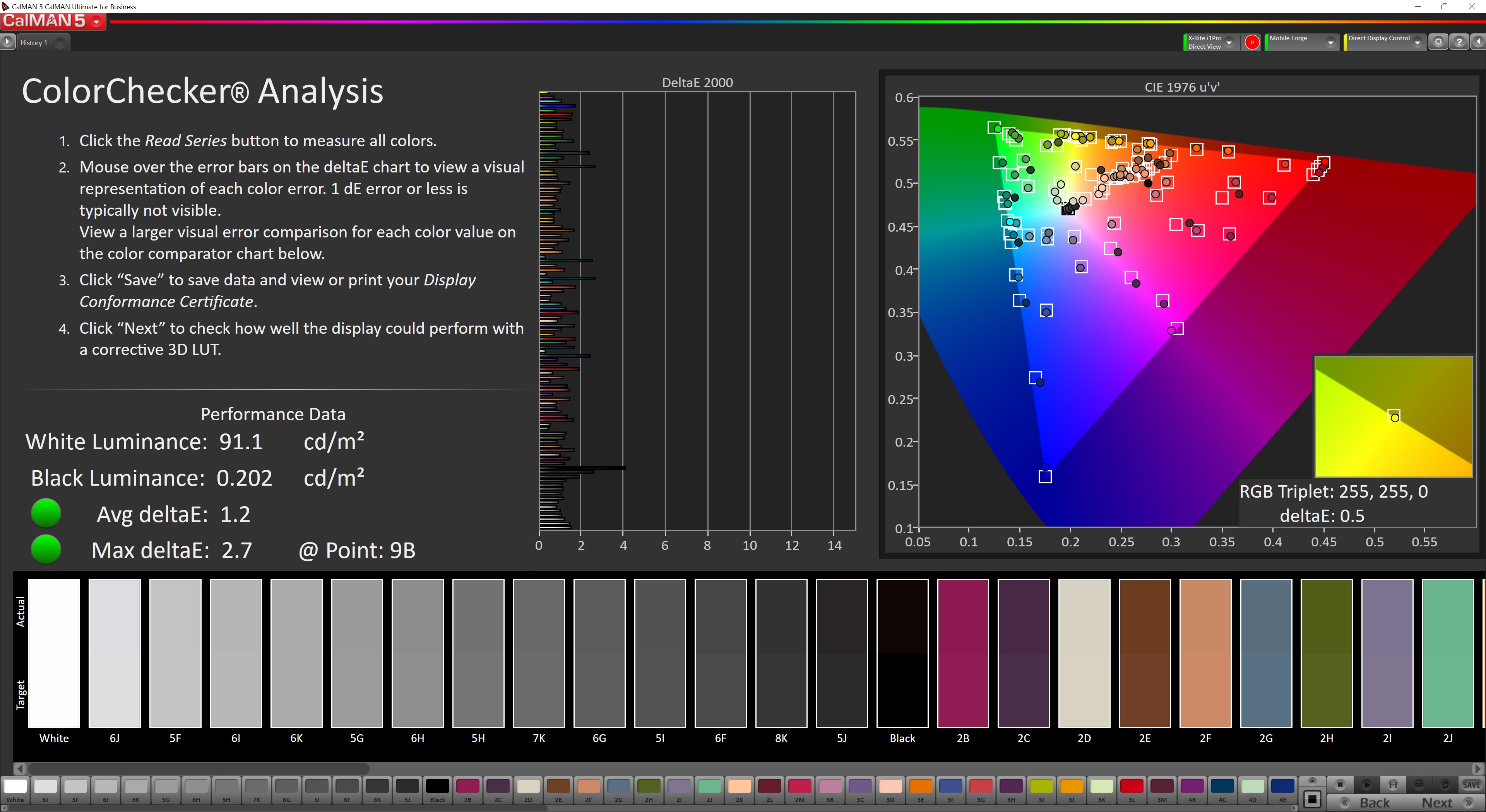 Το panel προσφέρει υποστήριξη HDR και Dolby Vision, χαρακτηριστικά που είναι διαθέσιμα και στο Netflix (το οποίο παίζει τα βίντεο σε Full HD ανάλυση). Μετρήσαμε μέγιστη φωτεινότητα της τάξης των 435 nits. Η μέγιστη φωτεινότητα στο auto brightness κάτω από ηλιακό φως φτάνει στα 826 nits. Σε περιβάλλον HDR, μετρήσαμε φωτεινότητα 1350nits σε παράθυρο μεγέθους 7% της οθόνης και 1045nits στο 100% της οθόνης. Η εταιρεία δίνει peak brightness της τάξης των 1800 nits, τιμή όμως που μπορεί να μετριέται σε ακόμα μικρότερο παράθυρο. Χρωματικά, έχουμε συνηθίσει το standard προφίλ να είναι αυτό που πετυχαίνει τα καλύτερα χρώματα. Εδώ όμως και σε αυτό το προφίλ η οθόνη είναι κάπως ψυχρή (θερμοκρασία χρώματος 7166 βαθμοί Κέλβιν) και τα χρώματα δεν είναι σωστά. Αλλάζοντας τη θερμοκρασία στο Warm, πετύχαμε 6675 βαθμού Κέλβιν και άριστα ρυθμισμένα χρώματα (με deltaE της τάξης του 1,2).
