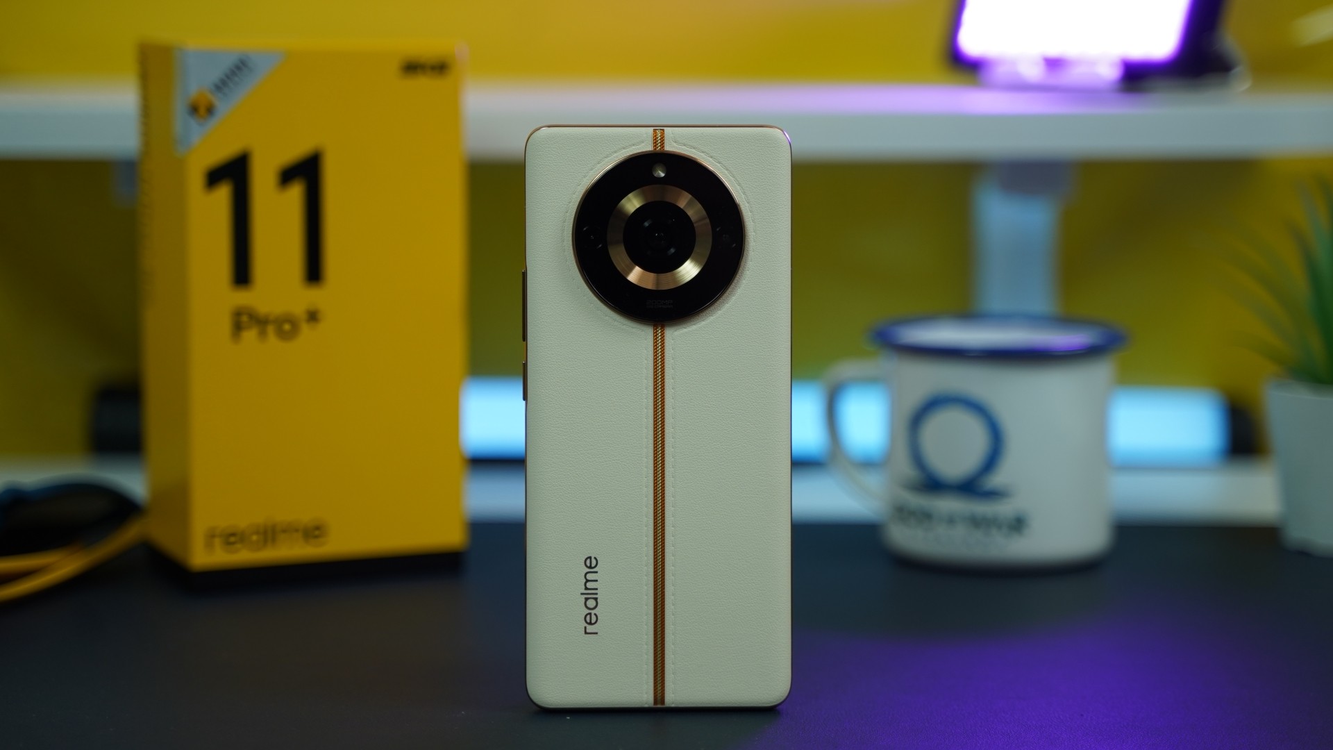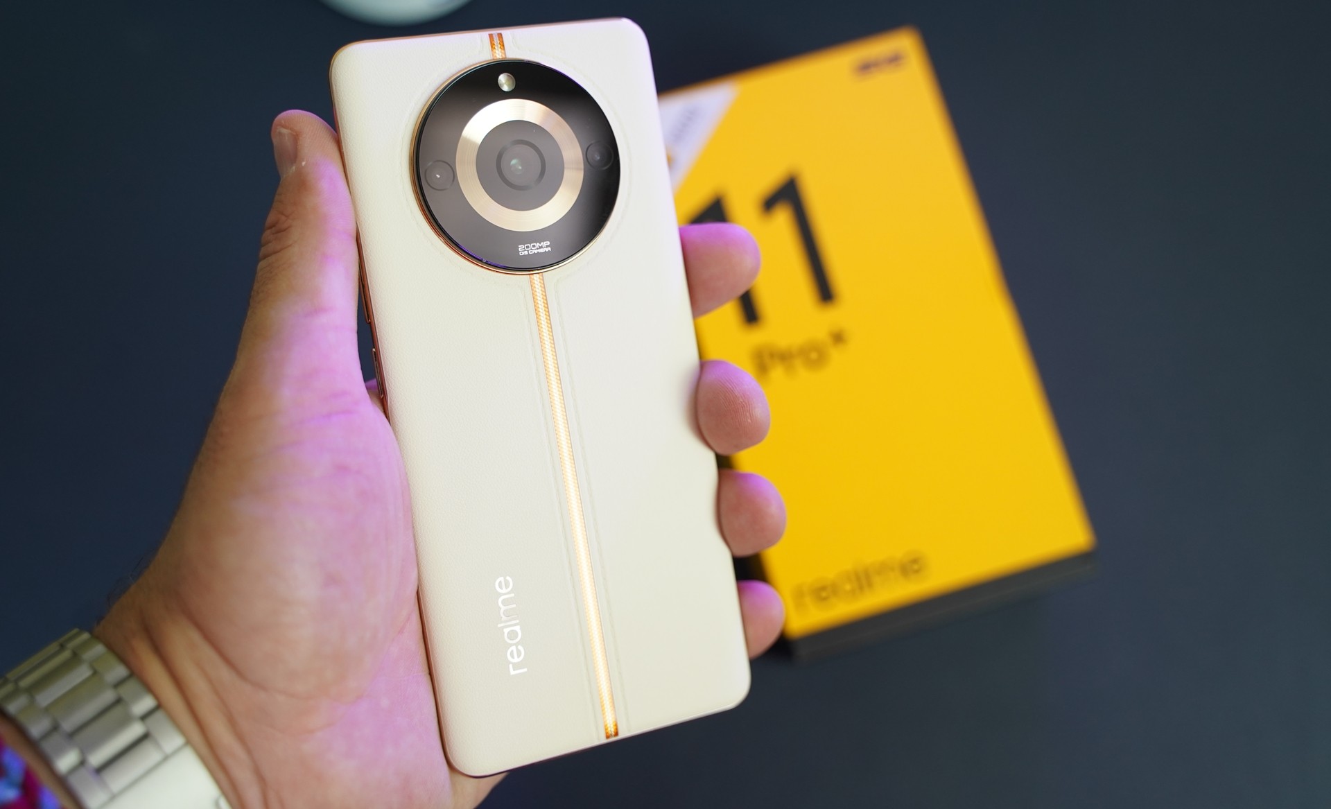 Στη πανέμορφη πλάτη συναντάμε και το τριπλό σύστημα καμερών με το led flash, τα οποία είναι τοποθετημένη σε ένα μεγάλο, κυκλικό camera bump. Ο σχεδιασμός της πλάτης λοιπόν είναι εμπνευσμένος από την ανατολή του ήλιου στην πόλη του Μιλάνου και χρησιμοποιεί κορυφαίο συνθετικό δέρμα(Lychee Vegan Leather) το οποίο είναι ανθεκτικό στη βρωμιά. Η πλάτη διασχίζεται κάθετα από μια χρυσή λωρίδα ενώ μπορεί κανείς να δει και τις ραφές του δέρματος. Η υφή που έχει επιτρέπει στο χρήστη να το κρατά άνετα χωρίς αυτό να γλιστά και έτσι δεν απαιτείται θήκη τηλεφώνου. Πραγματικά είναι πανέμορφη και όσοι είδαν το realme 11 Pro+, τους άρεσε πολύ.