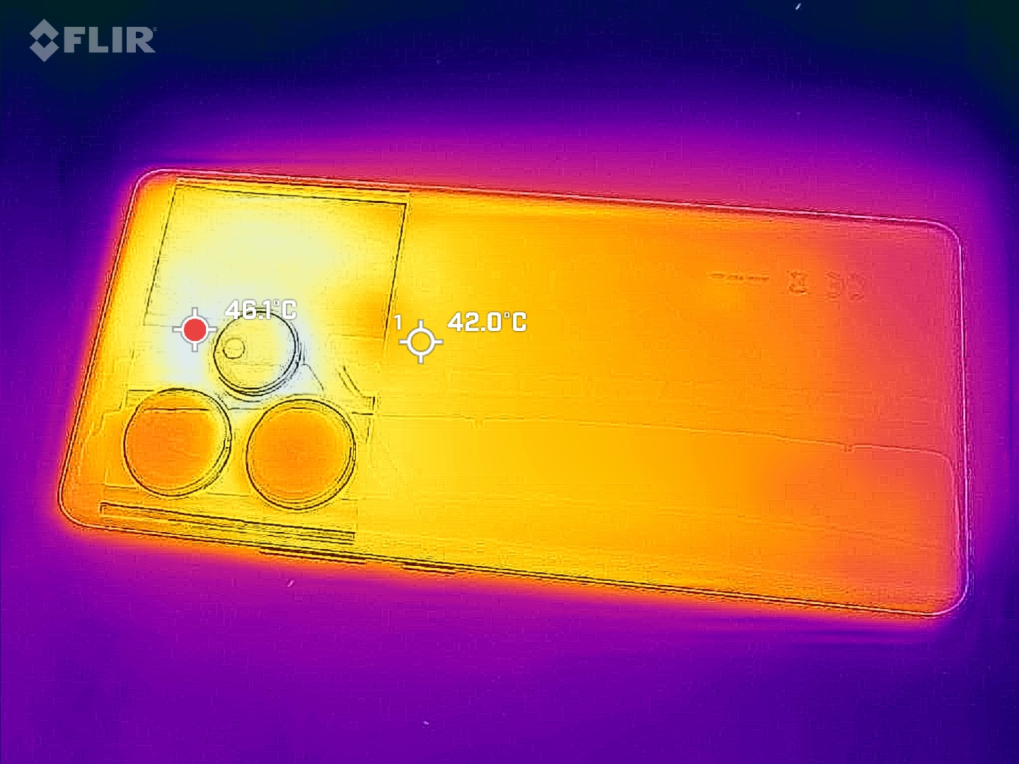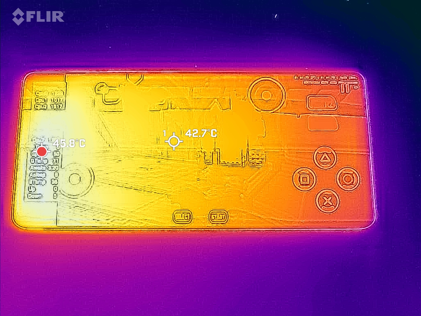 Ακόμα και έτσι βέβαια, μπορεί κανείς να παίξει του God of War 2 σε ανάλυση 3x της αρχικής, όμως δε θα μπορέσει να το κάνει για ώρα. Σχετικά γρήγορα η θερμοκρασία ανεβαίνει και το τηλέφωνο ξεκινά το throttling (58,6% stability στο 3D Mark), φτάνοντας ακόμα και τους 46 βαθμούς στο κομμάτι δίπλα στις κάμερες, που προφανώς είναι το chipset. Γενικότερα το τηλέφωνο το νοιώθει κανείς να ζεσταίνεται, καθώς όσο καλό και να είναι το παθητικό σύστημα ψύξης που έχει εφαρμόσει η realme, έχουμε να κάνουμε με μια λεπτή συσκευή που δε μπορεί να αντέξει πολύ ώρα υπερβολικού load (όπως είναι το emulation) χωρίς throttling.