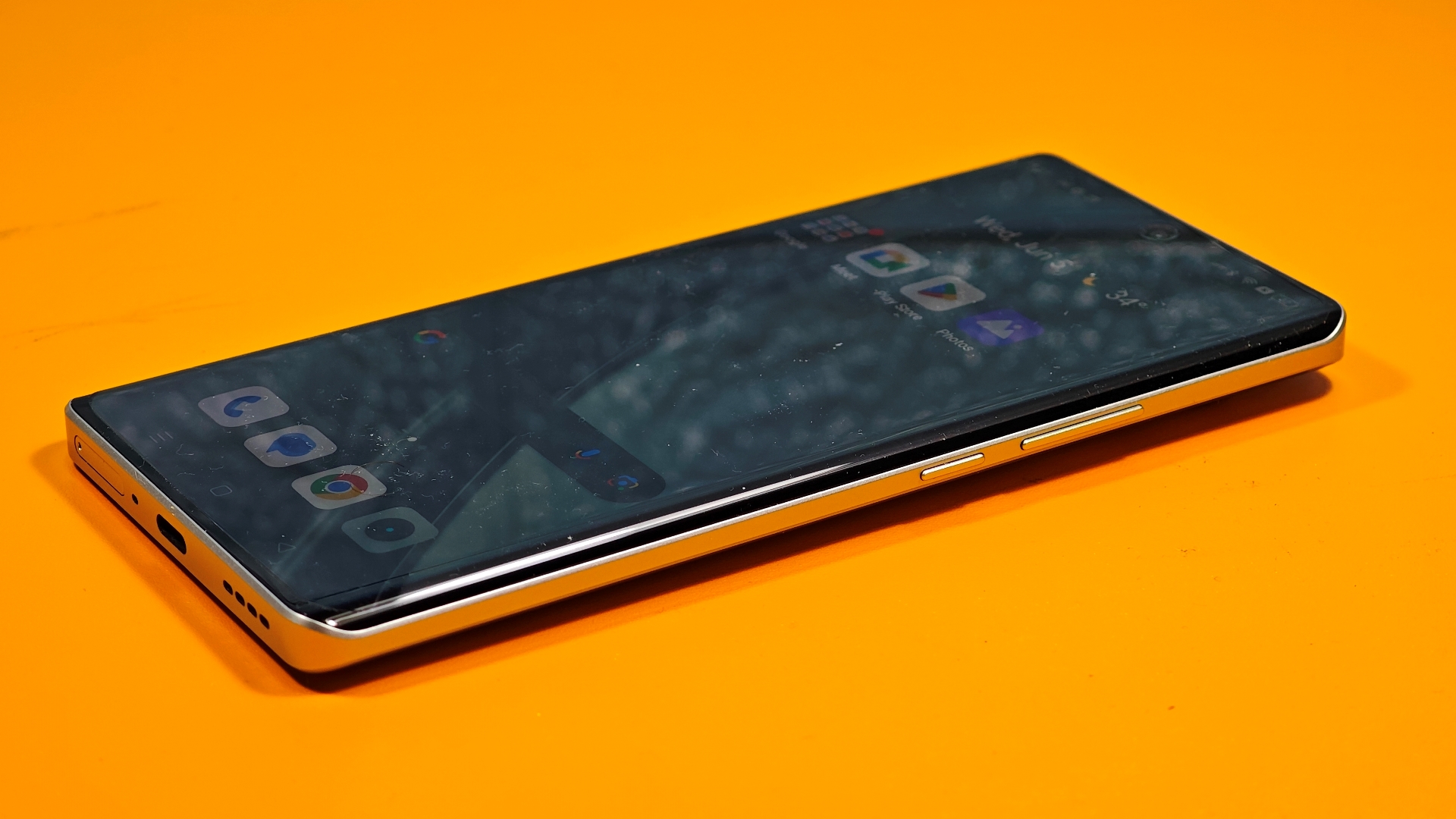 Παίρνοντας τη συσκευή στο χέρι, αντιλαμβάνεται μια premium αίσθηση. Το realme GT 6 δεν είναι μικρό σε διαστάσεις αλλά σίγουρα είναι αρκετά λεπτό σε σχέση με τα περισσότερα flagship και εξαιρετικά ελαφρύ (199 γραμμάρια). Αν και η οθόνη είναι μεγάλη στις 6,78’’, το τηλέφωνο είναι άνετο στη χρήση, με την –έντονα- curved στις δυο πλευρές οθόνη και αντίστοιχα curved πλάτη να βοηθάνε τη παλάμη να το αγκαλιάζει. Το πλαίσιο είναι πλαστικό μεν, αλλά έχει ματ μεταλλική όψη, με επίπεδες όλες τις πλευρές του. Στη δεξιά πλευρά βρίσκουμε το πλήκτρο power και τα volume control πλήκτρα, ενώ στο κάτω μέρος είναι η USB Type-C (δυστυχώς USB 2.0) παρέα με το ένα ηχείο, το ένα μικρόφωνο και το tray για τη τοποθέτηση έως 2 καρτών nano SIM, χωρίς να υπάρχει δυνατότητα για χρήση e-sim.