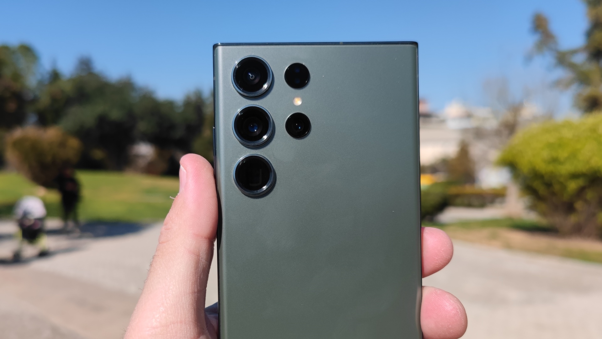 Όσον αφορά τώρα στη πλάτη, έχουμε και εδώ γυαλί Gorilla Glass Victus 2 με τη Samsung να έχει επιλέξει μια ματ επίστρωση, η οποία πέρα από το γεγονός ότι είναι πανέμορφη, βοηθάει ώστε να μη μένουν αποτυπώματα πάνω στην επιφάνεια. Στη πλάτη βρίσκεται και το τετραπλό σύστημα καμερών, με κάθε μια να είναι τοποθετημένη στο δικό της camera bump, τα οποία είναι ελαφρώς μεγαλύτερα σε σύγκριση με τα αντίστοιχα του S22 Ultra. Ένα πέμπτο «νησί» ενσωματώνει τον αισθητήρα υπερύθρων που βοηθάει ώστε να γίνει καλύτερα και ταχύτερα η εστίαση, κυρίως όταν χρησιμοποιείται ο βασικός αισθητήρας. Όσον αφορά στις κάμερες, όλες ενσωματώνουν dual pixel PDAF auto focus και σαν γενικά specs, ακολουθούν τα αντίστοιχα του S22 Ultra με εξαίρεση τη βασική η οποία είναι ολοκαίνουρια.