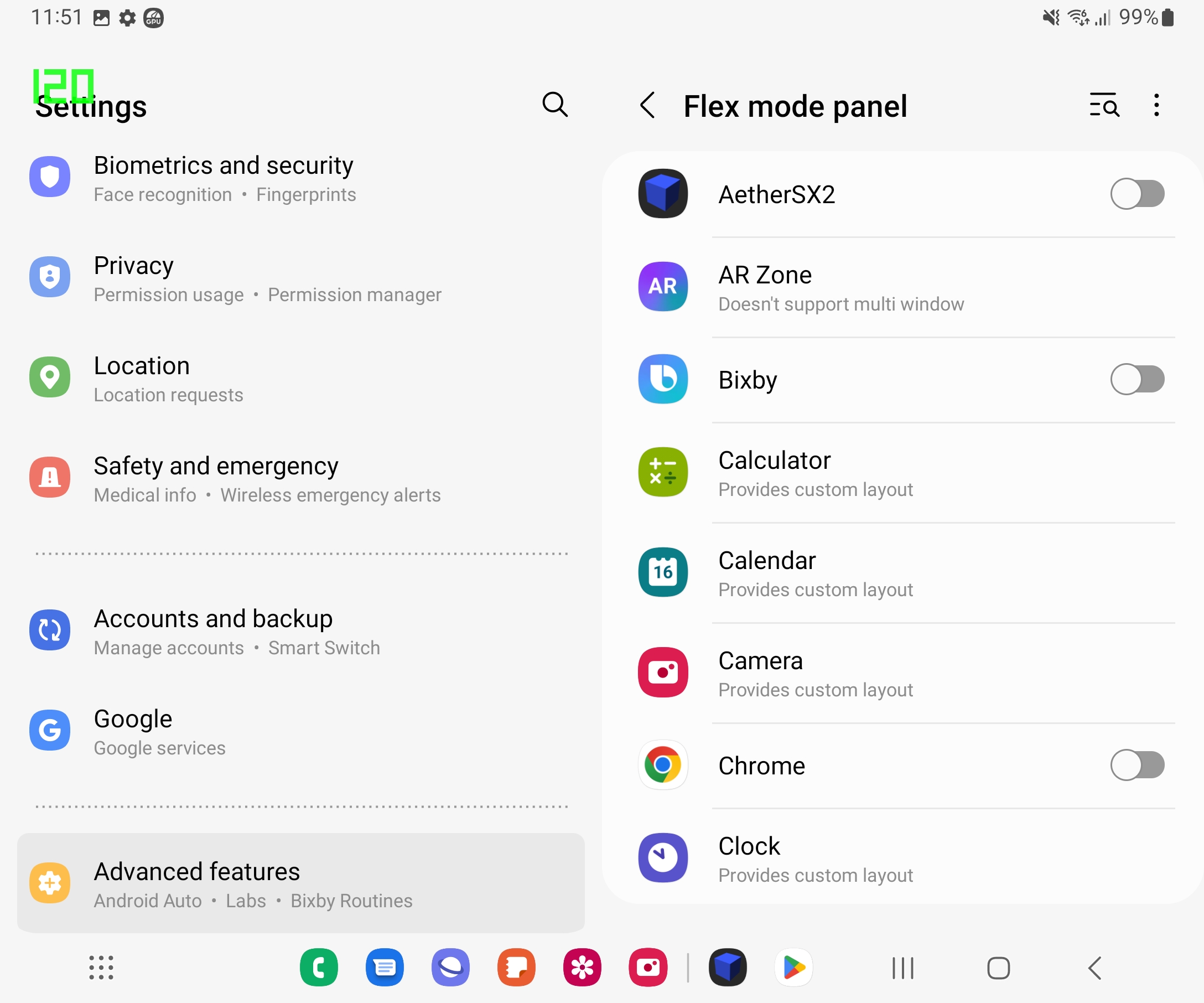 Μέχρι τρεις εφαρμογές μπορούν να τρέξουν στην οθόνη ταυτόχρονα σε split screen και μια τέταρτη μπορεί να φορτώσει σε παράθυρο. Το γεγονός ότι η οθόνη διπλώνει έδωσε την ευκαιρία στη Samsung να δημιουργήσει και ένα νέο τρόπο χρήση του smartphone, χωρίς αυτό να είναι τέρμα ανοιχτό. Μπορούμε λοιπόν να τοποθετήσουμε το τηλέφωνο πάνω σε μια επιφάνεια και να ανασηκώσουμε το πάνω τμήμα του κατά 90 μοίρες. Με αυτό τον τρόπο πχ μπορούμε να χρησιμοποιήσουμε τις κάμερες του τηλεφώνου για να βγάλουμε φωτογραφίες/βίντεο, χωρίς να το κρατάμε ή ακόμα καλύτερα μπορούμε να κάνουμε βίντεο-κλήσεις πάλι χωρίς να κρατάμε ή να χρειάζεται μια βάση στήριξης το τηλέφωνο. Μάλιστα, η Samsung έχει πειράξει την εφαρμογή χρήσης των καμερών ώστε να εκμεταλλευτεί το νέο form factor. Όταν το τηλέφωνο είναι πλήρως ανοιχτό, η εφαρμογή εμφανίζεται με το τυπικό τρόπο.