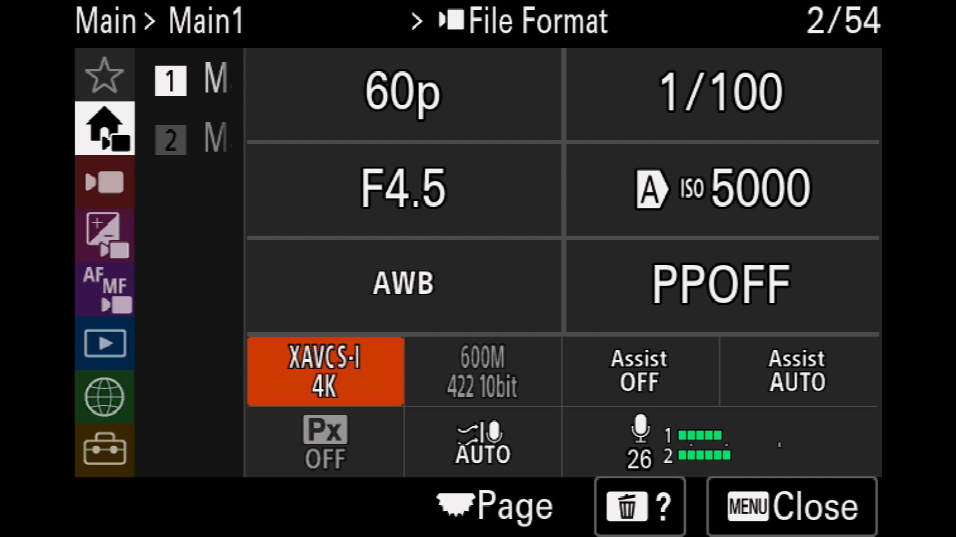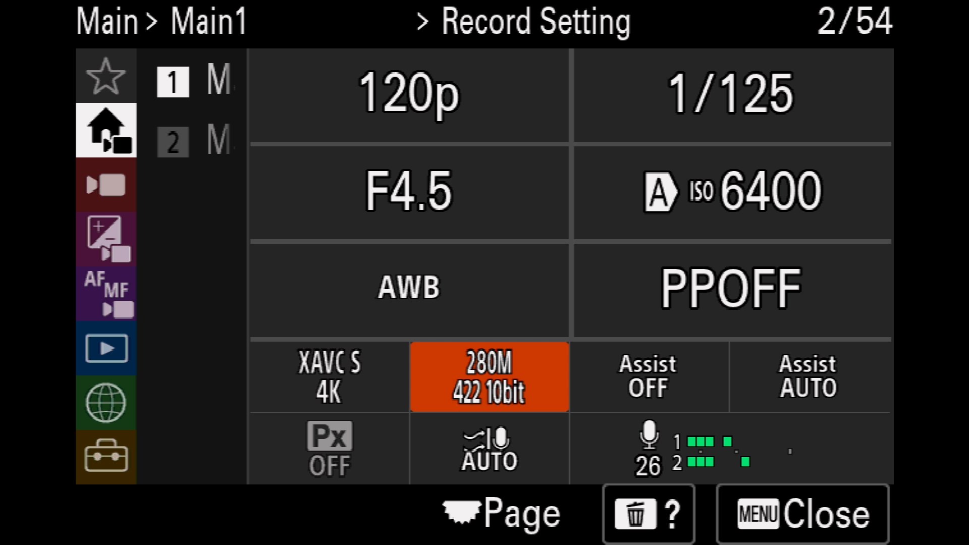 Από εκεί και πέρα τώρα, έχουμε δυνατότητες για εγγραφή σε ανάλυση 1080p και 4K με frame rates έως 120fps και με διάφορους codec. Συγκεκριμένα μπορούμε να γράψουμε έως 4K120 με XAVC S τόσο σε 8bit (4:2:0, 200Mbps) όσο και σε 10bit (4:2:2, 280Mbps) αλλά και με XAVC HS (δηλαδή h265, δύσκολος codec για edit) με τις ίδιες ρυθμίσεις. Για τα 120fps πάντως απαιτείται κάρτα SD τεχνολογίας V60 ενώ ταυτόχρονα υπάρχει μεγάλο crop που αγγίζει το 1,6x (πάνω από το υπάρχον crop του αισθητήρα). Επίσης, όταν έχουμε 120fps δε μπορούμε να χρησιμοποιήσουμε το Active Stabilization καθώς με αυτό το frame rate η κάμερα παίρνει την εικόνα από το κέντρο του αισθητήρα και δε κάνει oversampling από 6K ανάλυση όπως συμβαίνει στα χαμηλότερα frame rate (όπου υπάρχει πάλι crop, αλλά ανεπαίσθητο. Το καλύτερο mode για εγγραφή βίντεο είναι το XAVXS-I το οποίο πάει μέχρι 4K60 (μόνο 10bit, 4:2:2, 600Mbps bitrate), όμως απαιτείται κάρτα SD τεχνολογίας V90.