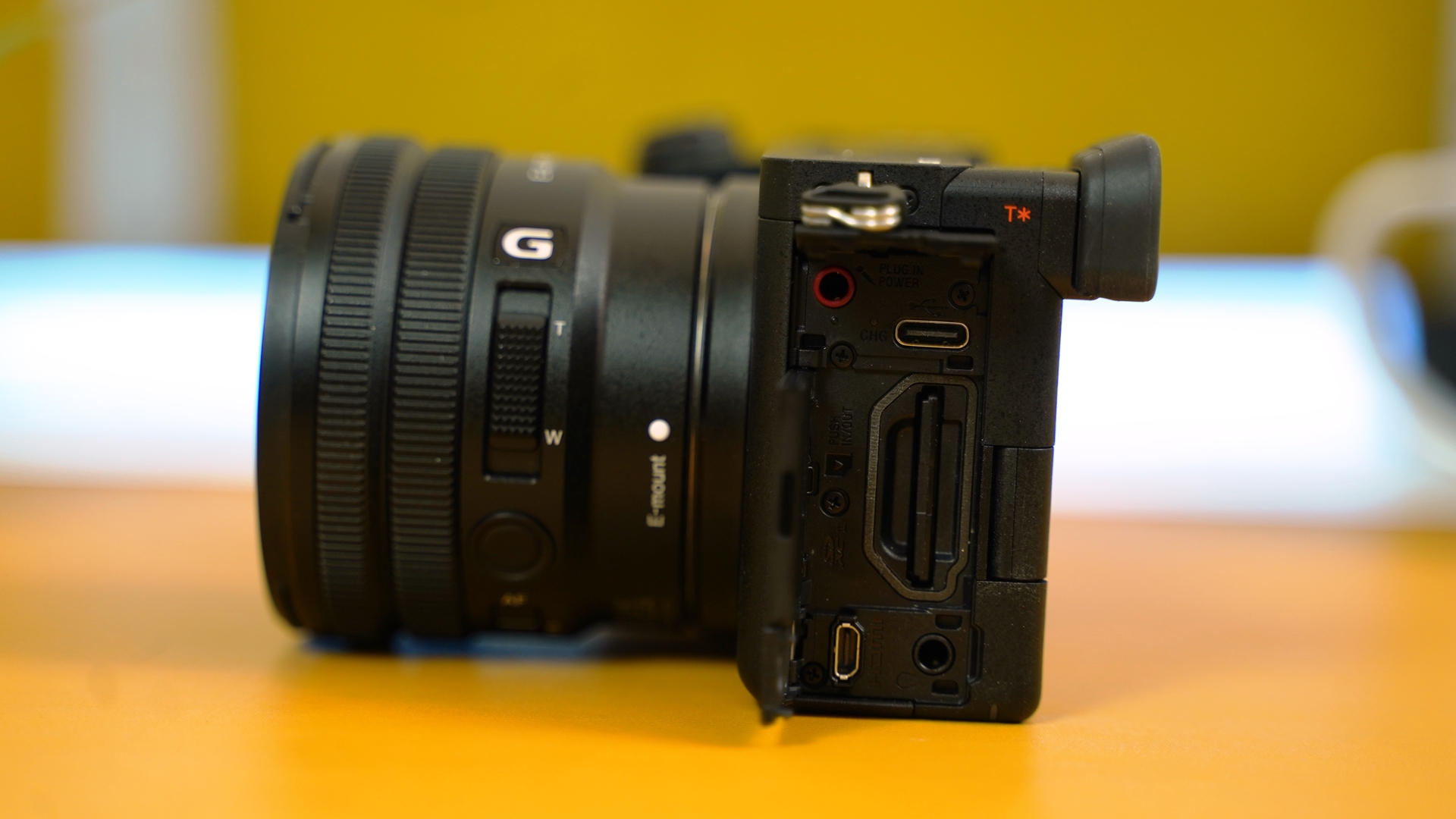Στην αριστερή πλευρά έχουμε όλες τις θύρες επικοινωνίας της μηχανής πίσω από τρια πορτάκια. Το πάνω πορτάκι έχει ένα mini-jack για είσοδο μικροφώνου και τη Type-C USB για τη φόρτιση της μπαταρίας ή και τη σύνδεση με τον υπολογιστή. Μέσω της Type-C USB η Sony a6700 μπορεί να χρησιμοποιηθεί και σαν web camera για τον υπολογιστή εφόσον ενεργοποιήσουμε τη σχετική επιλογή από το menu.