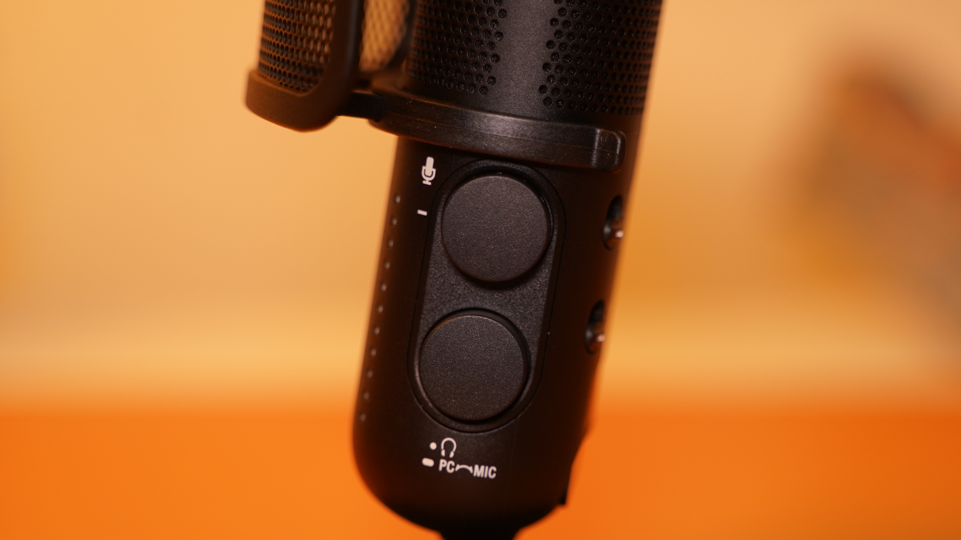 Αυτό πατιέται και μας δίνει τη δυνατότητα να ελέγξουμε την ένταση της εξόδου ακουστικών που βρίσκεται στο πίσω μέρος. Εκεί υπάρχει επίσης μια θύρα Type-C USB που χρησιμοποιείται για τη φόρτιση της μπαταρίας αλλά και για την ενσύρματη σύνδεση του μικροφώνου με υπολογιστή, κινητό ή tablet καθώς το ίδιο το μικρόφωνο μπορεί να λειτουργήσει έτσι αυτόνομα.