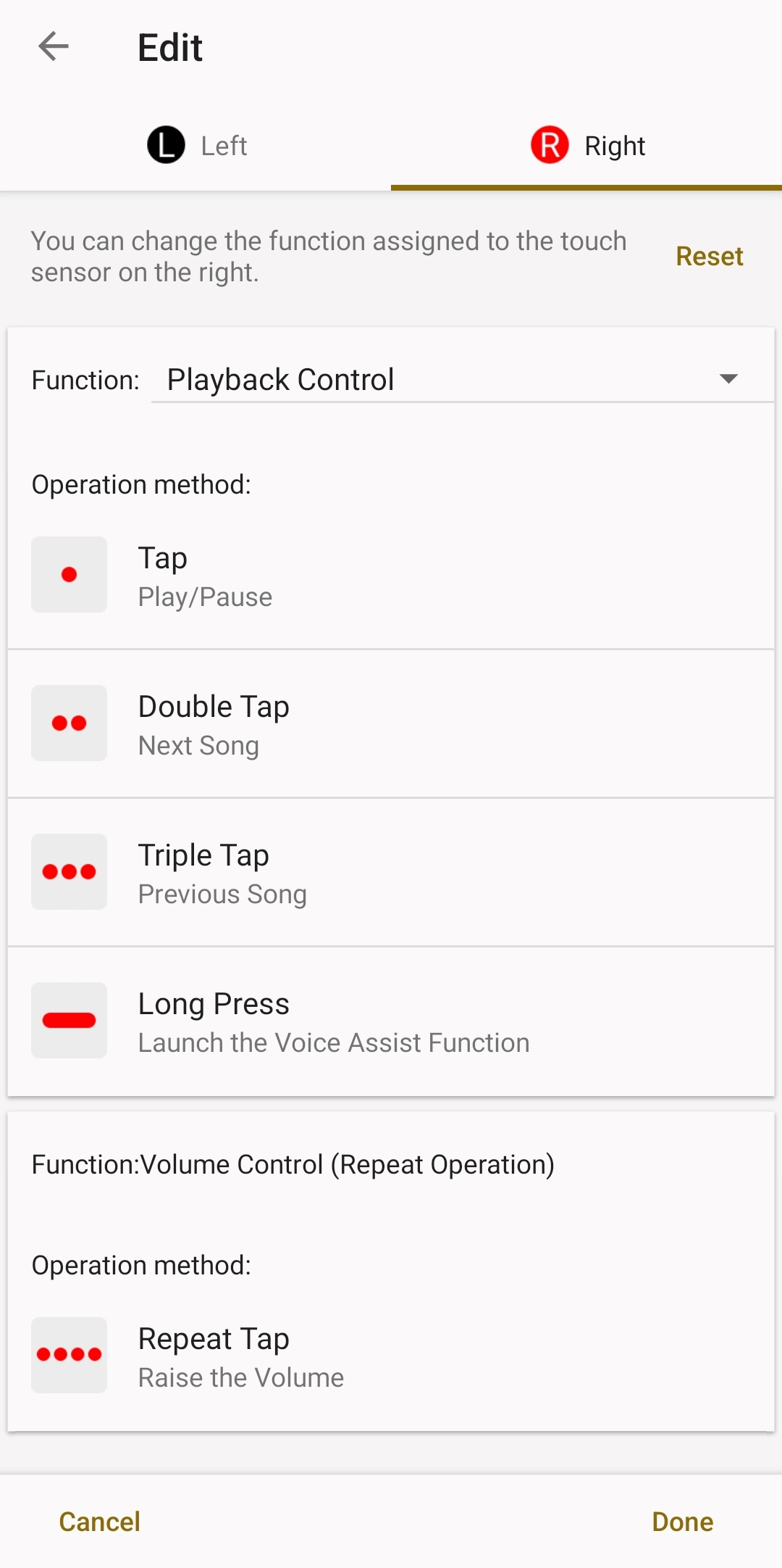 Και τα δυο ακουστικά έχουν επιφάνεια αφής στην εξωτερική πλευρά τη οποία μπορεί να ρυθμίσει ο χρήστης τι θα κάνει σε καθένα από τα δυο. Η αρχική ρύθμιση θέλει την επιφάνεια στο δεξί ακουστικό να ρυθμίζει την αναπαραγωγή μουσικής (Play/Pause, προηγούμενο/επόμενο τραγούδι με μονό, διπλό και τριπλό tap). Με παρατεταμένο πάτημα ενεργοποιείται ο assistant. Η επιφάνεια αφής του αριστερού ακουστικού ενεργοποιεί τις λειτουργίες active noise cancelling.