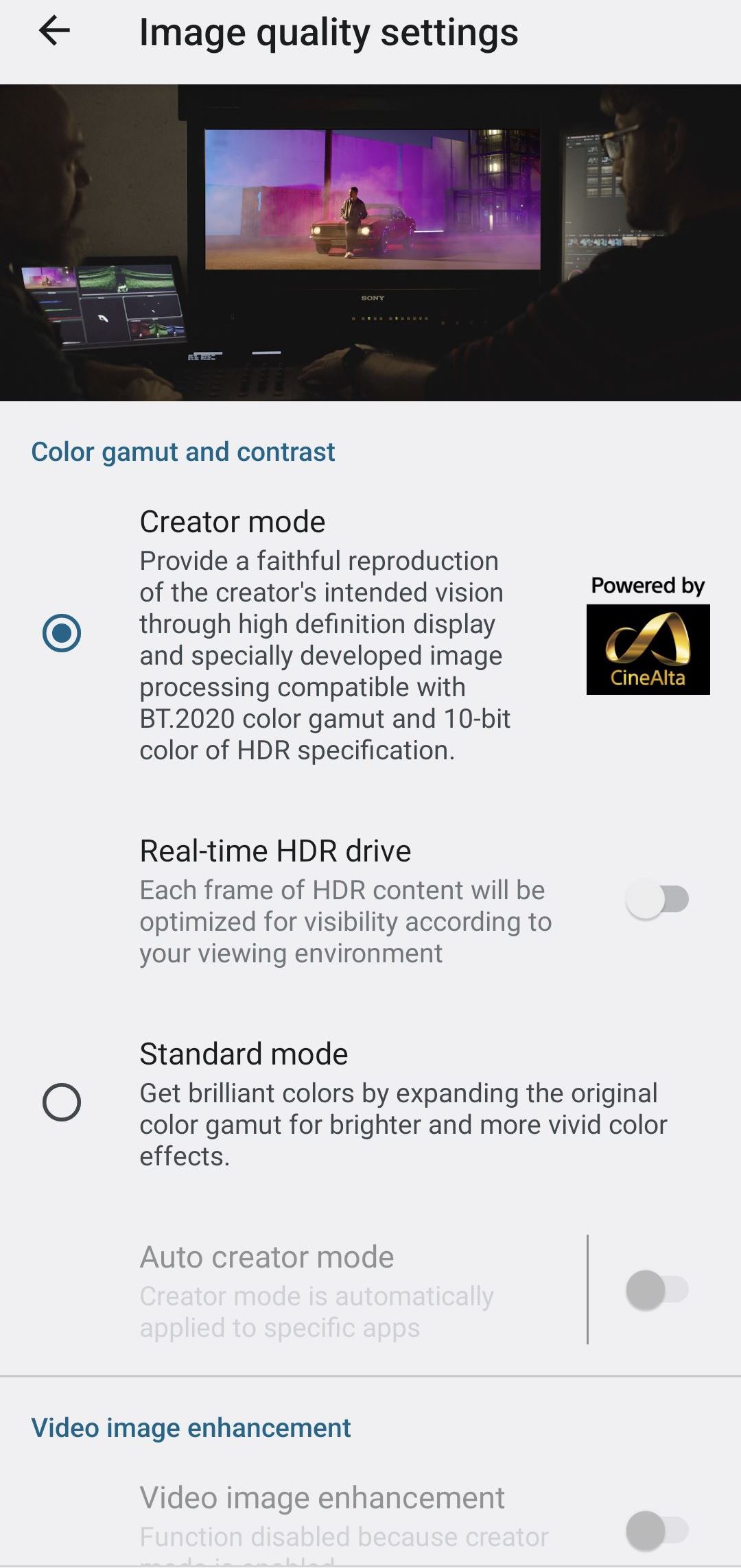 Από εκεί και πέρα, υπάρχουν ένα σωρό ρυθμίσεις που αφορούν στην οθόνη, μεταξύ των οποίων και το Creator Mode (powered by CineAlta), το οποίο προσπαθεί να αναπαράγει το BT.2020 χρωματικό φάσμα, για να δώσει τη καλύτερη δυνατή HDR απεικόνιση. Να σημειώσουμε ότι το Standard χρωματικό mode είναι αρκετά ψυχρό και μας έδωσε μεγάλο DeltaE, το οποίο έγινε σαφώς καλύτερο βάζοντας τη θερμοκρασία χρώματος στο Warm, χωρίς να προβούμε σε περεταίρω αλλαγές παρόλο που αυτές είναι δυνατές.