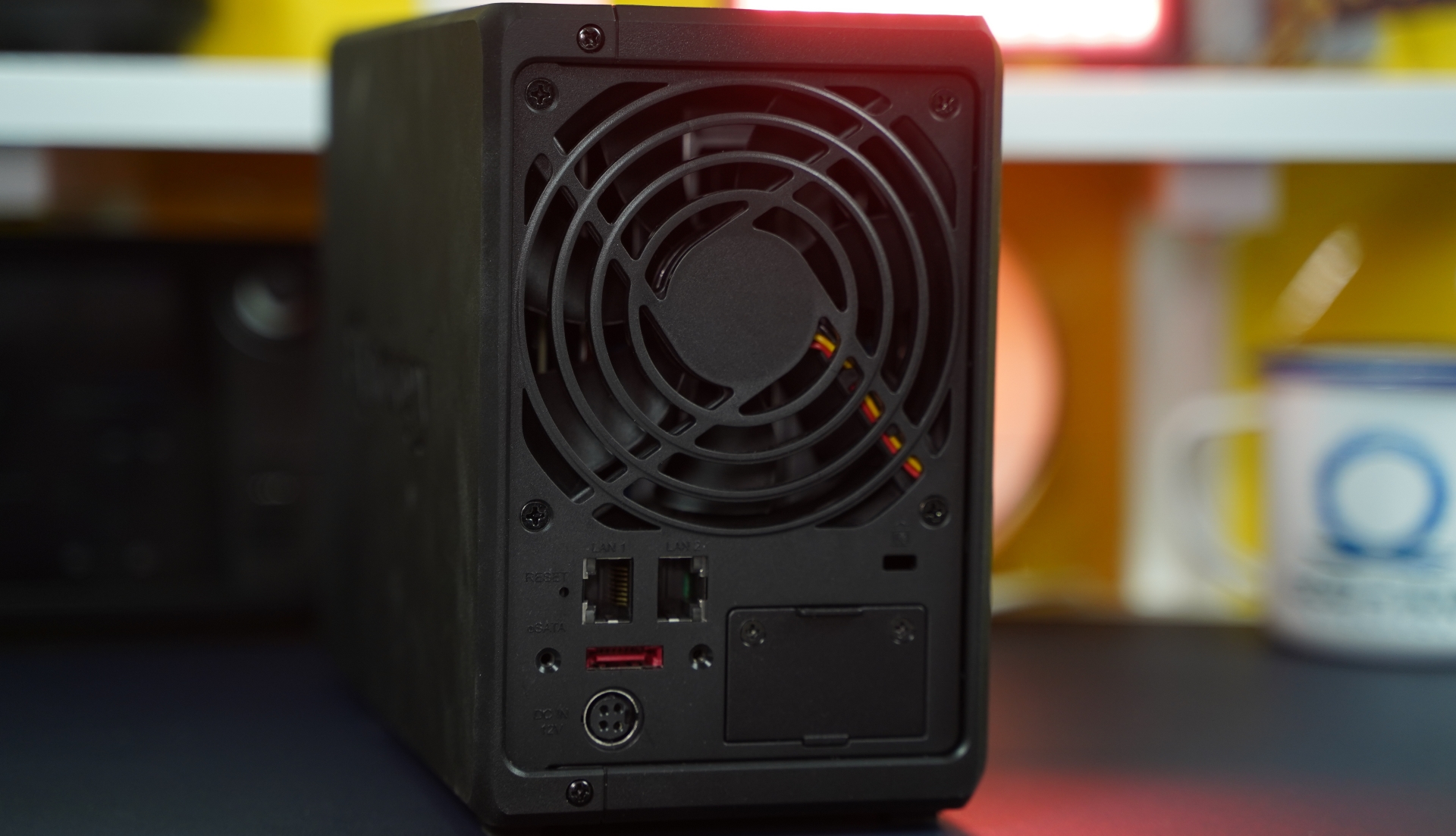 Στο πίσω μέρος βρίσκουμε δυο Gigabit Lan θύρες που μπορούν να λειτουργήσουν είτε με Link Aggregation για διπλασιασμό της ταχύτητας σύνδεσης με το δίκτυο είτε με λειτουργία Failover όπου η μια Lan λειτουργεί σαν backup της άλλης. Επίσης, υπάρχει η θύρα eSATA, ο μεγάλος (92mm) και σε γενικές γραμμές αθόρυβος ανεμιστήρας του συστήματος καθώς και ένα bay επέκτασης κρυμμένο πίσω από δυο βίδες. Σε αυτό μπορεί κανείς να εγκαταστήσει μια κάρτα PCI-E Gen 3 της Synology η οποία είναι στα 10Gb, κάτι που μπορεί να μετατρέψει το NAS σε ένα πραγματικά ταχύτατο εξωτερικό δίσκο, εφόσον υπάρξει απευθείας σύνδεση μεταξύ του NAS και ενός υπολογιστή με κάρτα δικτύου 10Gb. Μάλιστα, το NAS μπορεί να λειτουργεί ταυτόχρονα και σαν δικτυακή συσκευή χάρη στις δυο άλλες θύρες Lan!