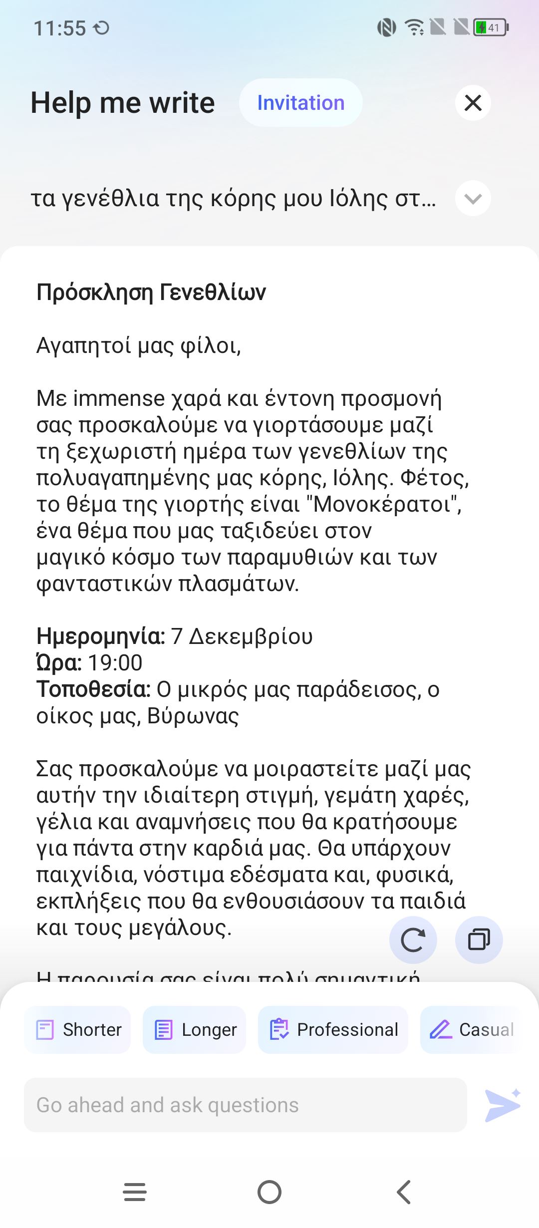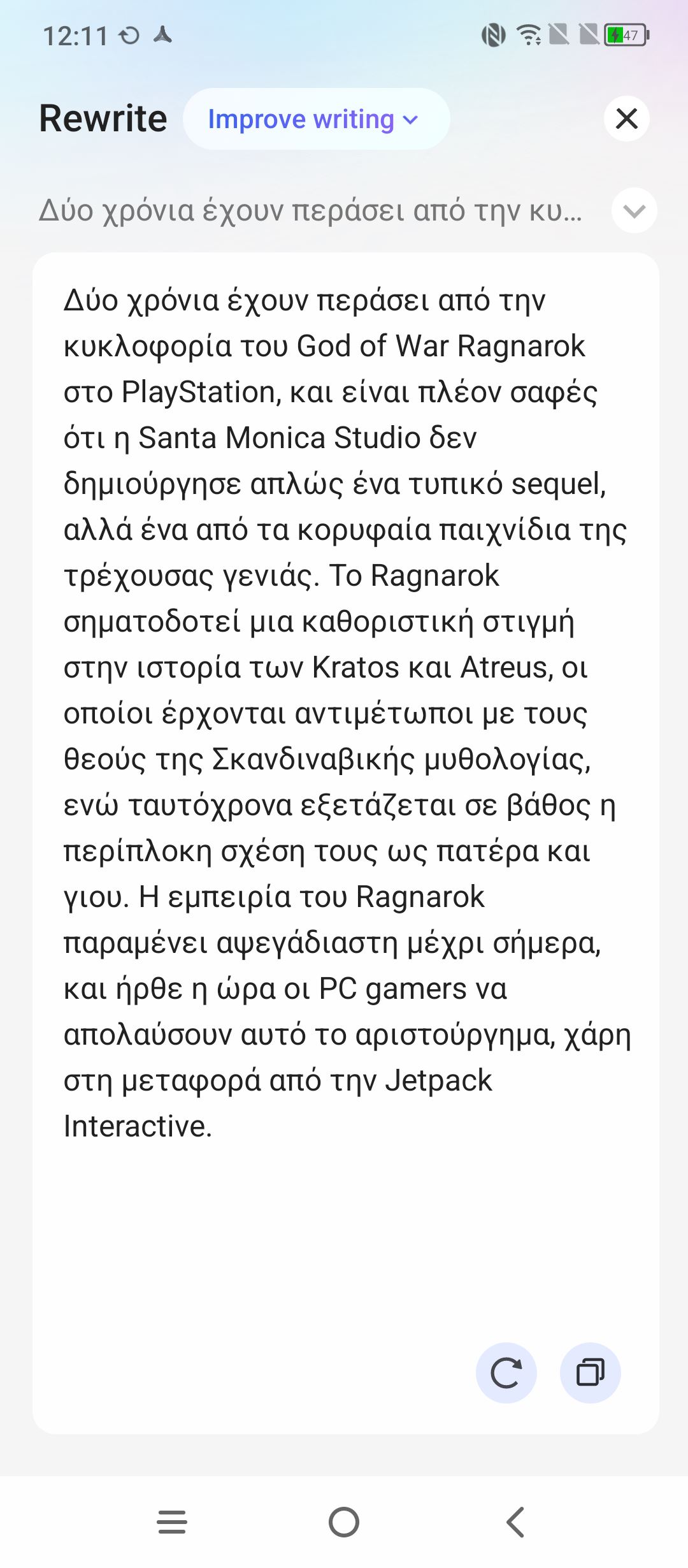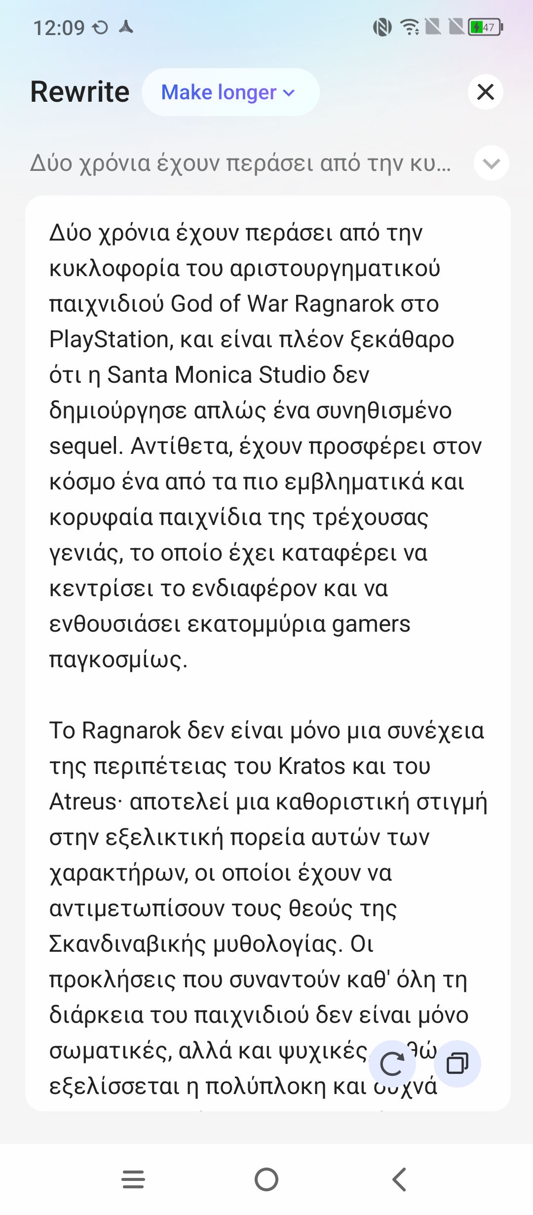 Πραγματικά, μείναμε εξαιρετικά εντυπωσιασμένοι με το τελικό αποτέλεσμα, πόσο μάλλον όταν στη συνέχεια μπορούμε αυτό να το κάνει μεγαλύτερο ή μικρότερο σε μέγεθος αλλά και να του αλλάξει το ύφος (επαγγελματικό ή casual). Η δημιουργία γίνεται ταχύτατα και φυσικά αυτό το κείμενο μπορούμε να το αντιγράψουμε για να το βάλουμε όπου θέλουμε. Τέλος, υπάρχει μια ακόμα εξαιρετικά χρήσιμη δυνατότητα που έχει να κάνει με κείμενο. Σχεδόν σε κάθε εφαρμογή, μπορούμε να επιλέξουμε ένα κείμενο και αφού κρατήσουμε το δάχτυλό μας πατημένο πάνω σε αυτό, τρεις επιλογές εμφανίζονται, η μετάφραση, η περίληψη και η επανεγγραφή του.