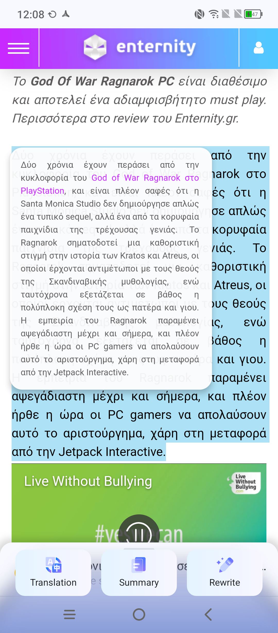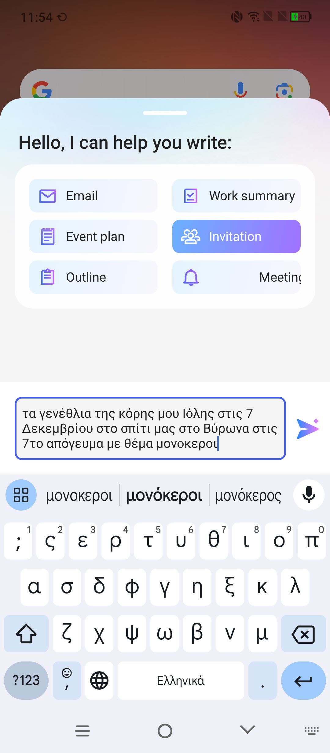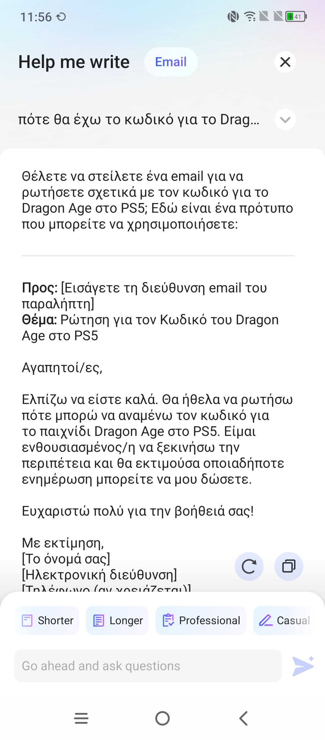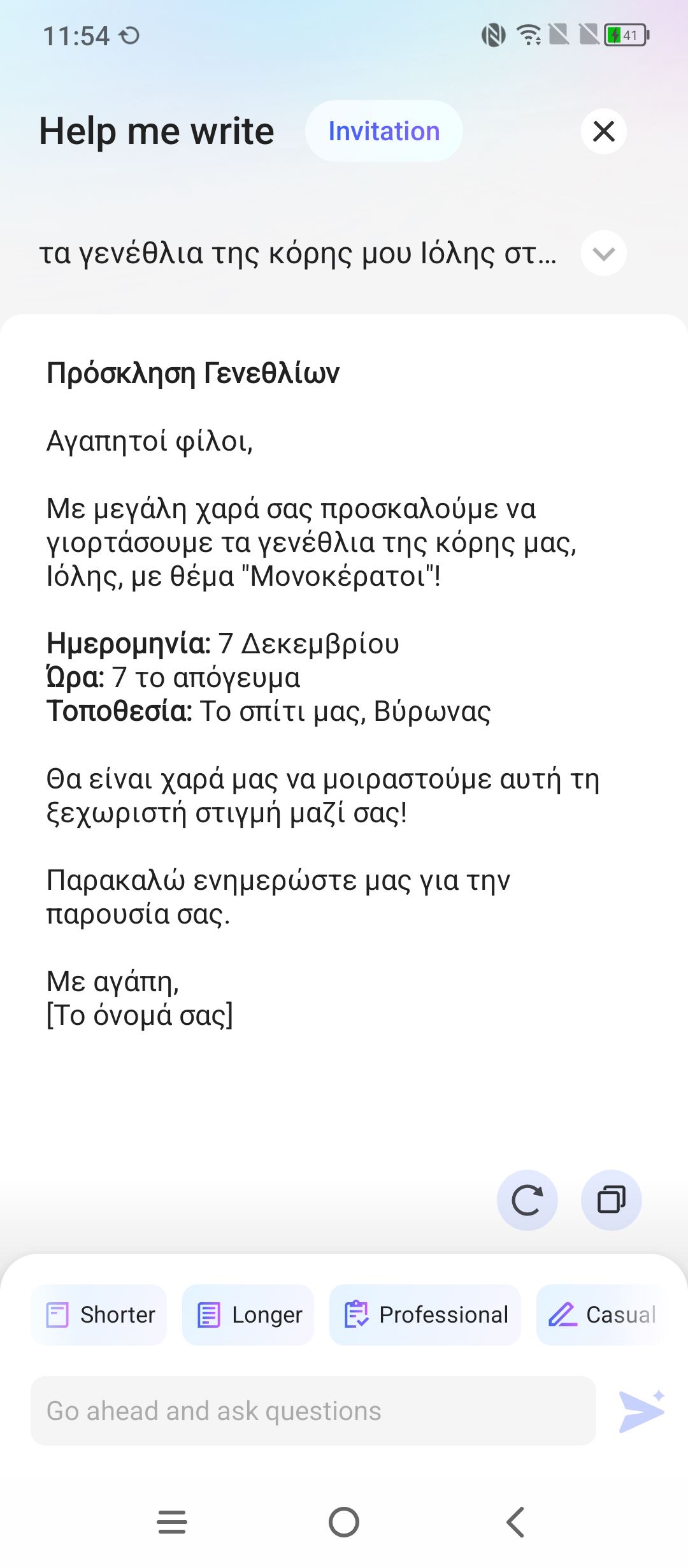 Πραγματικά, μείναμε εξαιρετικά εντυπωσιασμένοι με το τελικό αποτέλεσμα, πόσο μάλλον όταν στη συνέχεια μπορούμε αυτό να το κάνει μεγαλύτερο ή μικρότερο σε μέγεθος αλλά και να του αλλάξει το ύφος (επαγγελματικό ή casual). Η δημιουργία γίνεται ταχύτατα και φυσικά αυτό το κείμενο μπορούμε να το αντιγράψουμε για να το βάλουμε όπου θέλουμε. Τέλος, υπάρχει μια ακόμα εξαιρετικά χρήσιμη δυνατότητα που έχει να κάνει με κείμενο. Σχεδόν σε κάθε εφαρμογή, μπορούμε να επιλέξουμε ένα κείμενο και αφού κρατήσουμε το δάχτυλό μας πατημένο πάνω σε αυτό, τρεις επιλογές εμφανίζονται, η μετάφραση, η περίληψη και η επανεγγραφή του.