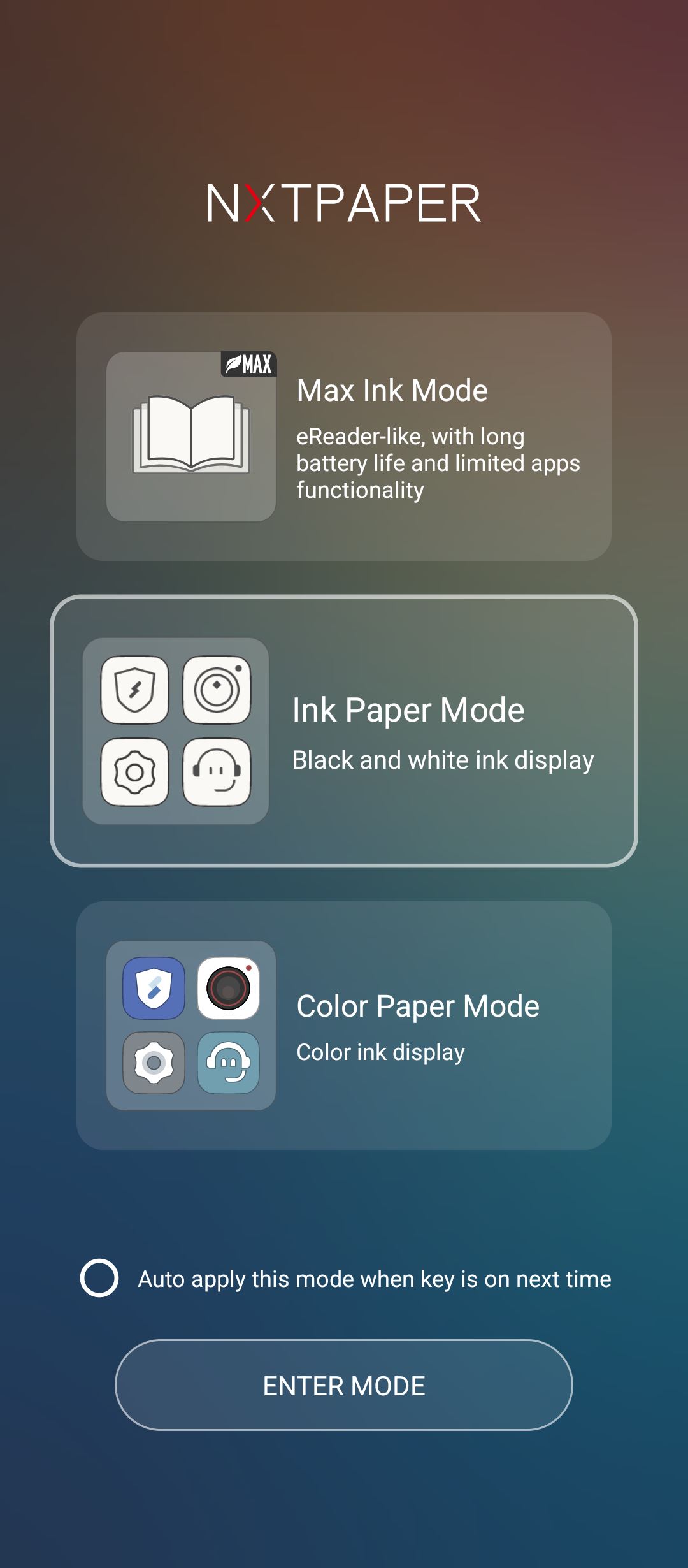 Αυτός λοιπόν ενεργοποιεί άμεσα το NXT Paper interface της οθόνης, βάζοντας το χρήστη να επιλέξει ένα από τα τρια διαθέσιμα mode: Color Paper, Ink Paper και Max Ink Paper. Ουσιαστικά, σε καθένα από αυτά τα mode, αλλάζει εντελώς η εμφάνιση του λειτουργικού συστήματος ώστε να εκμεταλλεύεται ακόμα περισσότερο τη ΝΧΤPaper οθόνη. Να σημειώσουμε βέβαια πως μπορεί κανείς να προβεί σε αυτές τις αλλαγές και μέσα από το ίδιο το λειτουργικό, απλά ο διακόπτης κάνει την εναλλαγή ταχύτερη. Σε κάθε περίπτωση, το interface αποκτά μια εμφάνιση που θυμίζει ακόμα περισσότερο χαρτί, είτε έγχρωμο (Color Paper) είτε μονόχρωμο (Ink Paper), ούτε ώστε η ανάγνωση έγχρωμων ή μονόχρωμων e books να γίνεται ακόμα περισσότερο ξεκούραστη, θυμίζοντας στο μέγιστο βαθμό ένα βιβλίο. Η τελευταία επιλογή, Max Ink Paper, είναι ίδια οπτικά με την Ink Paper, μόνο που εδώ το τηλέφωνο μπαίνει σε ένα τύπου ultra battery saver mode, με τις περισσότερες λειτουργίες και εφαρμογές να απενεργοποιούνται, ώστε η αυτονομία να αυξηθεί κατακόρυφα για την ανάγνωση βιβλίων! Γενικά η οθόνη προσφέρει μια ξεχωριστή εμπειρία στο χρήστη, ειδικά για όσους περνάνε πολλές ώρες διαβάζοντας στο κινητό τους, καθώς η τεχνολογία NXT Paper κάνει το διάβασμα εξαιρετικά ξεκούραστο, είτε μιλάμε για περιήγηση στο Internet είτε, ακόμα περισσότερο, όταν μιλάμε για ανάγνωση ηλεκτρονικών βιβλίων.