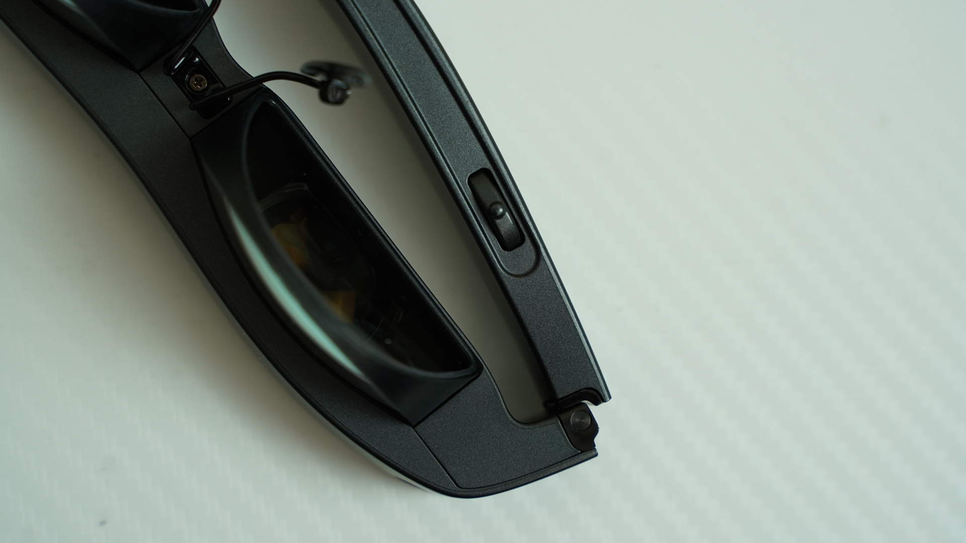 Στα μπράτσα ενσωματώνονται ηχεία, τα οποία πραγματικά παίζουν πολύ καλό ήχο, με το αριστερό μπράτσο να διαθέτει ρυθμιστικό έντασης. Στη μέγιστη ένταση, οι γύρω σας είναι πιθανό να ακούσουν τους ήχους που αναπαράγονται, αλλά σε οποιαδήποτε ρύθμιση κάτω από τη μέση πολύ δύσκολα θα συμβεί κάτι τέτοιο, την ώρα που εμείς θα ακούμε πραγματικά δυνατά και καθαρά. Στο δεξί μπράτσο έχουμε και ένα ρυθμιστικό φωτεινότητας για τις 2 μικρές οθόνες που ενσωματώνουν τα TCL NXTWEAR S, μια για καθένα από τα μάτια μας. Το μόνο παράπονο με τη ρύθμιση της φωτεινότητας είναι ότι στην ελάχιστη τιμή, η φωτεινότητα είναι πολύ χαμηλή αλλά το επόμενο βήμα να προσφέρει μεγάλη φωτεινότητα κάτι που σε συνθήκες χαμηλού περιβάλλοντος φωτισμού να είναι κουραστικό.