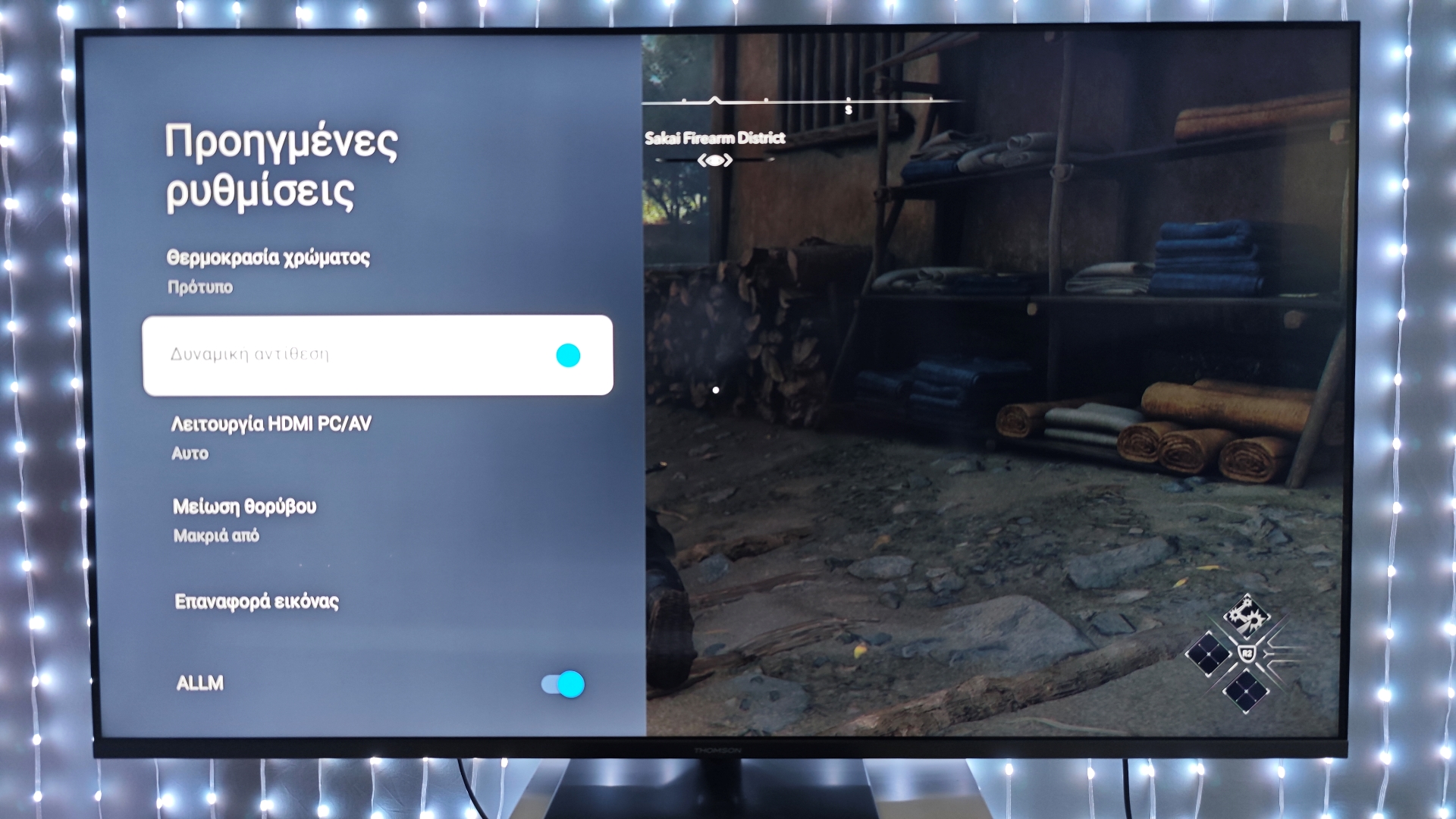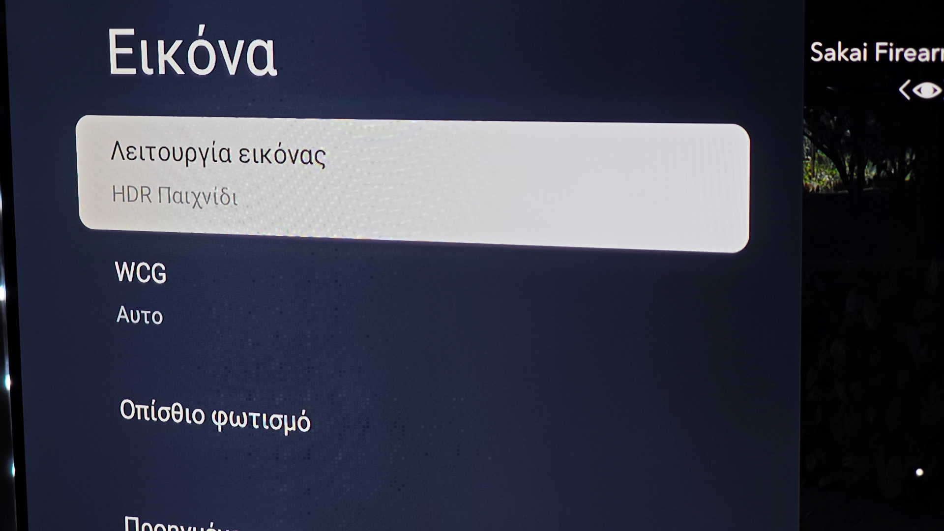 Αφήνοντας στην άκρη αυτό το κομμάτι και επιστρέφοντας στη τηλεόραση, έχουμε να κάνουμε ένα 4K VN –όπως φαίνεται- panel, το οποίο έχει αρκετά καλά μαύρα και μεγάλες γωνίες θέασης, όμως έχει και τα αρνητικά των VN, το γεγονός ότι η γρήγορη κίνηση στην οθόνη εμφανίζει το λεγόμενο smearing. Αυτό φαίνεται περισσότερο όταν κινούνται γρήγορα γράμματα σε μαύρο background, αλλά σε πραγματικές συνθήκες (ταινίες, gaming) δε πρόκειται κανείς να παρατηρήσει κάτι. Παίξαμε αρκετά παιχνίδια στο PS5 με έντονη και γρήγορη δράση (πχ Astrobot) και η εικόνα ήταν πάντα μια χαρά. Αξίζει μάλιστα να αναφέρουμε πως η τηλεόραση μπορεί να είναι στα 60Hz, ωστόσο υποστηρίζει ALLM. Συνδέοντας το PS5, αυτή αντιλήφθηκε άμεσα πως βάλαμε πάνω κονσόλα, αλλάζοντας το όνομα της HDMI 3 σε Playstation5, ενεργοποιώντας το Gaming mode της τηλεόρασης κάθε φορά που βάζαμε για πηγή το PS5! Επιπλέον ενεργοποιήθηκε και το HDR, καθώς η τηλεόραση υποστηρίζει τόσο HDR10 όσο και Dolby Vision. Μη περιμένετε βέβαια εντυπωσιακότερη εικόνα από αυτά, καθώς δεν έχουμε κάποια dimming array, ούτε κάποια μεγάλη φωτεινότητα. Τουλάχιστον το σύστημα δυναμικής αντίθεσης φαίνεται να δουλεύει καλά, το οποίο διαθέσιμο για ενεργοποίηση σε όλες τις περιπτώσεις πλην της αναπαραγωγής Dolby Vision περιεχομένου.