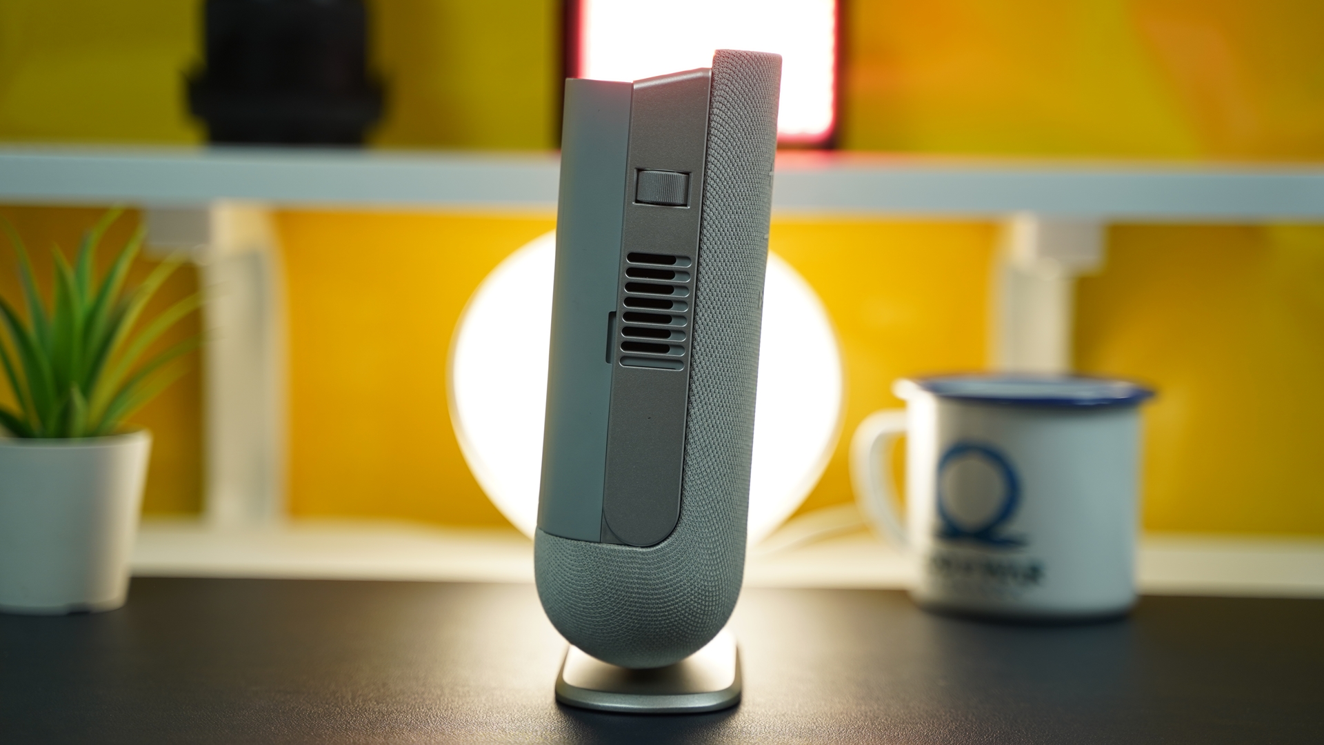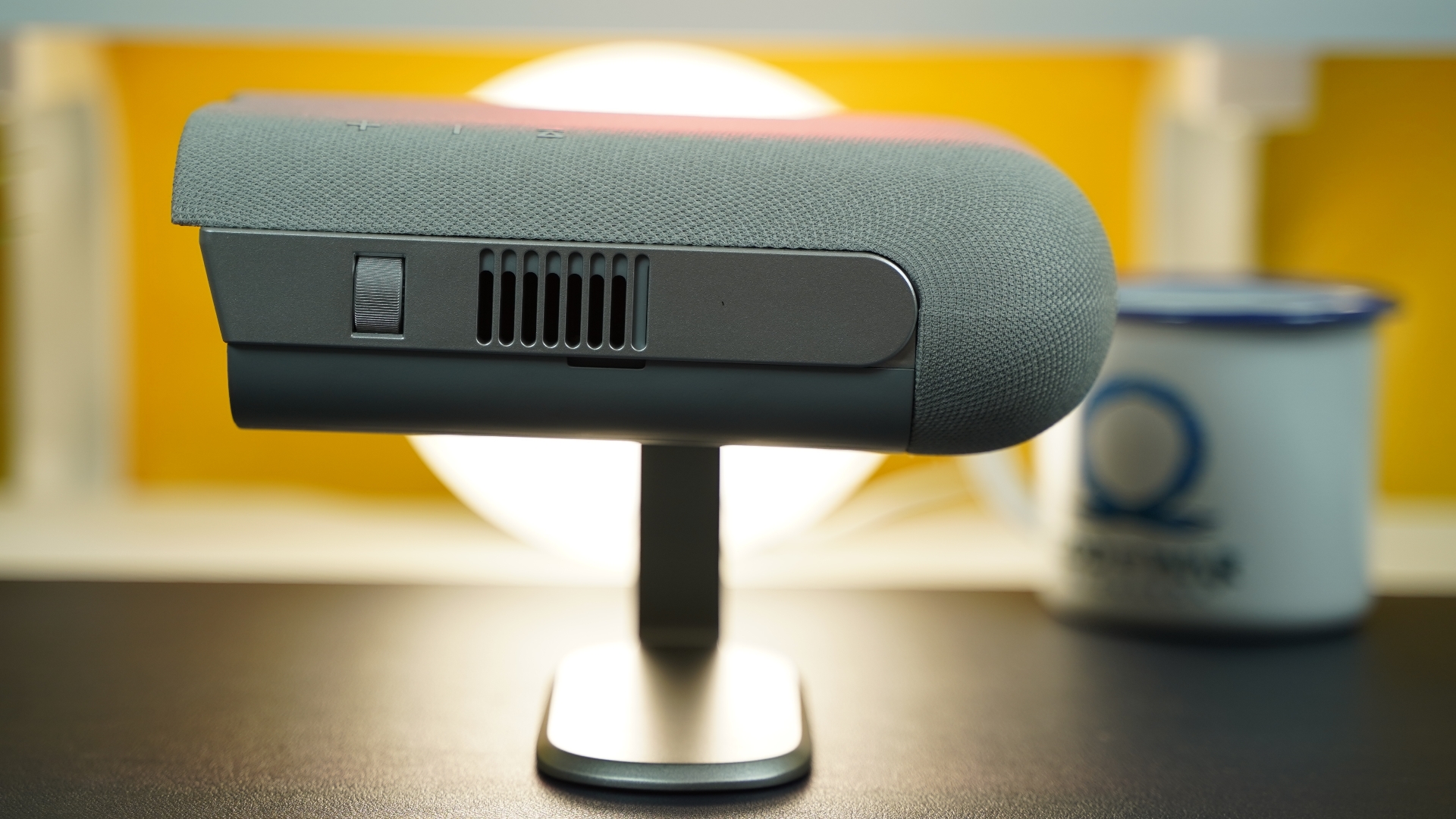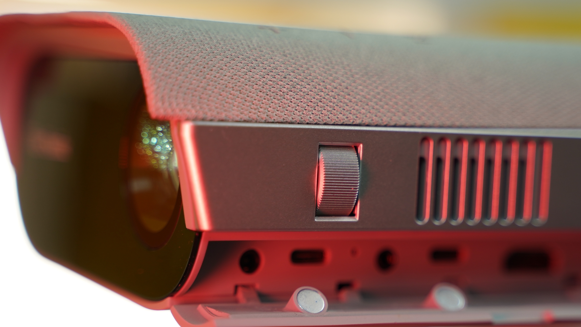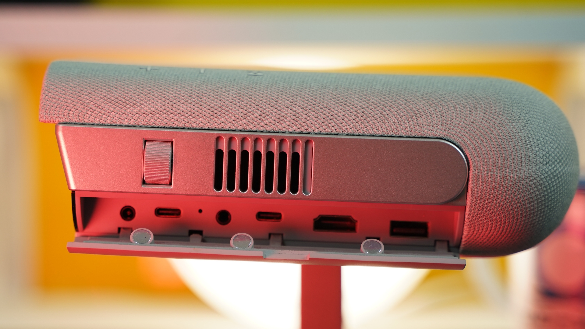 Στην πρόσοψή και αριστερά υπάρχει ο φακός του συστήματος προβολής χωρίς κάποιο κάλυμμα, ο οποίος όμως είναι σταθερός. Αυτό σημαίνει πως δε μπορεί κανείς να μεγαλώσει το μέγεθος της οθόνης προβολής με κανένα άλλο τρόπο, παρά μόνο απομακρύνοντας τον από την οθόνη προβολής (ή το τοίχο). Ο προβολέας έχει through ratio 1.07, το οποίο σημαίνει πως για να πετύχει κανείς τη μέγιστη οθόνη των 150’’ που υποστηρίζει, πρέπει να τοποθετηθεί περίπου 3,52 μέτρα από την οθόνη προβολής, με την ελάχιστη απόσταση να είναι τα 94 εκατοστά, πετυχαίνοντας διαγώνιο 40’’, σύμφωνα με τα επίσημα specs. Πάντως, εμείς τον «κολλήσαμε» σε ένα τοίχο και ακόμα και σε απόσταση της τάξης των 20 εκατοστών, μπορέσαμε να έχουμε εστιασμένη οθόνη διαγωνίου περίπου 8’’. Όχι ότι κάποιος θα τον χρησιμοποιήσει τόσο κοντά, αλλά τουλάχιστον λειτουργεί. Στην αριστερή πλευρά πίσω από ένα καπάκι, έχουμε όλες τις θύρες σύνδεσης και συγκεκριμένα μια HDMI, μια παραδοσιακή USB για σύνδεση δίσκου/usb flash drive, έξοδο ακουστικών, και δυο USB Type-C. Η μια από τις δυο χρησιμοποιείται για τροφοδοσία και μπορεί να αντικαταστήσει πλήρως τον παραδοσιακό φορτιστή που περιλαμβάνεται στη συσκευασία. Η άλλη μπορεί να χρησιμοποιηθεί σαν είσοδος εικόνας από κάποιο τηλέφωνο/tablet ή κάποια κονσόλα όπως το Nintendo Switch ή το Steam Deck.