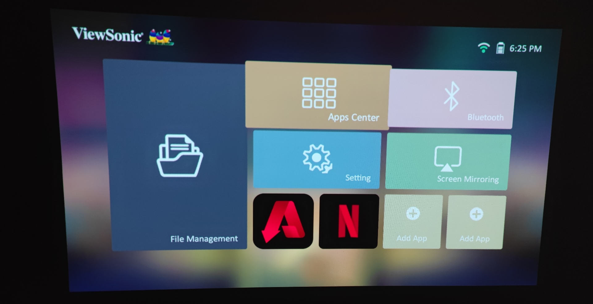Τουλάχιστον κατά την αναπαραγωγή εικόνας, πατώντας το πλήκτρο «γρανάζι», εμφανίζονται ρυθμίσεις εικόνας και ήχου, με τις πρώτες να είναι αρκετές μεταξύ των οποίων και ρύθμιση χρωμάτων ανάλογα με το χρώμα του τοίχο στον οποίο πιθανόν να προβάλουμε. Συνεχίζοντας με το λειτουργικό, αυτό προσφέρει πρόσβαση στο Aptoid app store, το οποίο δεν Play Store και έχει κάποιες λίγες εφαρμογές για να εγκαταστήσει κανείς, κάτι που χρειάζεται εφόσον ο χρήστης θέλει να δει περιεχόμενο Netflix.