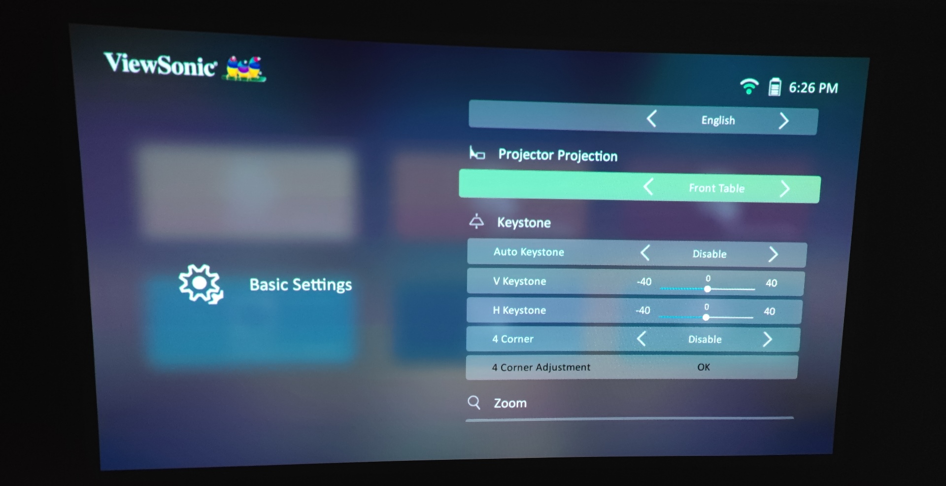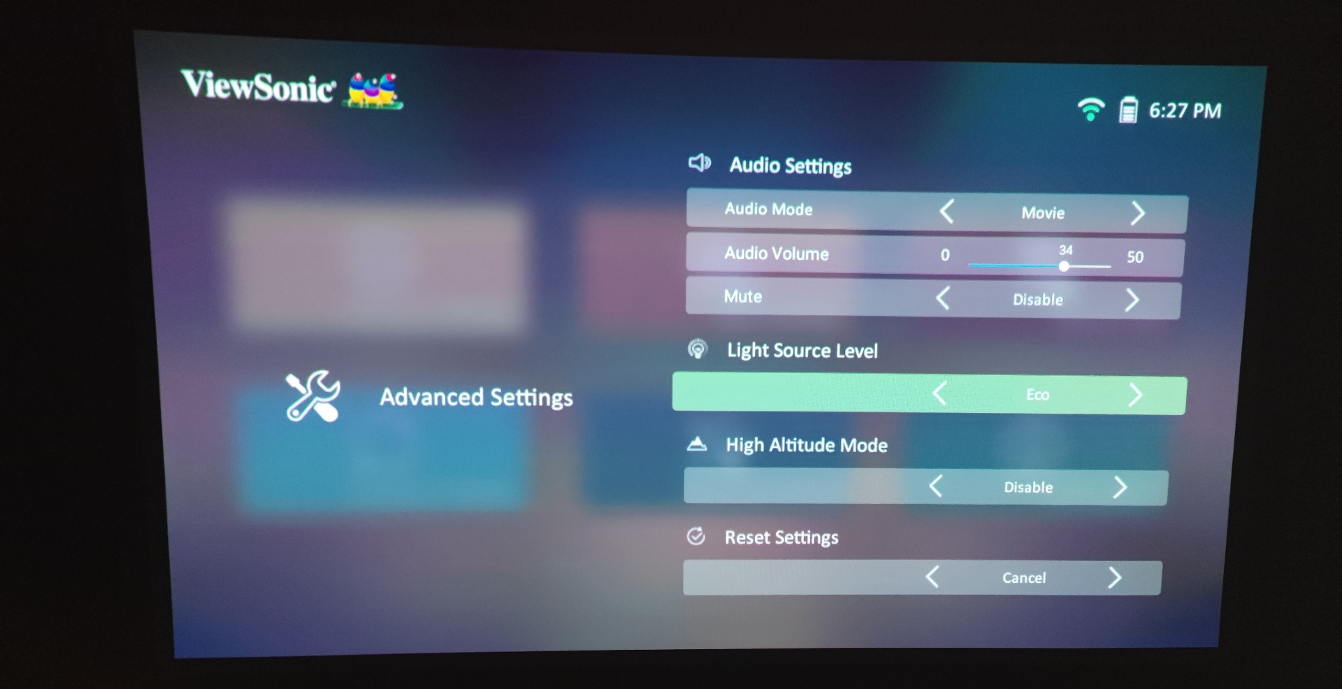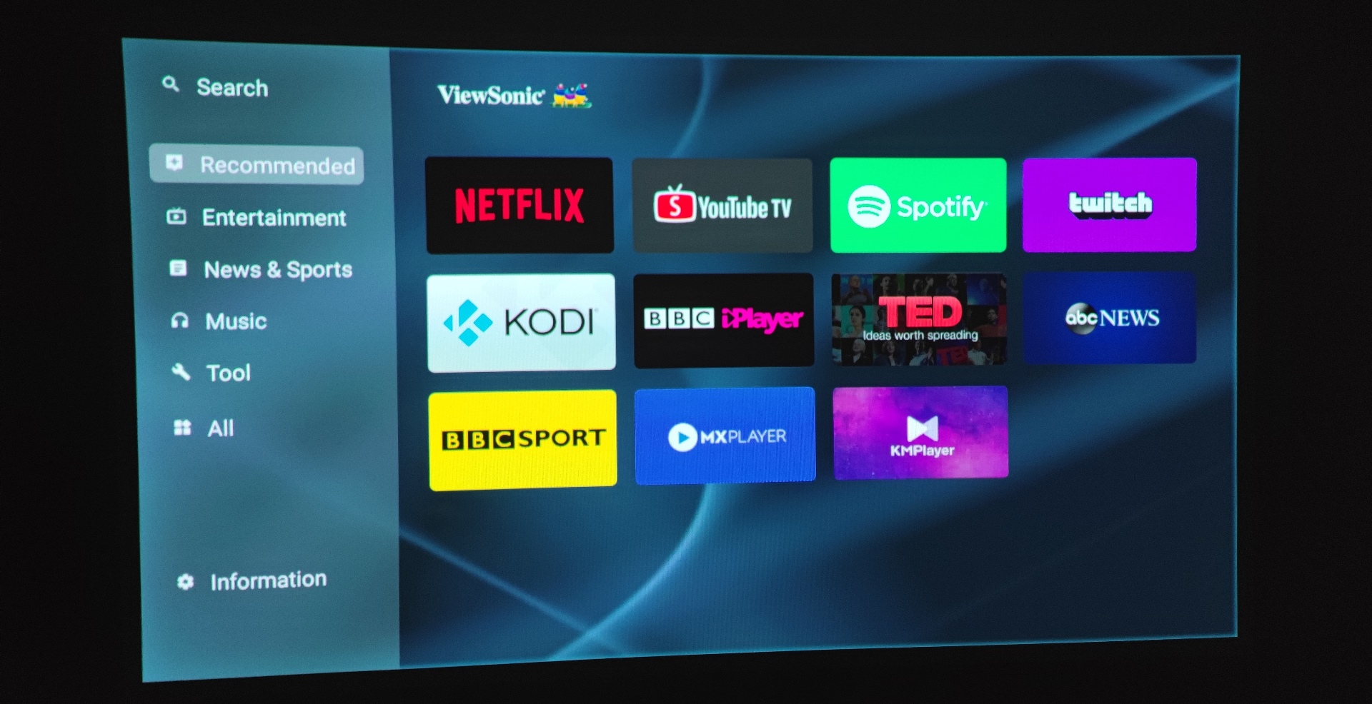 Όσον αφορά τώρα στην εικόνα του Viewsonic M1 Pro, αυτός λειτουργεί σε ανάλυση 1280x720, το γνωστό HD. Έχει καλά χρώματα είναι αρκετά sharp, ειδικά όταν έχουμε ρυθμίσει σωστά την εστίαση. Όμως δε παύει να λειτουργεί σε σχετικά χαμηλή ανάλυση, κάτι που γίνεται περισσότερο αντιληπτό όταν μεγαλώνει η εικόνα, ειδικά στις γραμματοσειρές των υποτίτλων. Εκκινώντας το προβολέα, ξεκινάει αυτόματα και το λειτουργικό του προβολέα που βασίζεται στο Android αλλά δεν είναι επίσημο Android TV. Χρειάζεται κάποιος χρόνος μέχρι να δούμε εικόνα και επιπλέον κάποια δευτερόλεπτα για να ξεκινήσει το λειτουργικό.