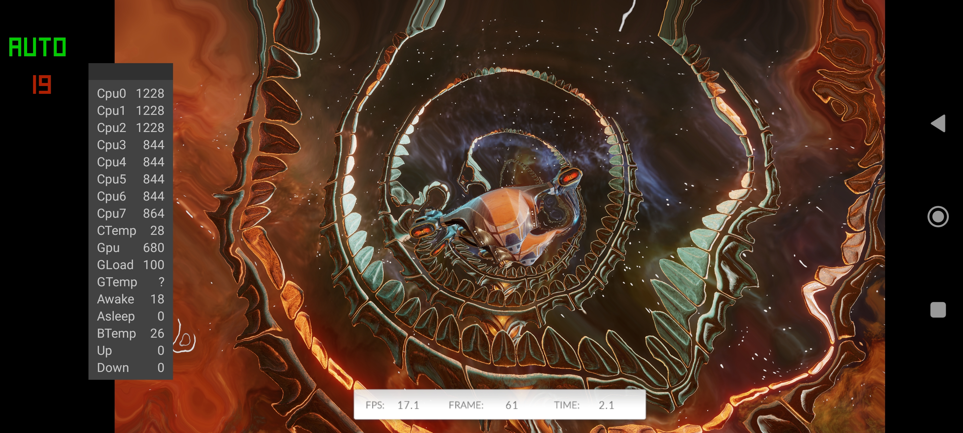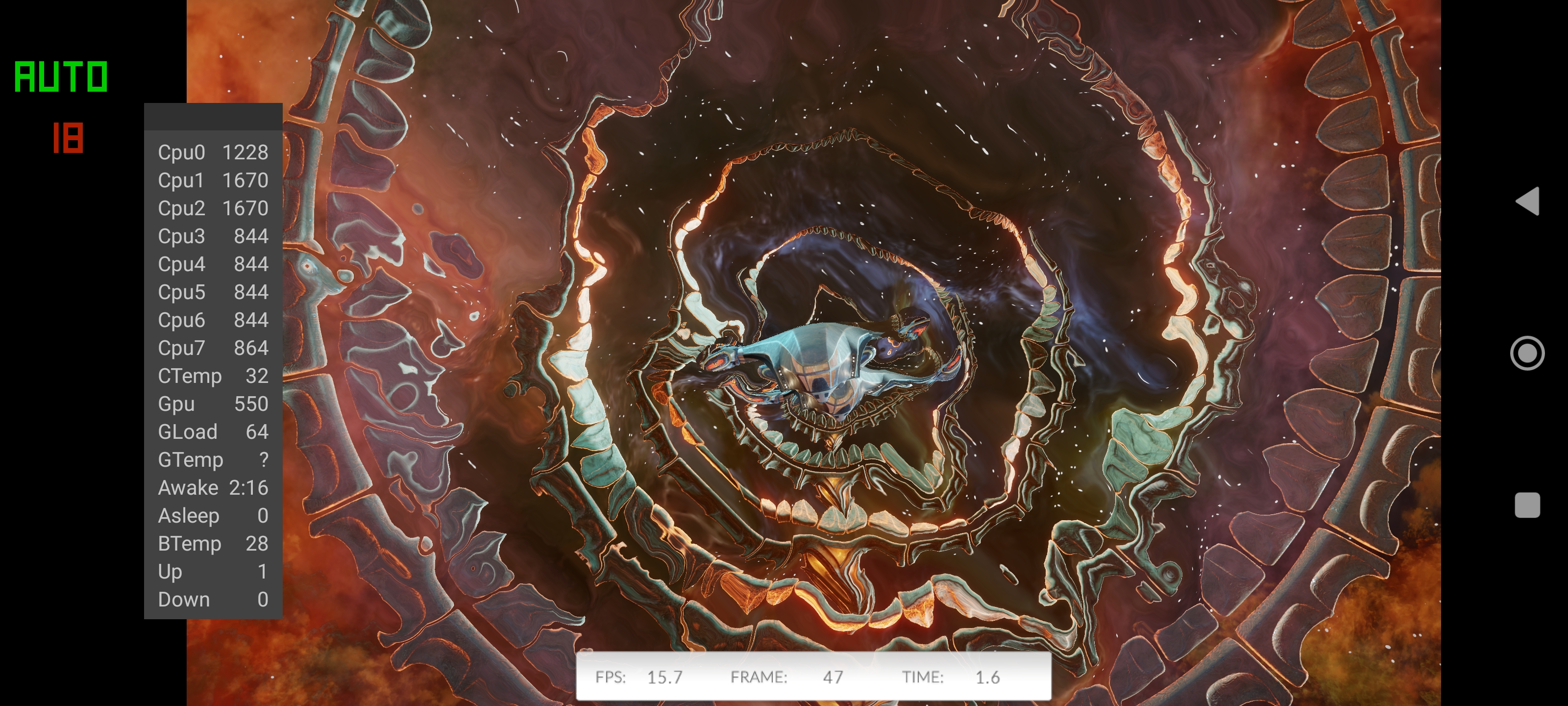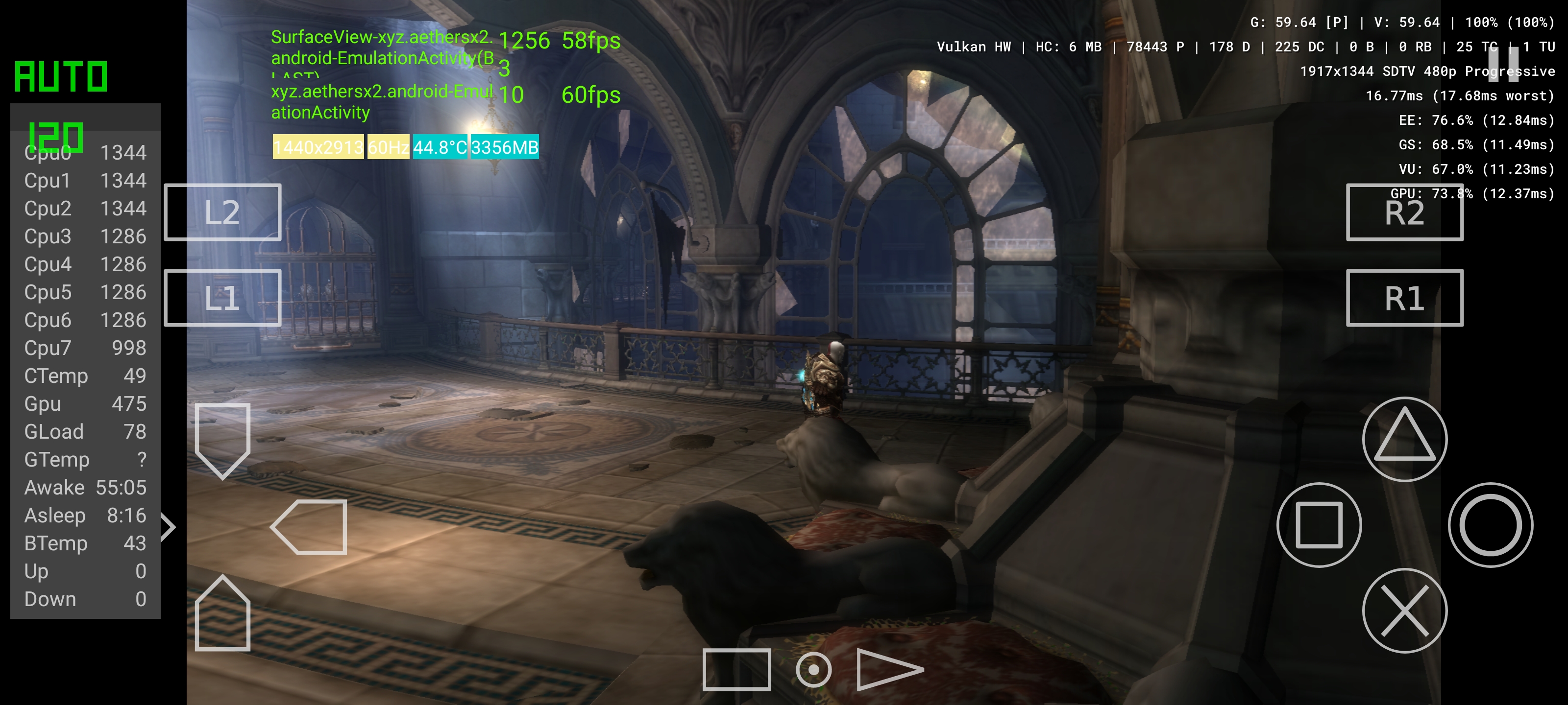 Η μέγιστη συχνότητα λειτουργίας της GPU σε όλα τα games, με εξαίρεση τα benchmark, δεν ανεβαίνει πάνω από τα 475Mhz. Αυτό βοηθάει το τηλέφωνο να παραμένει λειτουργικό για ώρες και η θερμοκρασία του SoC δεν ανεβαίνει πάνω από τους 45 βαθμούς Κελσίου (εδώ το God of War 2 στον AetherSX2 μετά από 1 ώρα που τρέχει).