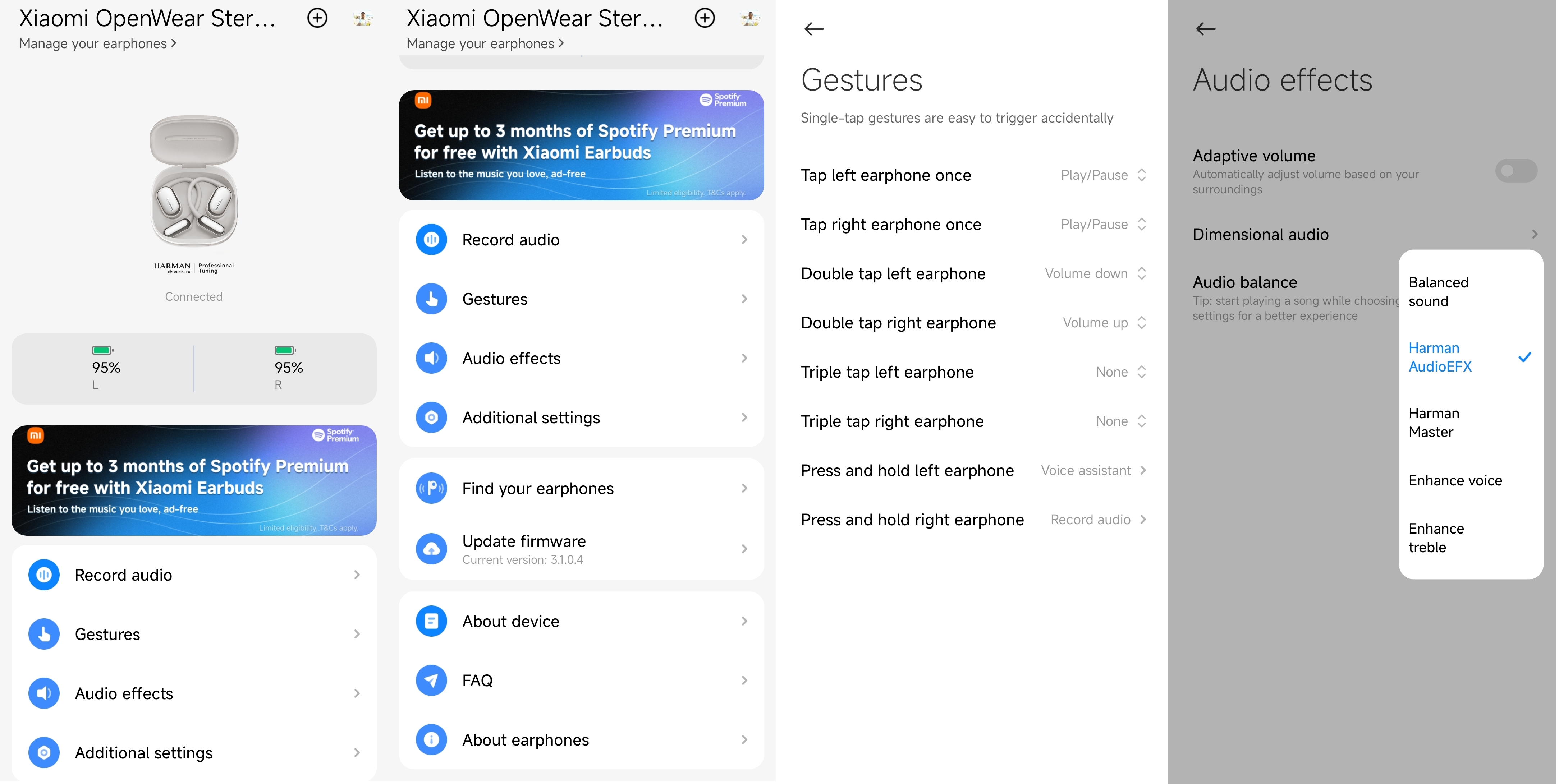 Τα δοκιμάσαμε κάνοντας βόλτες με τα πόδια, με ποδήλατο ή και ηλεκτρικό πατίνι, με μουσική να παίζει σε μέτρια ένταση και σε κανένα σημείο δε νοιώσαμε ότι δεν είχαμε –ακουστική- επαφή με το περιβάλλον. Μπορείς κανείς να ακούει τα podcast του, να σηκώνει τηλεφωνικές κλήσεις, να ακούει μουσική, να παρακολουθεί βίντεο και ταινίες, και ταυτόχρονα να συνομιλεί με άλλους γύρω του, χωρίς να χρειαστεί να κάνει pause, ή να αφαιρέσει τα ακουστικά. Βέβαια, σε περιβάλλον με πολύ φασαρία (πχ στο δρόμο), η αλήθεια είναι πως ο ήχος του καλύπτεται και δεν ακούμε τόσο καλά. Να σημειώσουμε επίσης πως τα ίδια τα ακουστικά δεν έχουν αισθητήρα που αντιλαμβάνεται αν τα φοράμε ή όχι, με αποτέλεσμα όταν ακούμε πχ μουσική και τα αφαιρέσουμε, αυτή θα συνεχίζει να παίζει μέχρι να πατήσουμε pause. Από εκεί και πέρα, τα ίδια τα ακουστικά διαθέτουν ενσωματωμένη δυνατότητα ελέγχου των λειτουργιών τους μέσω αφής. Μέσα από την εφαρμογή μπορούμε να ρυθμίσουμε τα gestures, με τη ρύθμιση της έντασης να είναι ένα από αυτά. Μια ακόμα λειτουργία που ενσωματώνουν είναι αυτή της εγγραφής ήχου από τα μικρόφωνα τους. Μπορούμε να καταγράψουμε ότι ακούγεται γύρω μας, αλλά ακόμα και τηλεφωνικές κλήσεις, όπως τις «ακούνε» τα μικρόφωνα. Στη συνέχεια, μέσα από το app, οι εγγραφές αυτές μεταφέρονται στο κινητό. Μπορούμε ακόμα να ηχογραφήσουμε ακόμα και όταν τα ακουστικά είναι μέσα στη θήκη τους και αυτή είναι κλειστή, με τριπλό πάτημα του πλήκτρου που έχει η θήκη.