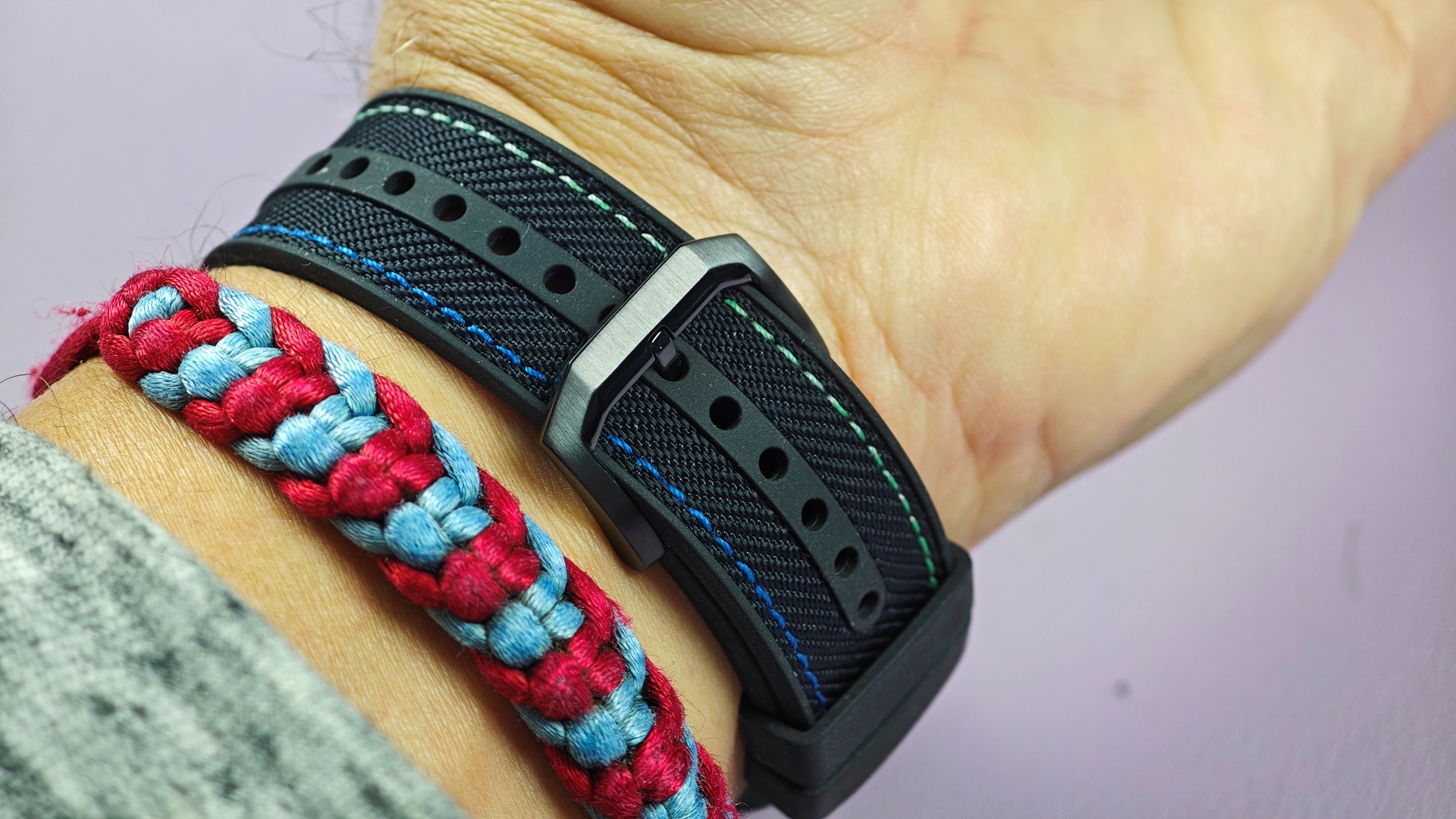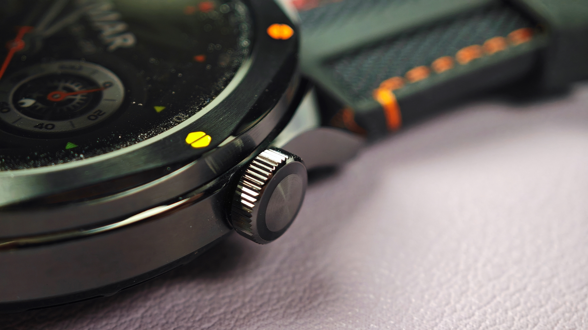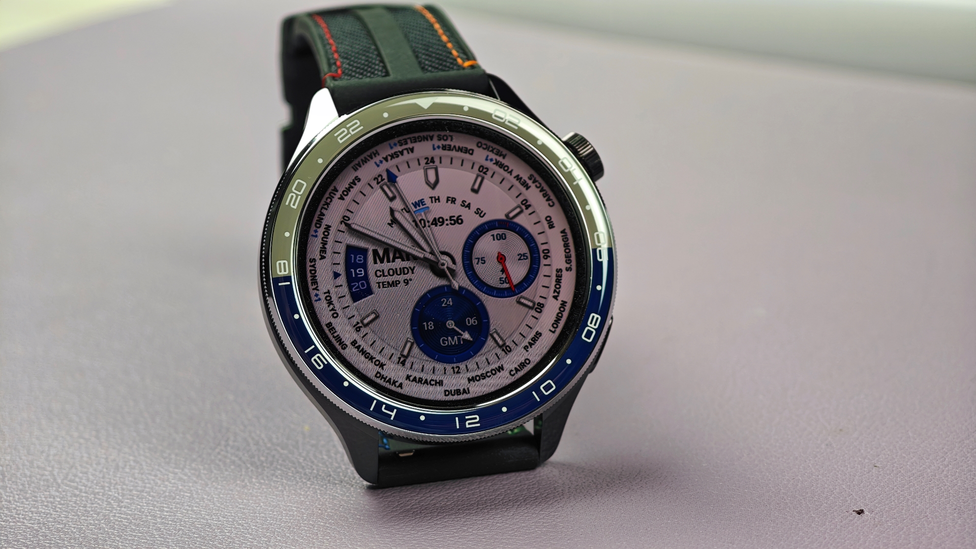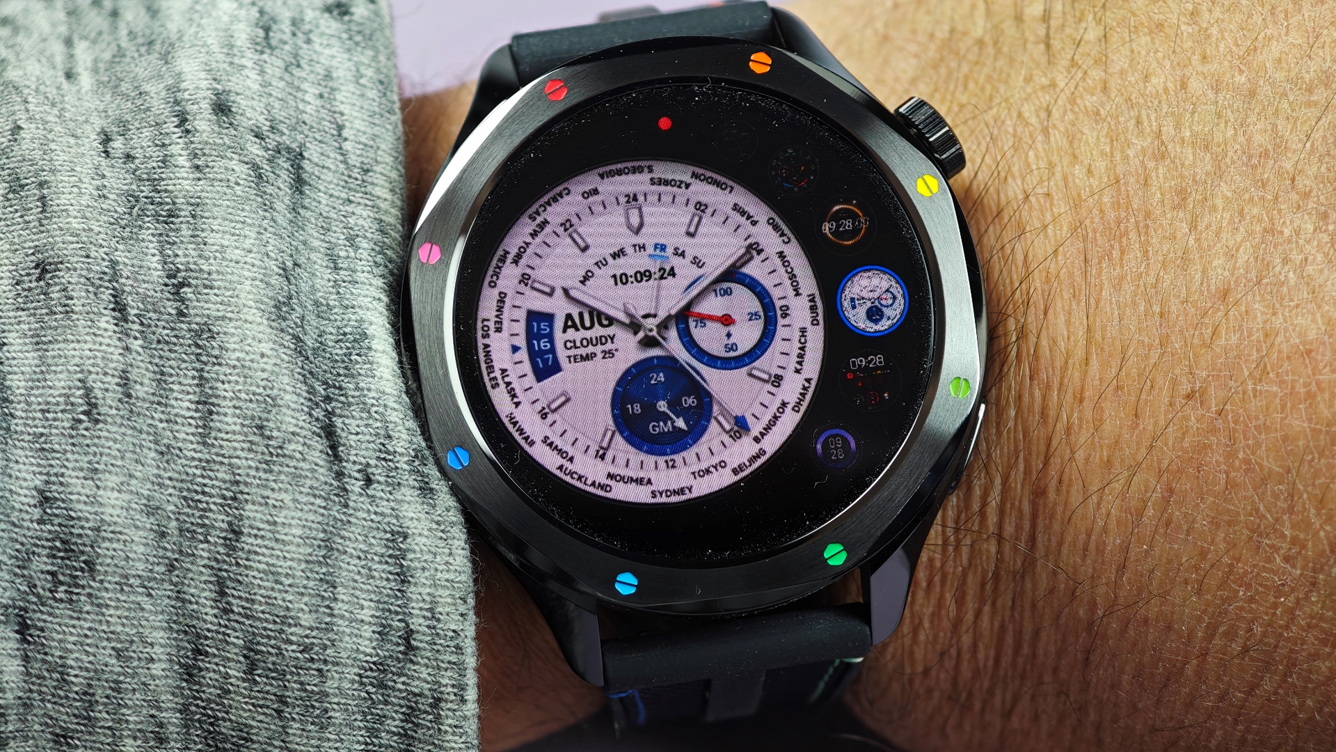 Κάθε μια από αυτές συνοδεύεται από το αντίστοιχο λουράκι για να έχει κανείς ταιριαστό αποτέλεσμα. Για παράδειγμα εμείς έχουμε τη δίχρωμη στεφάνη (μπλε το κάτω μισό, ασημί το πάνω μισό) με το λουράκι να είναι αντίστοιχα δίχρωμο, μπλε το ένα κομμάτι και γκρι το άλλο. Η διαδικασία αλλαγής είναι πανεύκολη, καθώς περιστρέφοντας αντίστροφα από τους δείκτες τη στεφάνη αυτή ξεβιδώνει και αντίστοιχα τοποθετώντας μια άλλη με βάση τους οδηγούς που έχει στο κάτω μέρος της και περιστρέφοντας προς τα δεξιά αυτή ασφαλίζει στη θέση της. Το εντυπωσιακότερο όλων είναι ότι με το που θα τοποθετήσουμε μια από τις διαθέσιμες στεφάνες, αλλάζει αυτόματα και το watch face σε αυτό που ταιριάζει στη συγκεκριμένη στεφάνη!