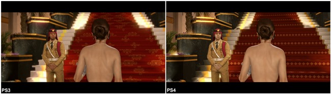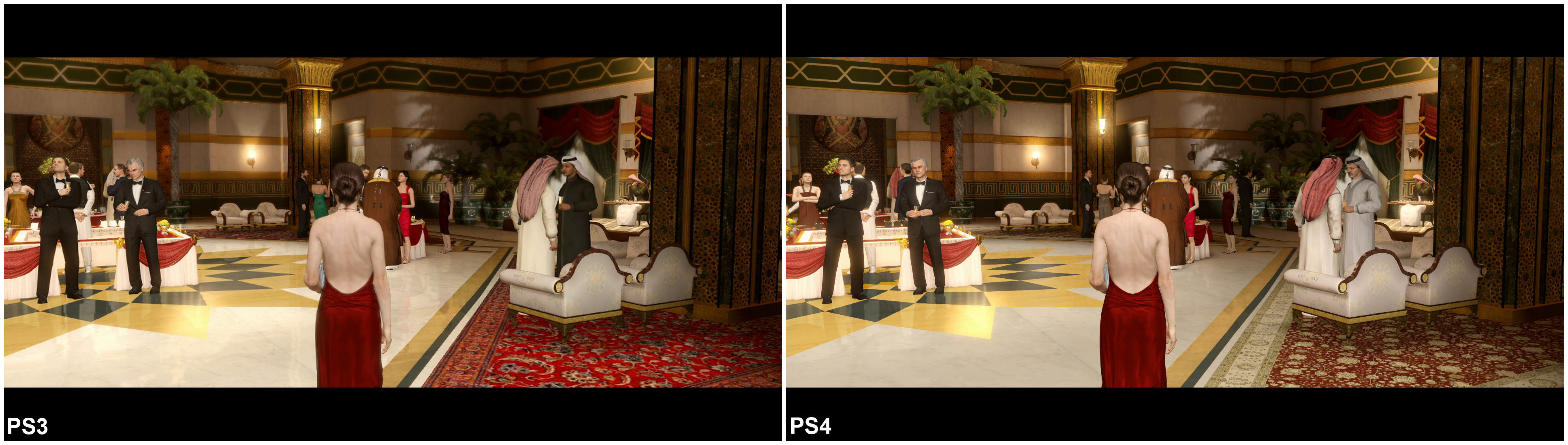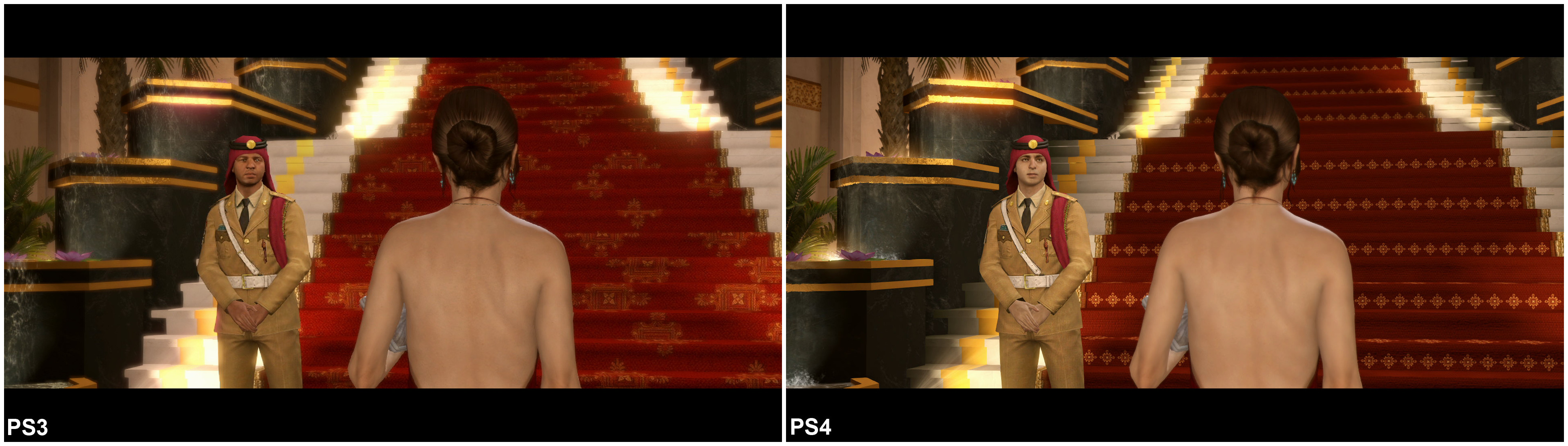 Αυτήν τη φορά ορισμένα texture maps αντικαθίστανται από άλλα, υψηλότερης ανάλυσης, στο PS4. Το σχέδιο μπορεί να διαφέρει δραματικά μεταξύ των maps, όπως βλέπουμε στα χαλιά και τις ταπετσαρίες της πρεσβείας.